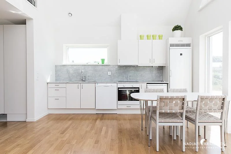 En öppen planlösningen mellan kök och allrum där man känner sig hemma med myshörna och rymlighet. I allrummet är det över 5 meter från golv till nock, stora gavelfönster som suddar ut gränsen mellan ute och inne med en härlig känsla av rymd, vilket gör detta till en underbar sällskapsyta.