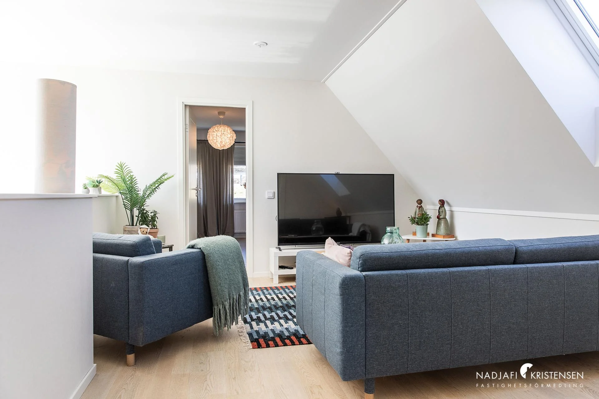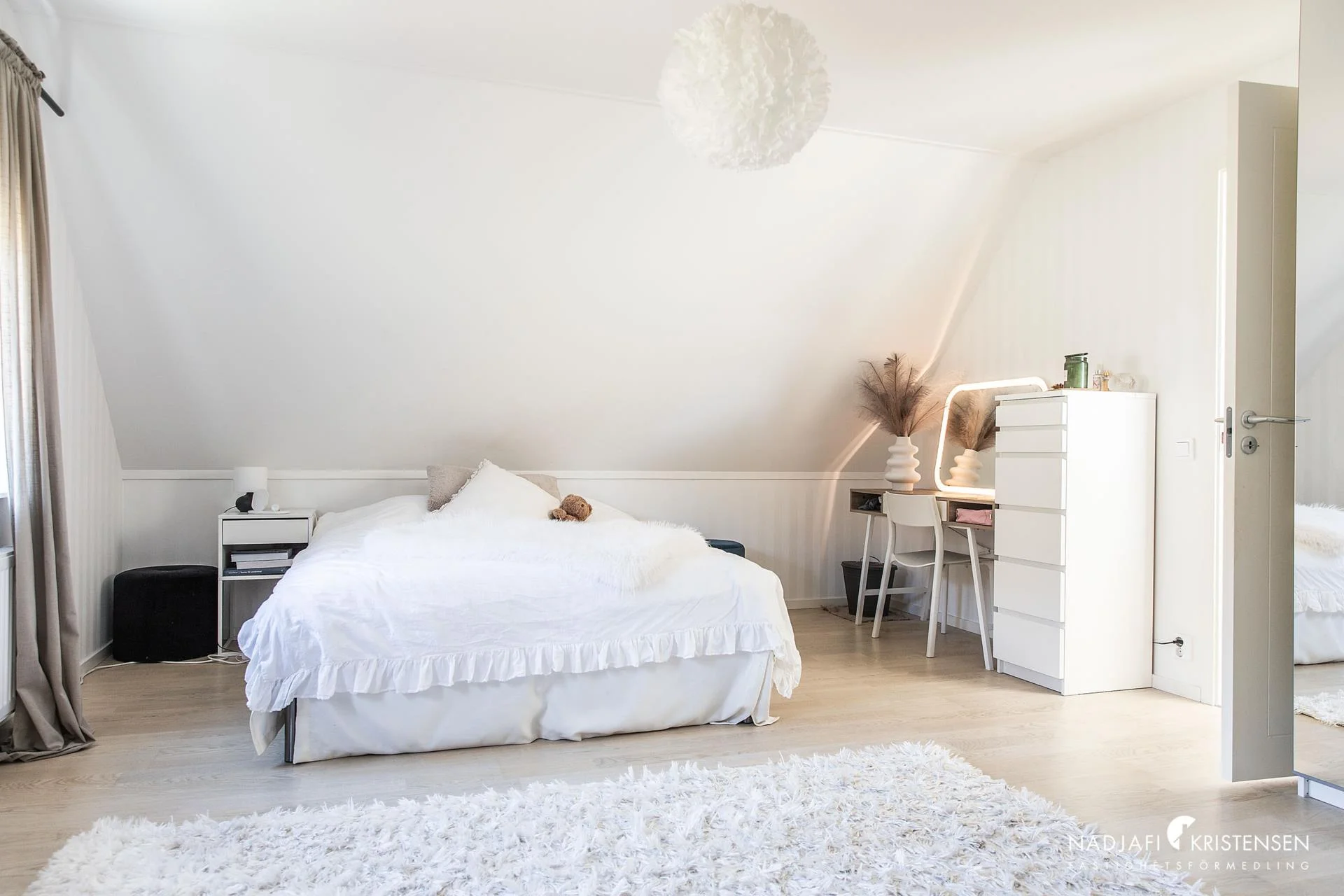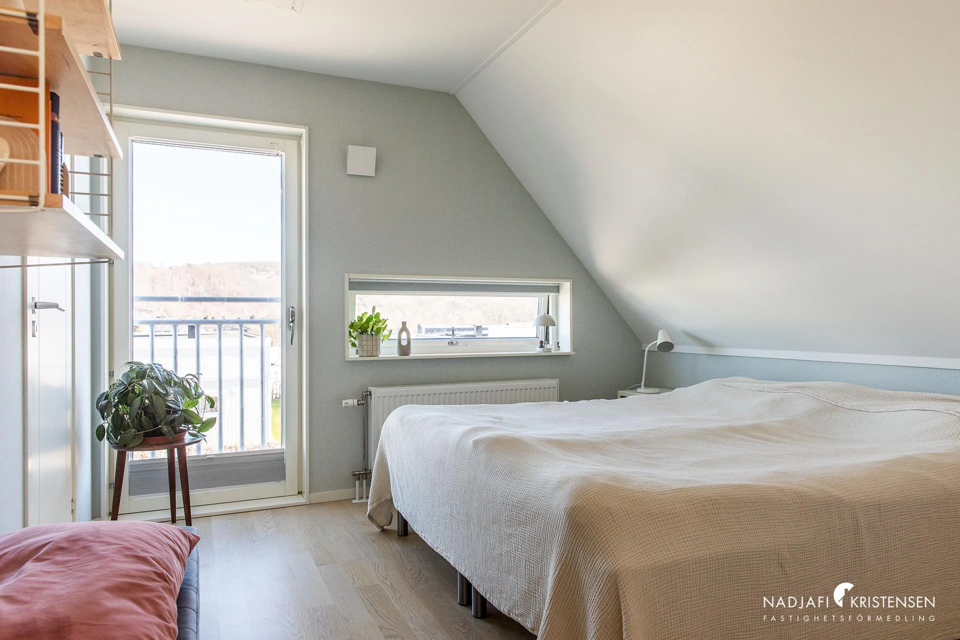 Övre plan välkomnar med ett inbjudande allrum med generöst ljusflöde från takfönster och öppningen mellan våningsplanen förstärker rymden. Sovrummen är placerade på vardera sida om allrummet och erbjuder generösa ytor. Det ena sovrummet har direkt access till klädkammare samt utgång till balkong, medan det andra med enkelhet kan delas av för att skapa ytterligare ett sovrum vid behov. På det övre planet finns även ett badrum med badkar.