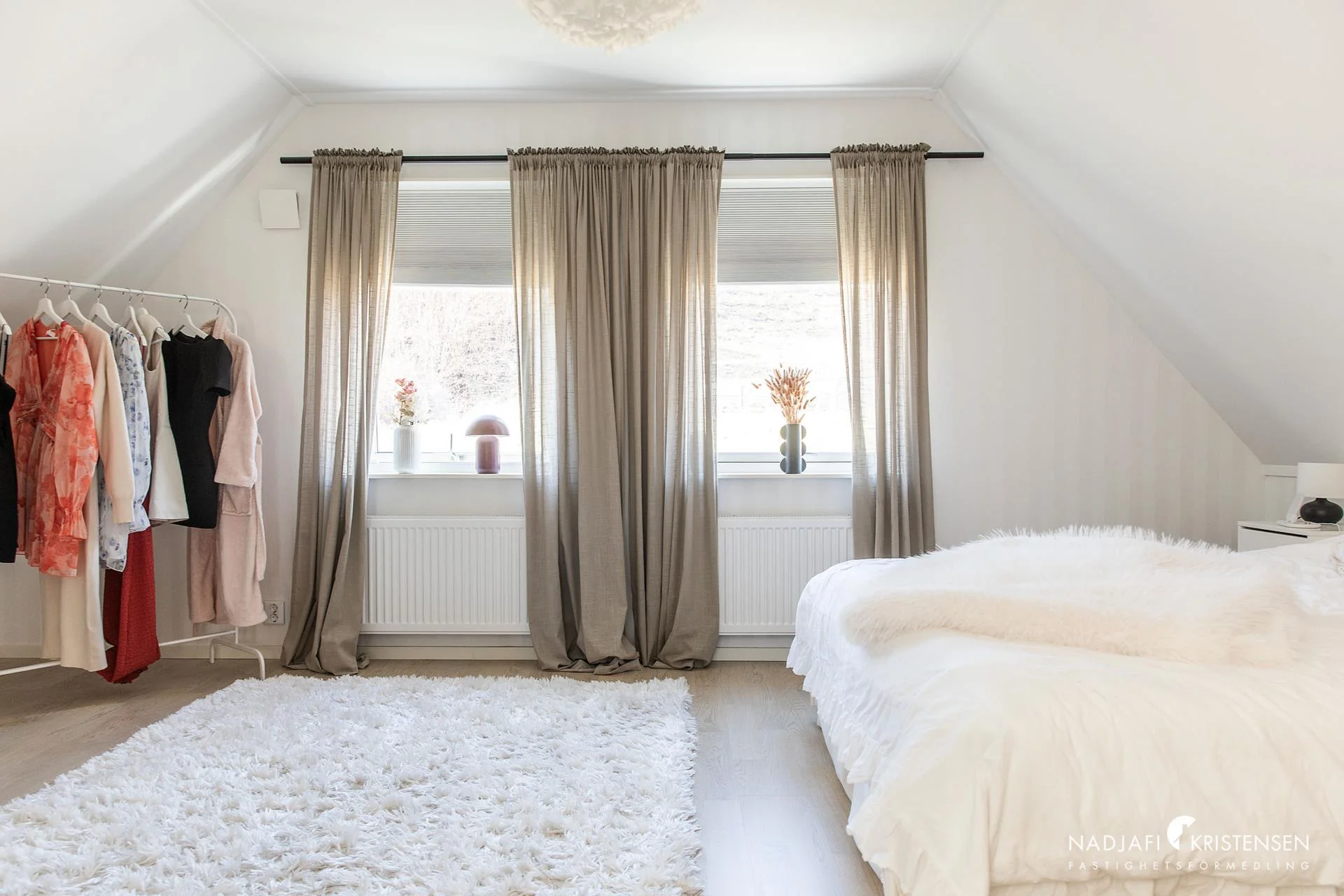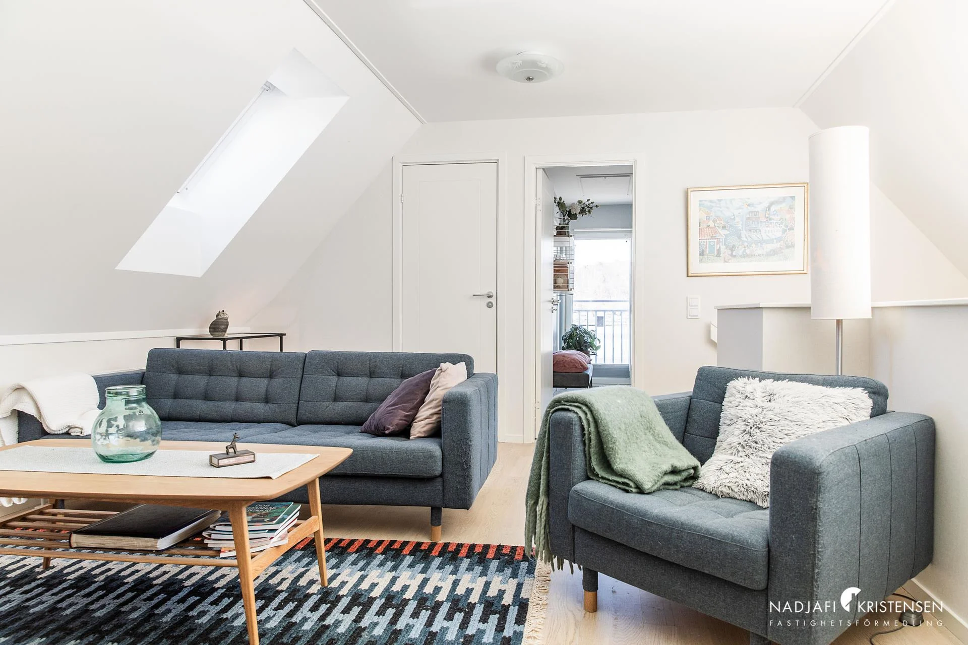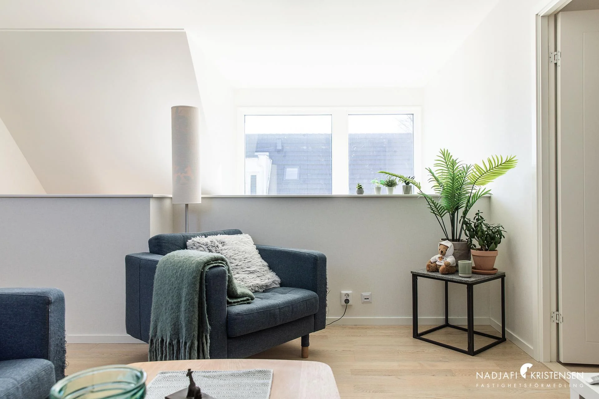 Övre plan välkomnar med ett inbjudande allrum med generöst ljusflöde från takfönster och öppningen mellan våningsplanen förstärker rymden. Sovrummen är placerade på vardera sida om allrummet och erbjuder generösa ytor. Det ena sovrummet har direkt access till klädkammare samt utgång till balkong, medan det andra med enkelhet kan delas av för att skapa ytterligare ett sovrum vid behov. På det övre planet finns även ett badrum med badkar.