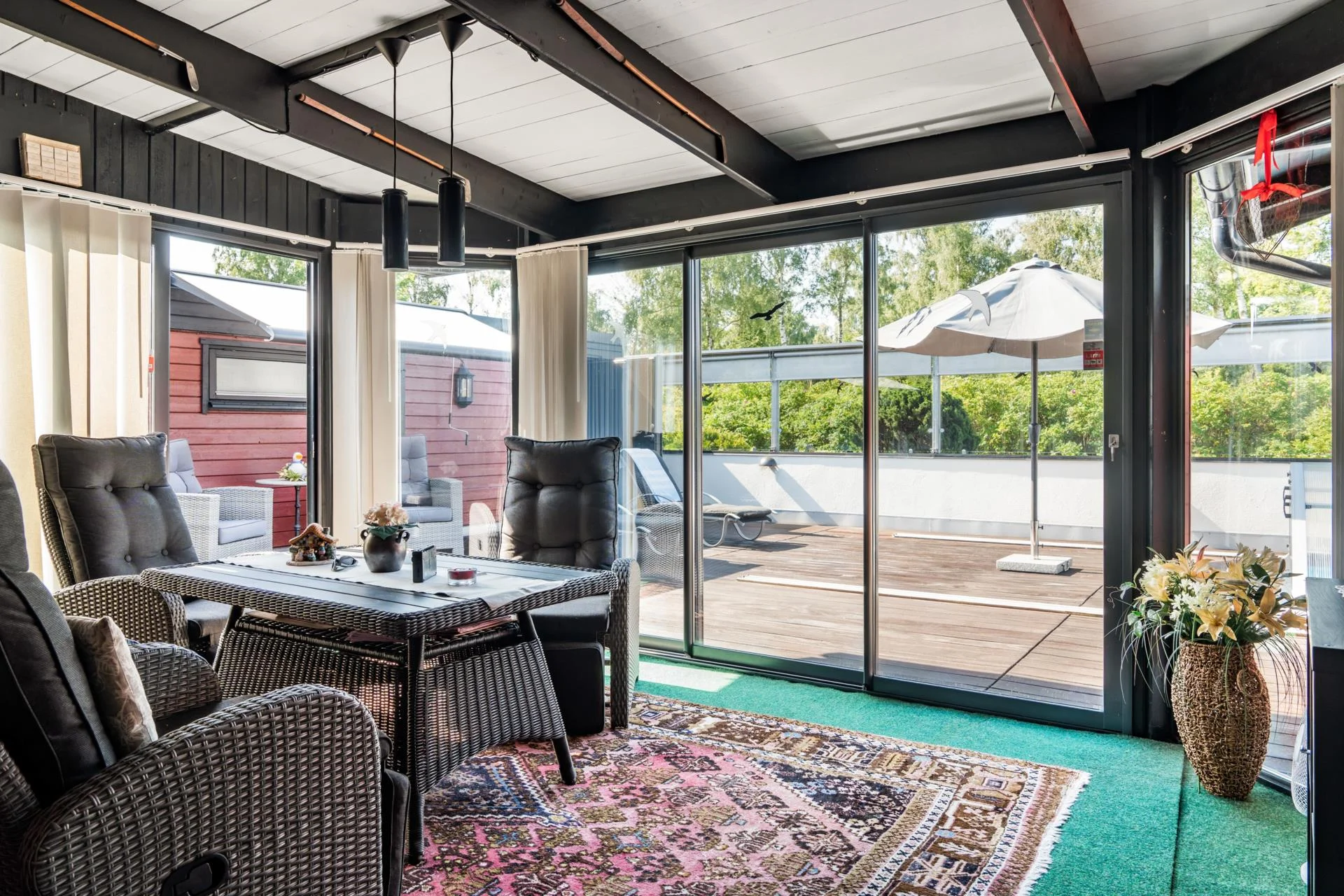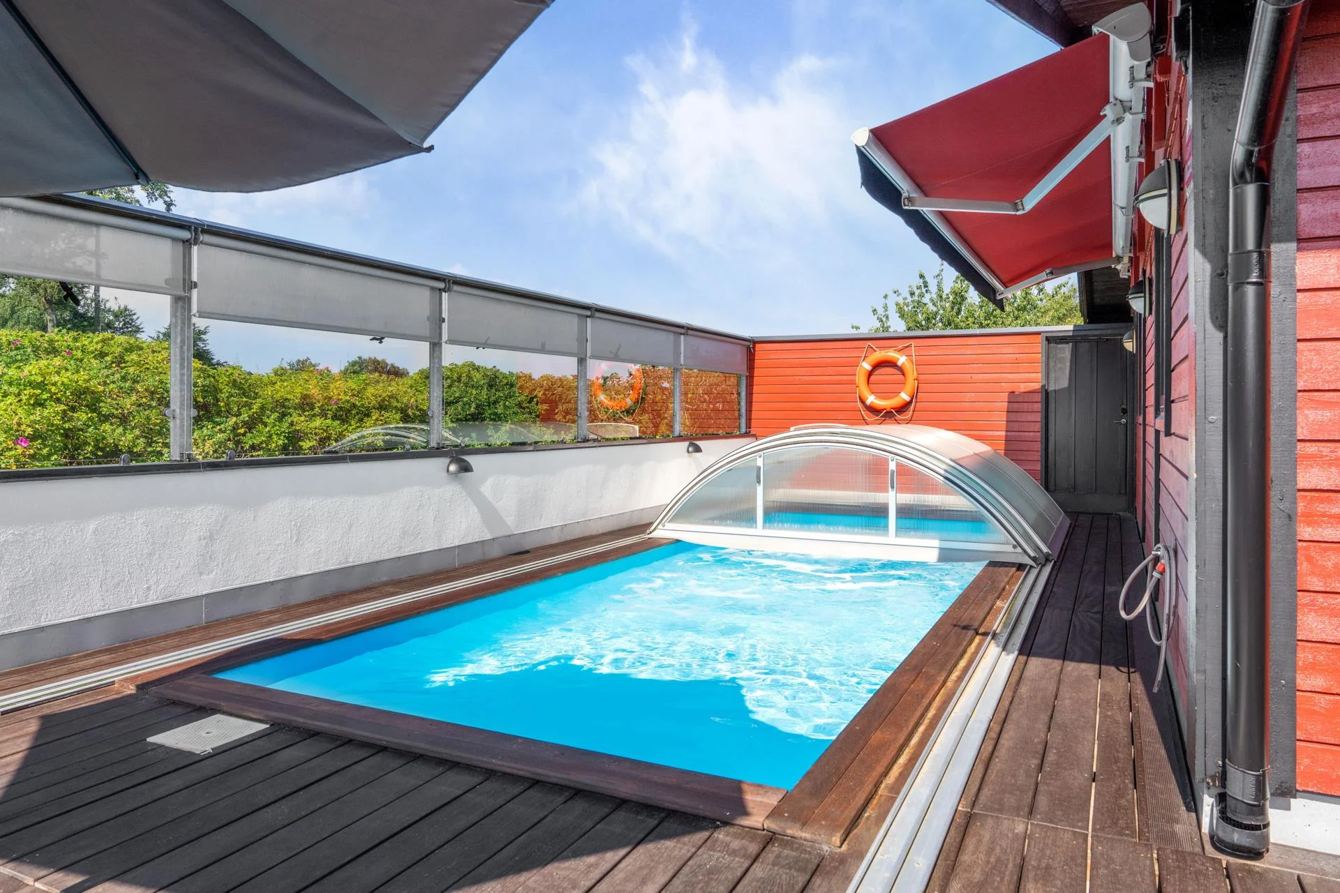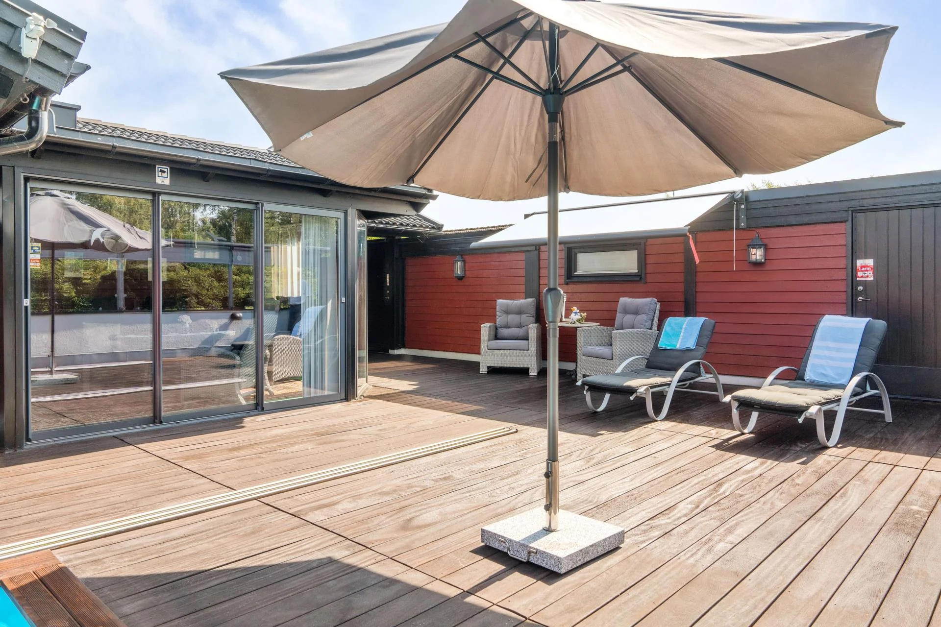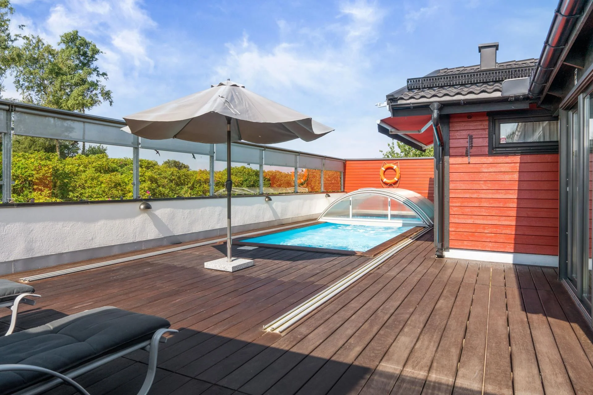 Det kompletta köket, som öppnar upp mot ett charmigt uterum, är en dröm för alla matlagningsentusiaster. Från uterummet kliver du ut på en stor altan i vackert adelträ, som leder vidare till en imponerande uteplats. Här kan du njuta av sommarens soliga dagar vid poolen med jetstream eller koppla av i uterummet i söderläge.