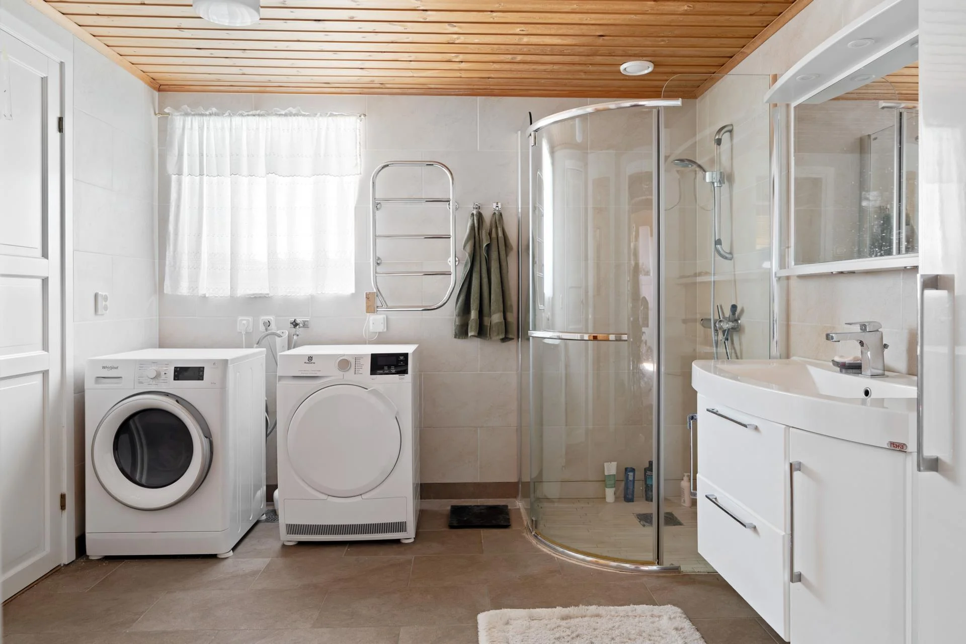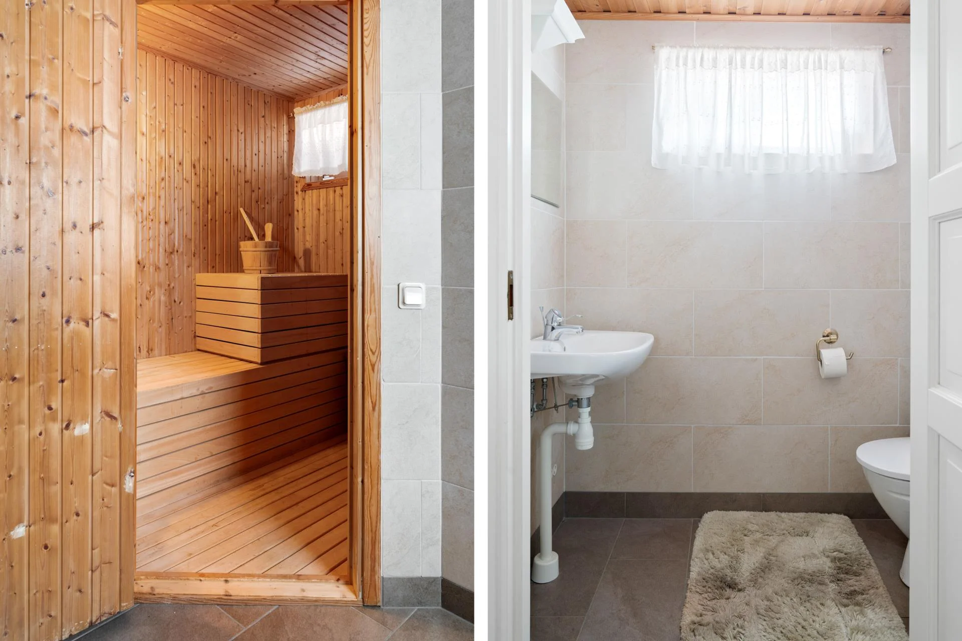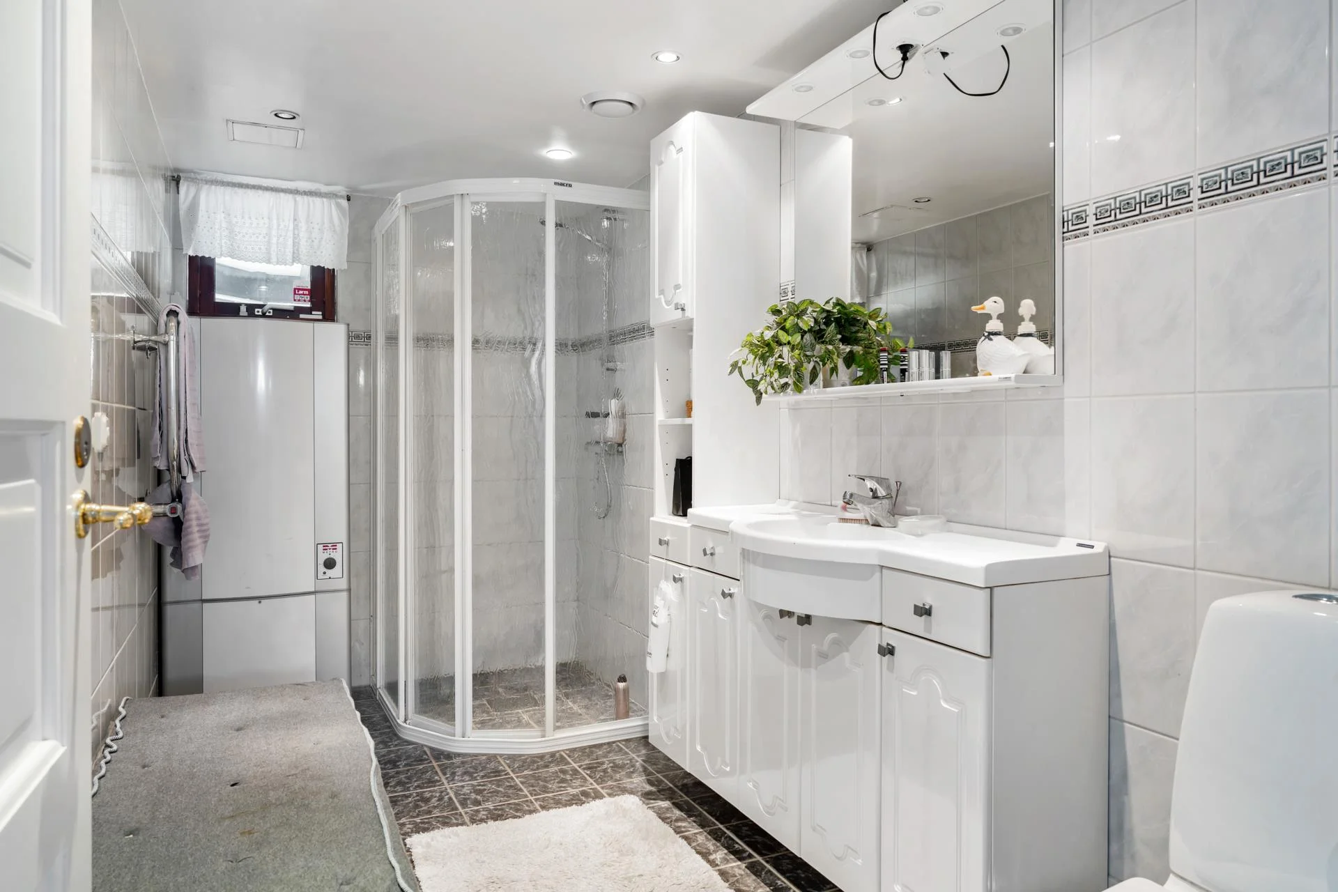 Bostaden har två rymliga och helkaklade badrum, varav det ena är utrustat med tvättmöjligheter och en bastu för avkopplande stunder. För förvaring finns både ett varmförråd och ett varmgarage med gott om utrymme för alla dina behov.