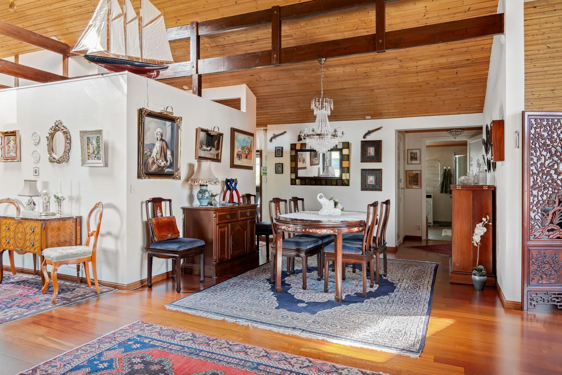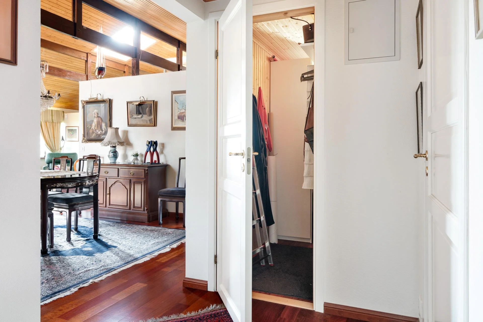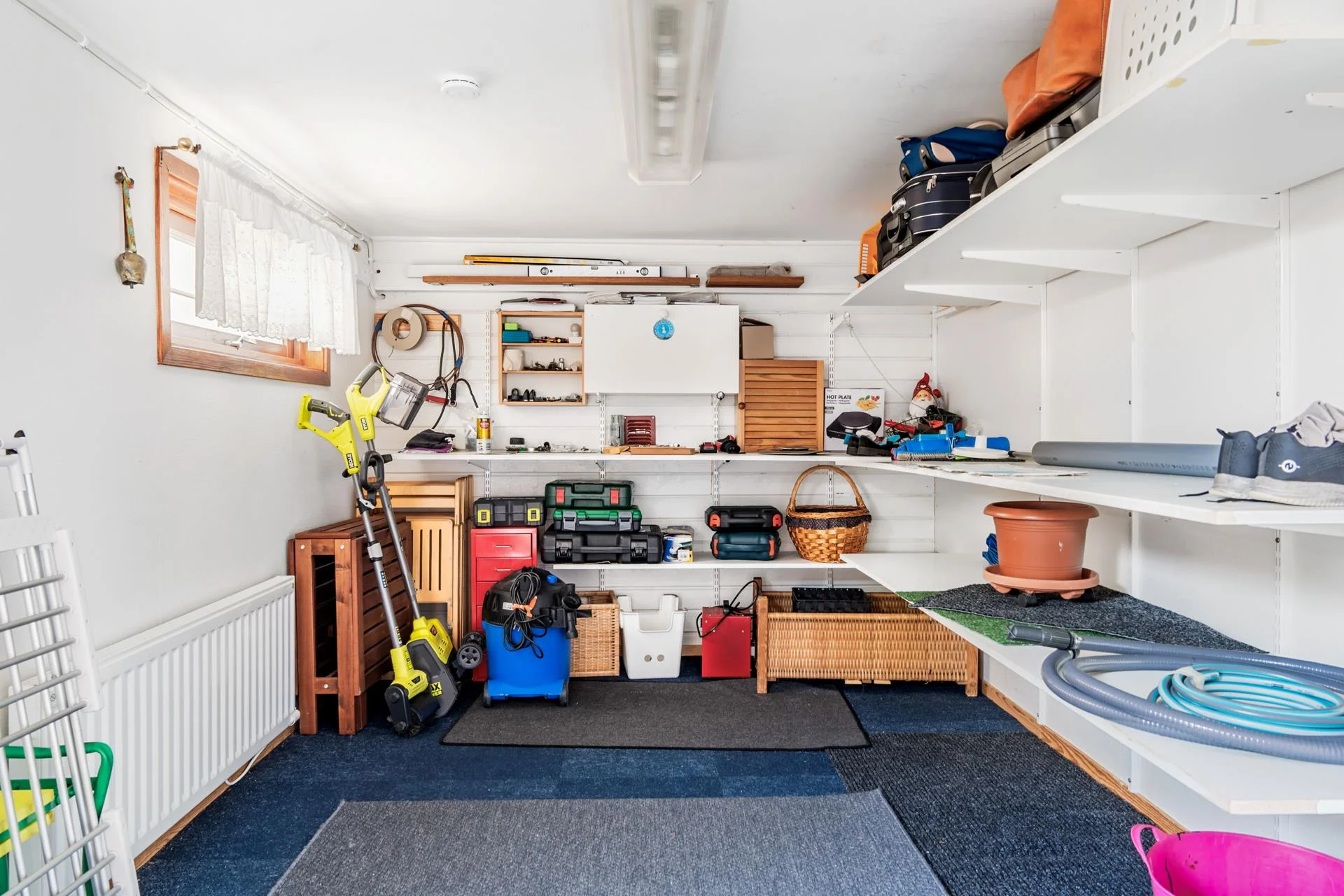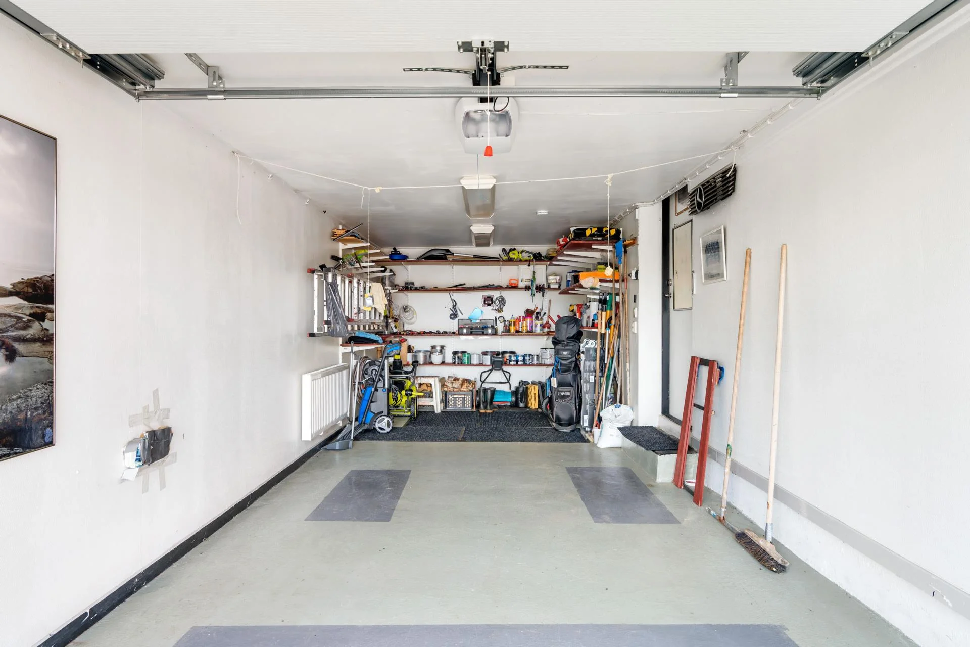 Bostaden har två rymliga och helkaklade badrum, varav det ena är utrustat med tvättmöjligheter och en bastu för avkopplande stunder. För förvaring finns både ett varmförråd och ett varmgarage med gott om utrymme för alla dina behov.
