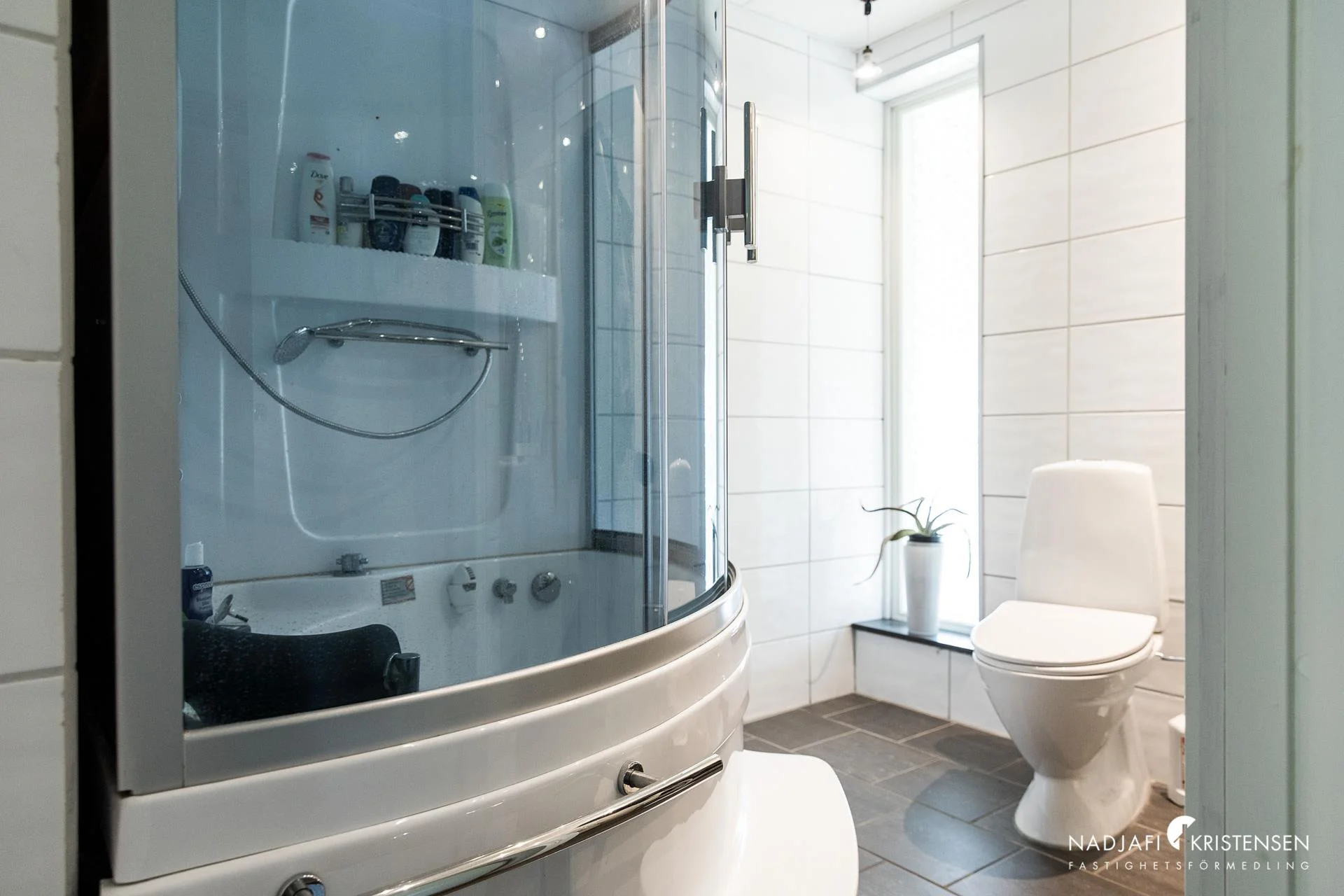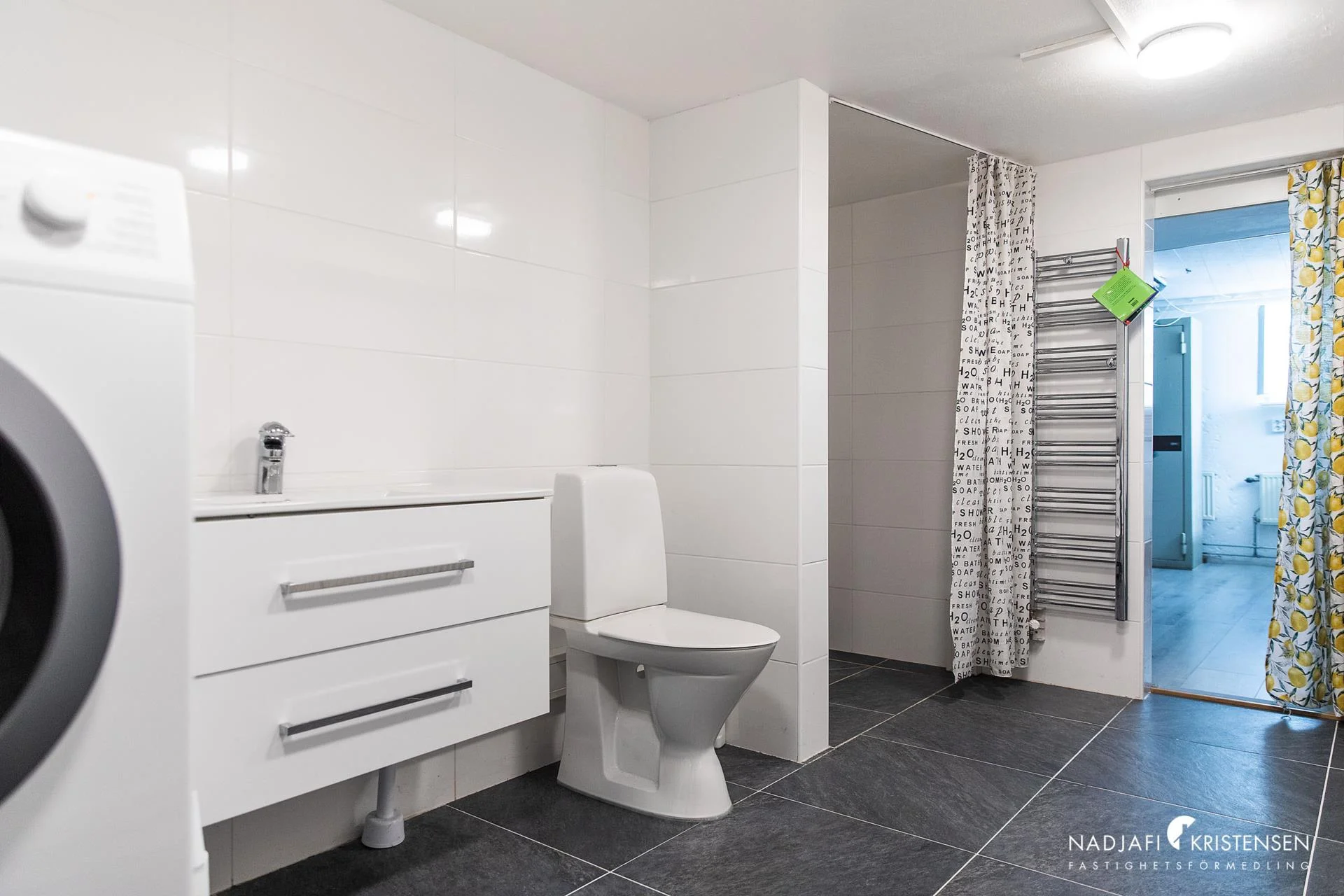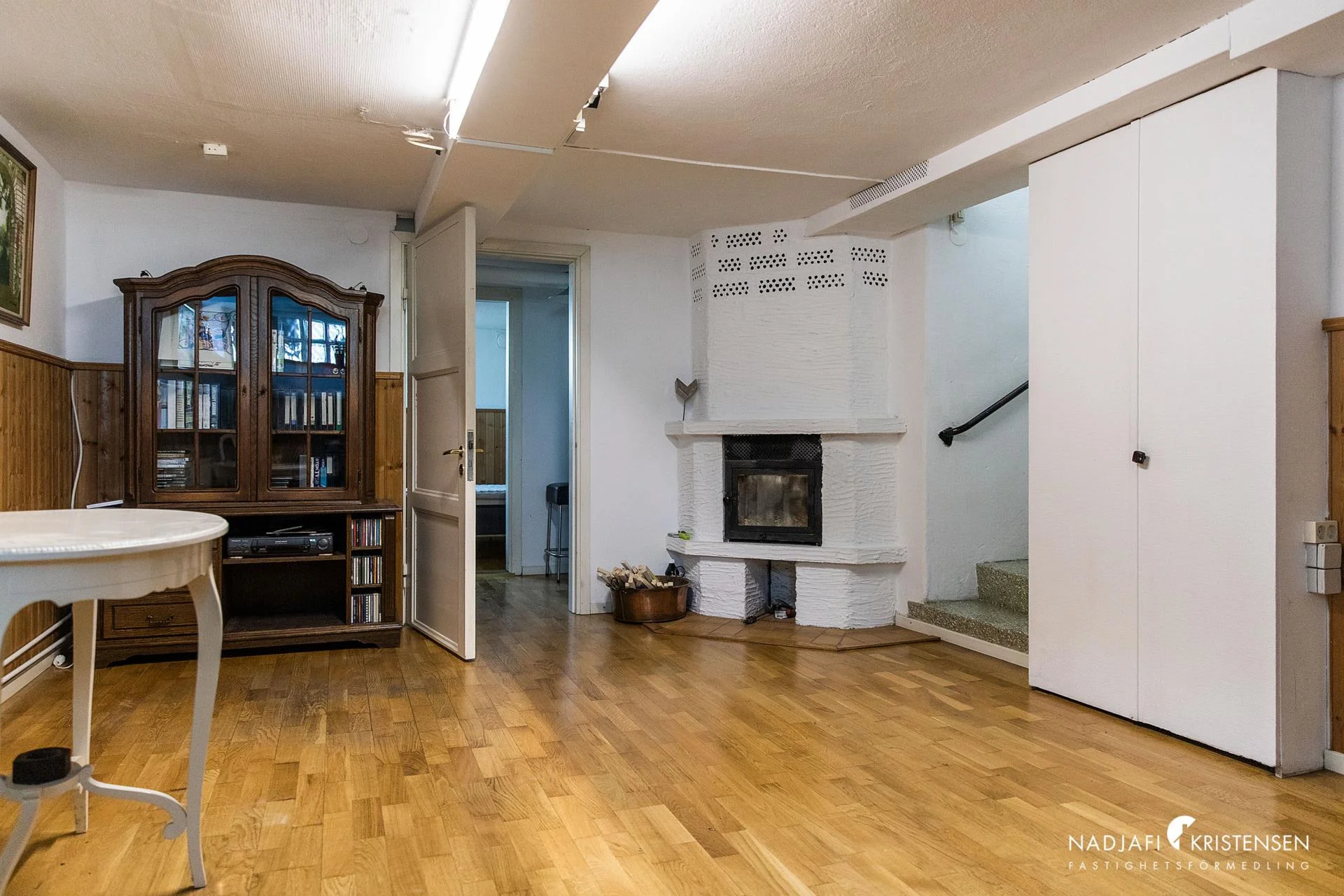 Källarplanet är inrett och inrymmer, badrum/tvättstuga, gillestuga med braskamin, sovrum och förråd.