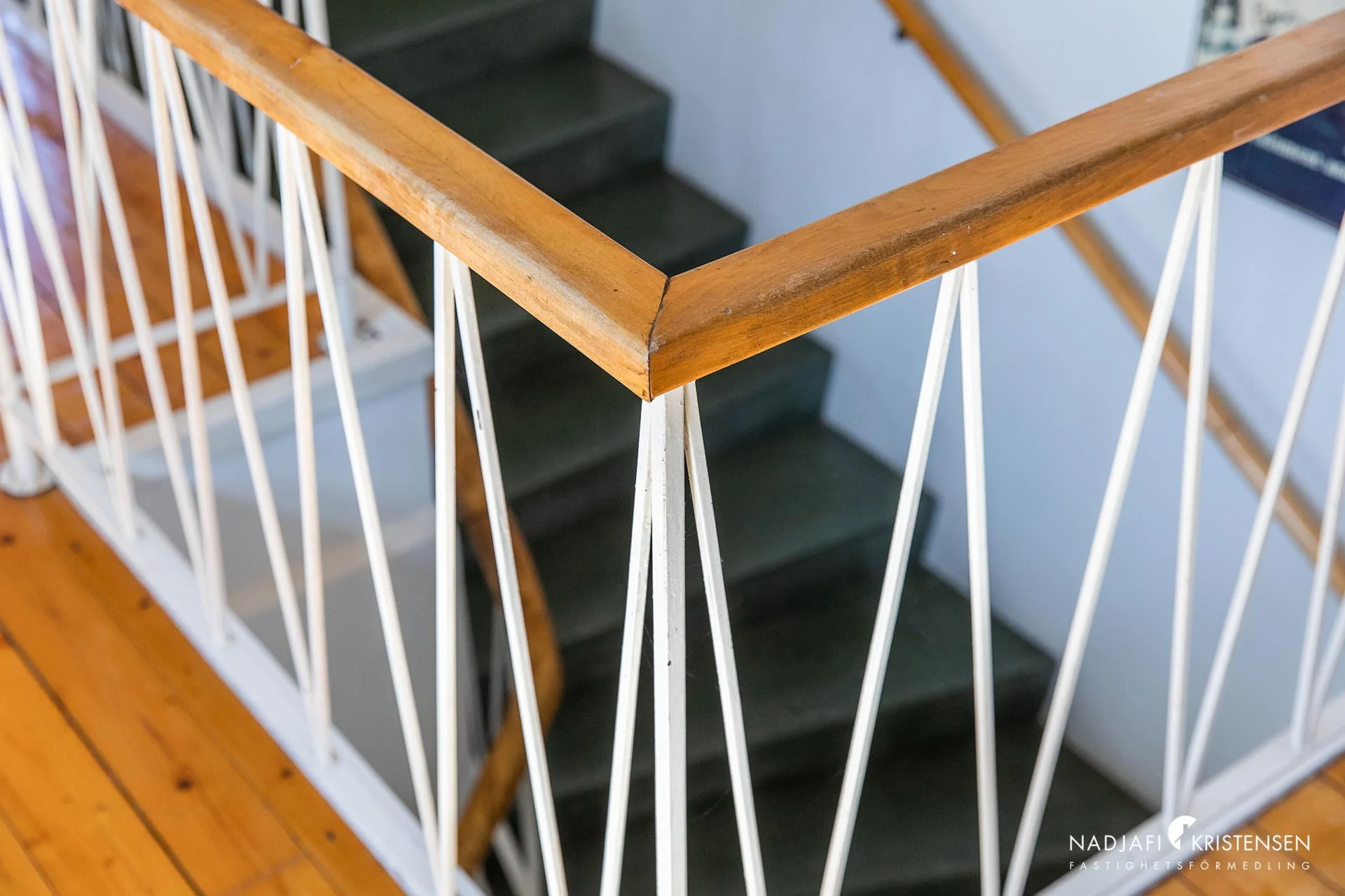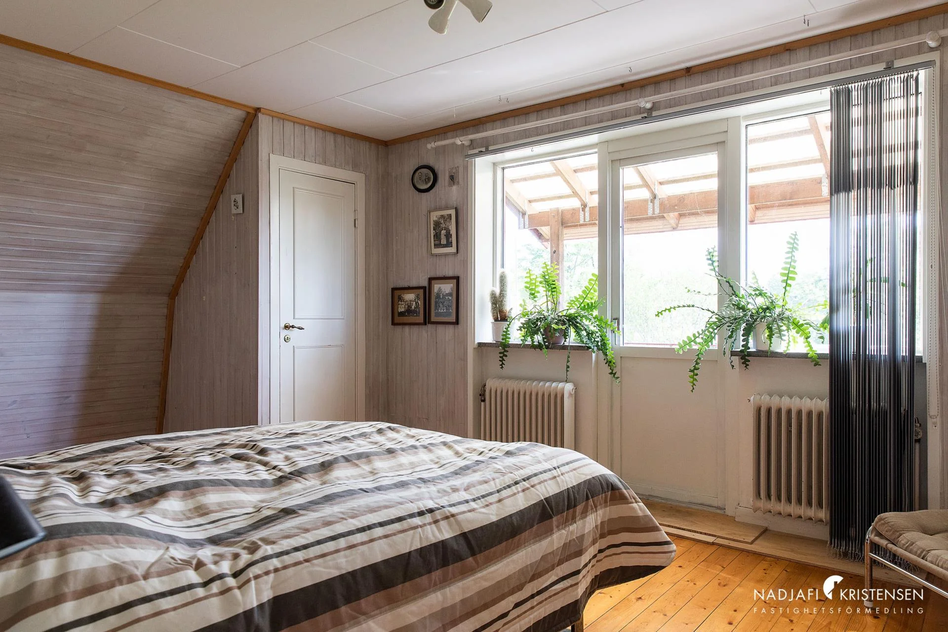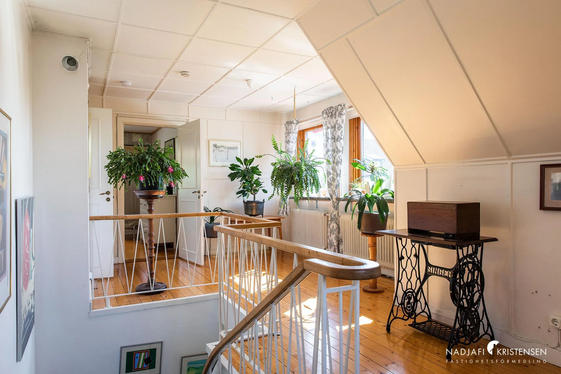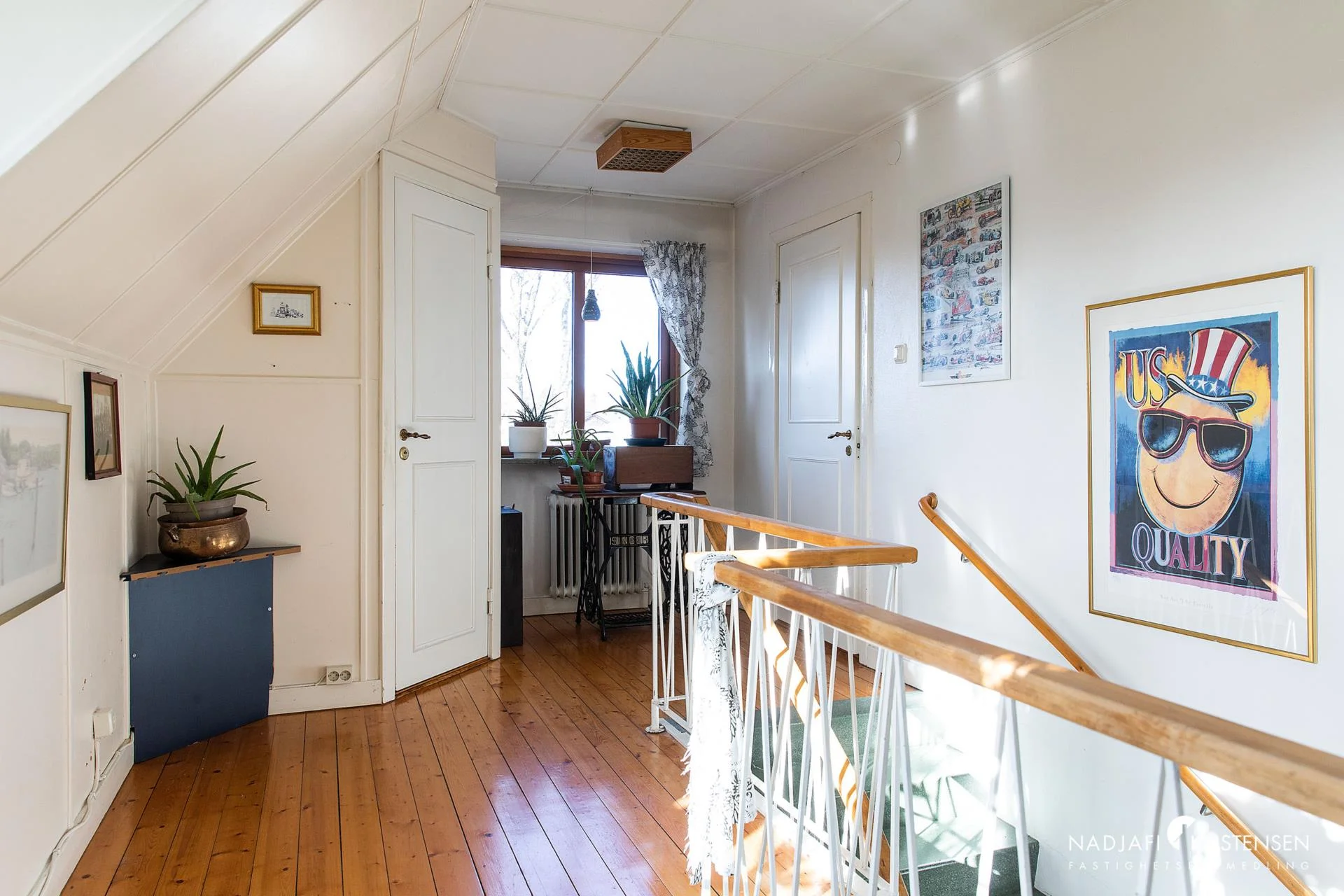 En trappa upp finns möblerbar hall, tre sovrum och WC. Det övre planet har genomgående trägolv, ett av sovrummen har utgång till balkong och en lite klädkammare.