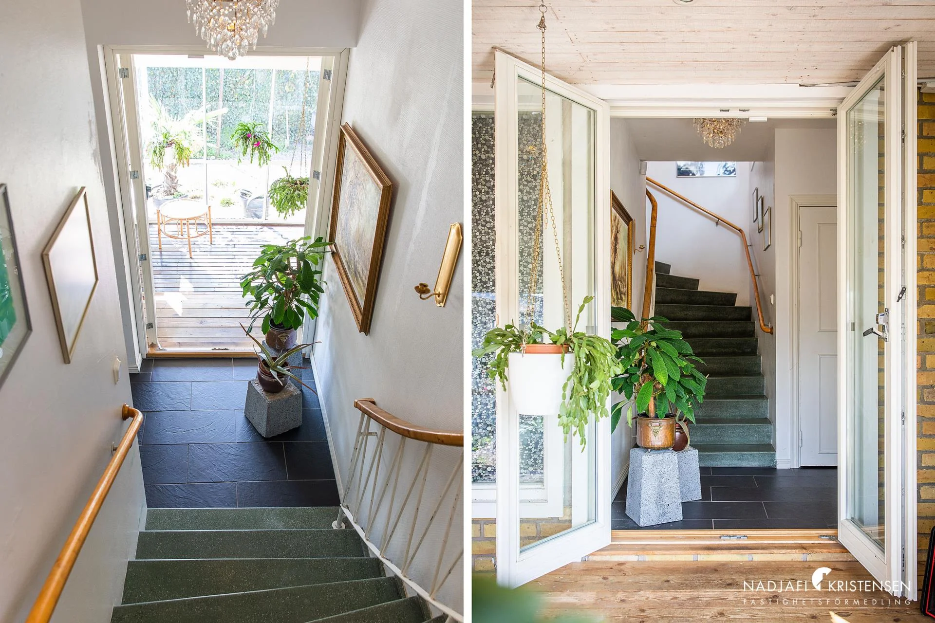 Genom entrén välkomnas man in i hall med plats för klädavhägning, till höger nås entréplanets badrum och direkt till vänster kommer man in köket. Köket är ljust och rymligt, i mitten finns en köksö med plats för förvaring och barstolar. I direkt anslutning till köket finns matplats som ligger i fil med vardagsrummet vilket skapar en stor social yta att umgås på. Vidare genom vardagsrummet finns en mindre hall med trappa till det övre planet och utgång till uterum i vinkel med stora öppningsbara fönsterpartier. Intill uterummet finns en insynsskyddad uteplats.