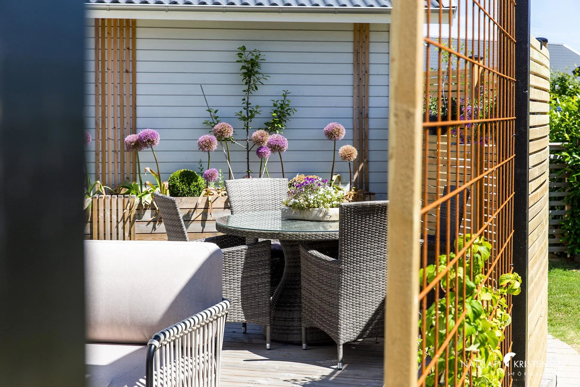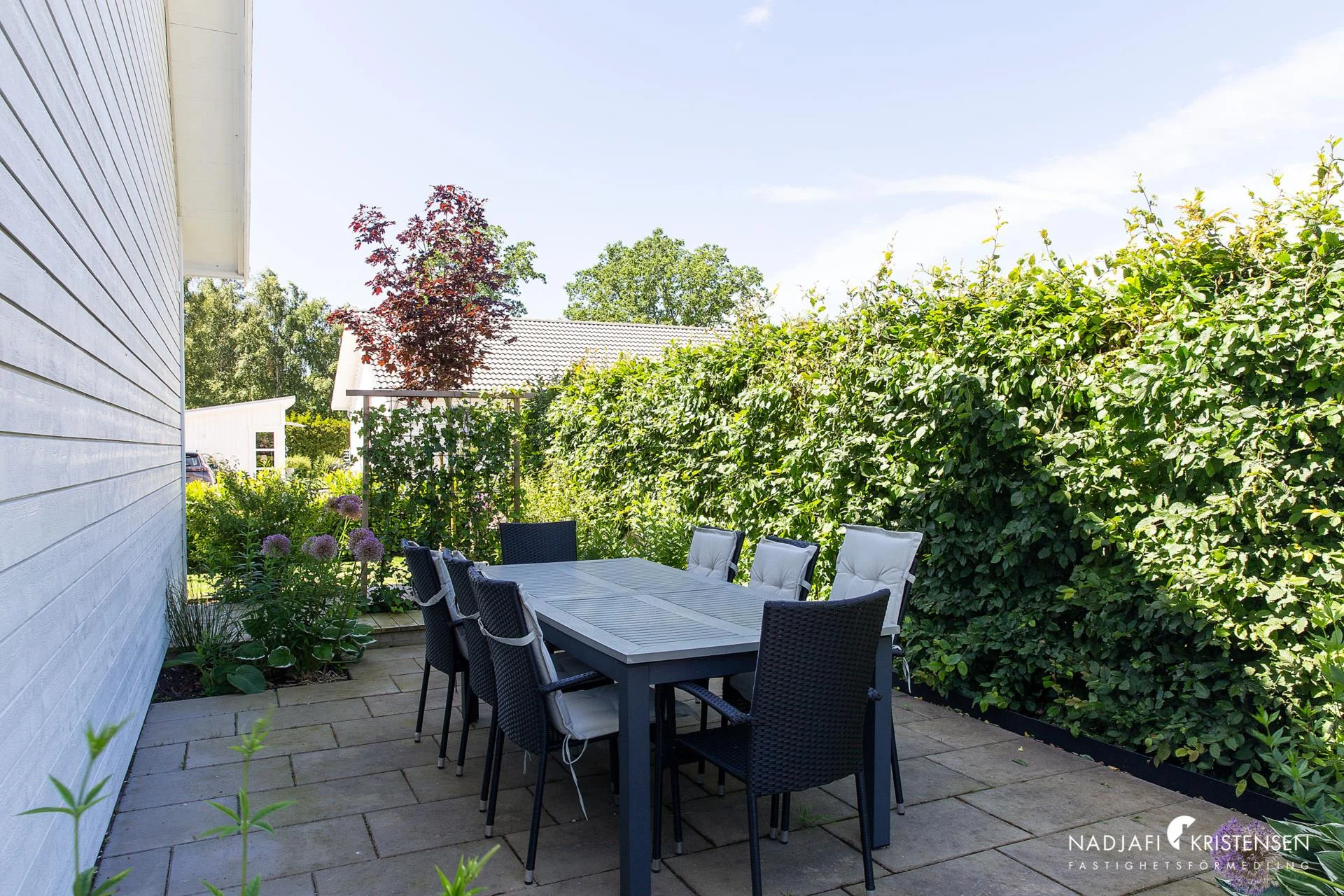 Trädgården är utöver det vanliga, hela trädgården är designad av Drömträdgård Bjäre och är en insynsskyddad oas. Genomtänkta placeringar av häckar, spaljéer, blomlådor samt vacker utebelysning som lyser upp växtligheten kvällstid. Uteplatser finns det flera, både stensatta och på trädäcket i alla sollägen samt en del med bubbelbad som kan användas under hela året.