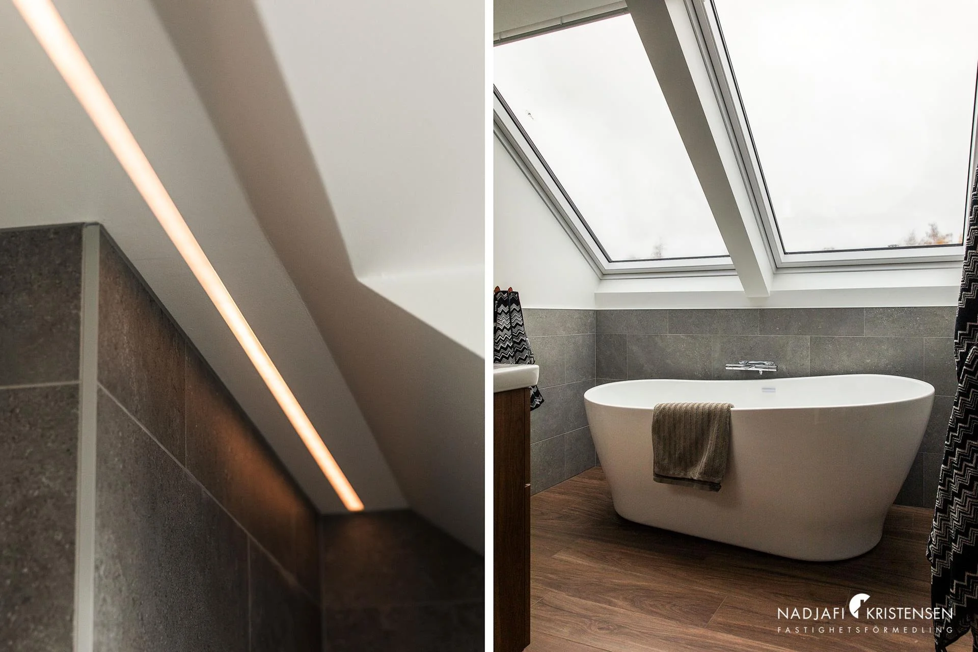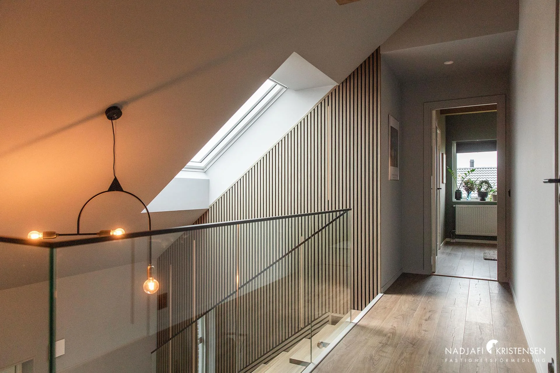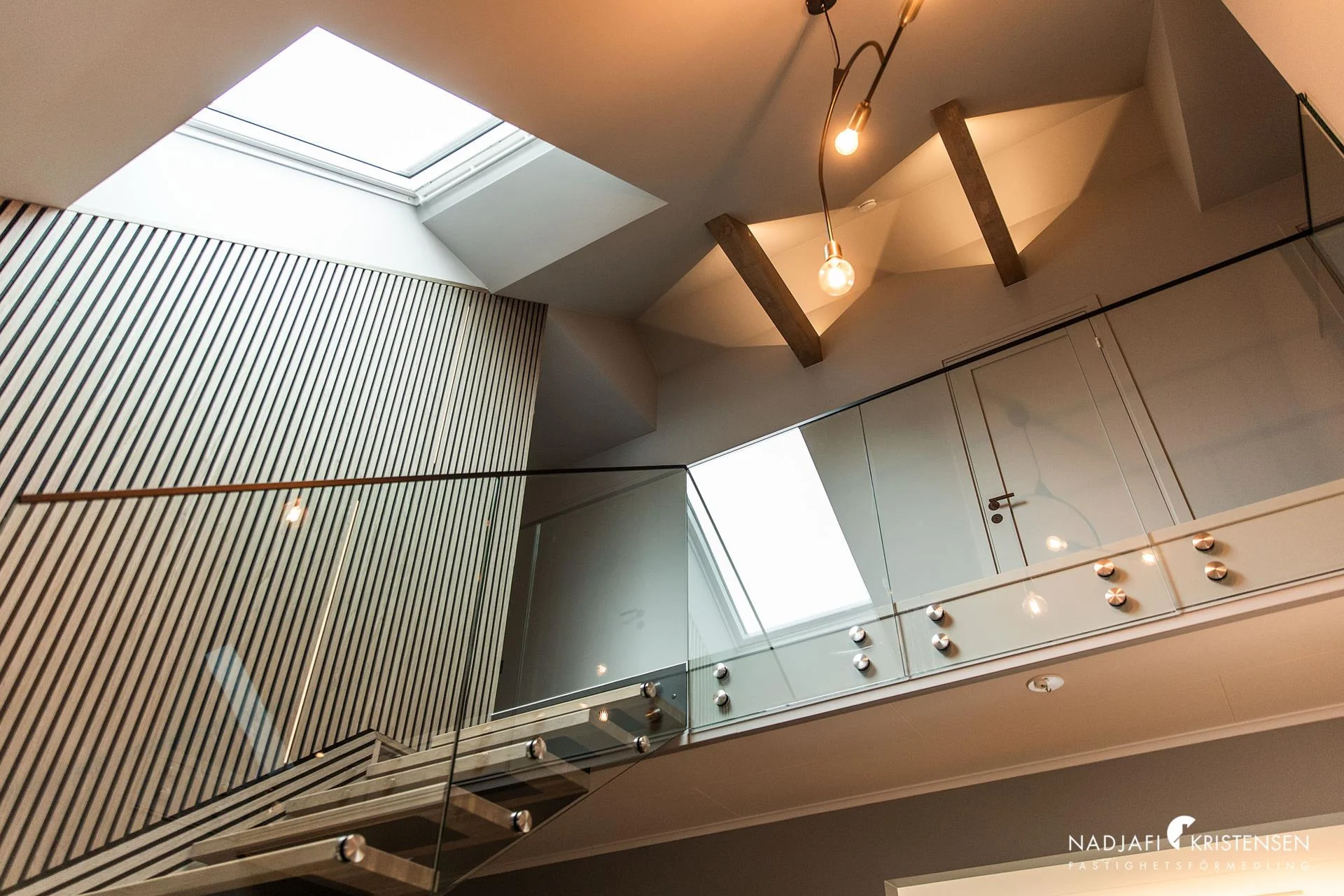 - Redan i hallen möts du av den eleganta trappan där öppen takhöjd, glasräcken och infällt belysning leder upp till den nybyggda ovanvåningen. Här finns tre sovrum, klädkammare med praktisk tvättdel samt master bedroom med glasparti in till walk-in-closet. Dessutom har master bedroom egen tillgång till badrum med både dusch och badkar under stora takfönster.