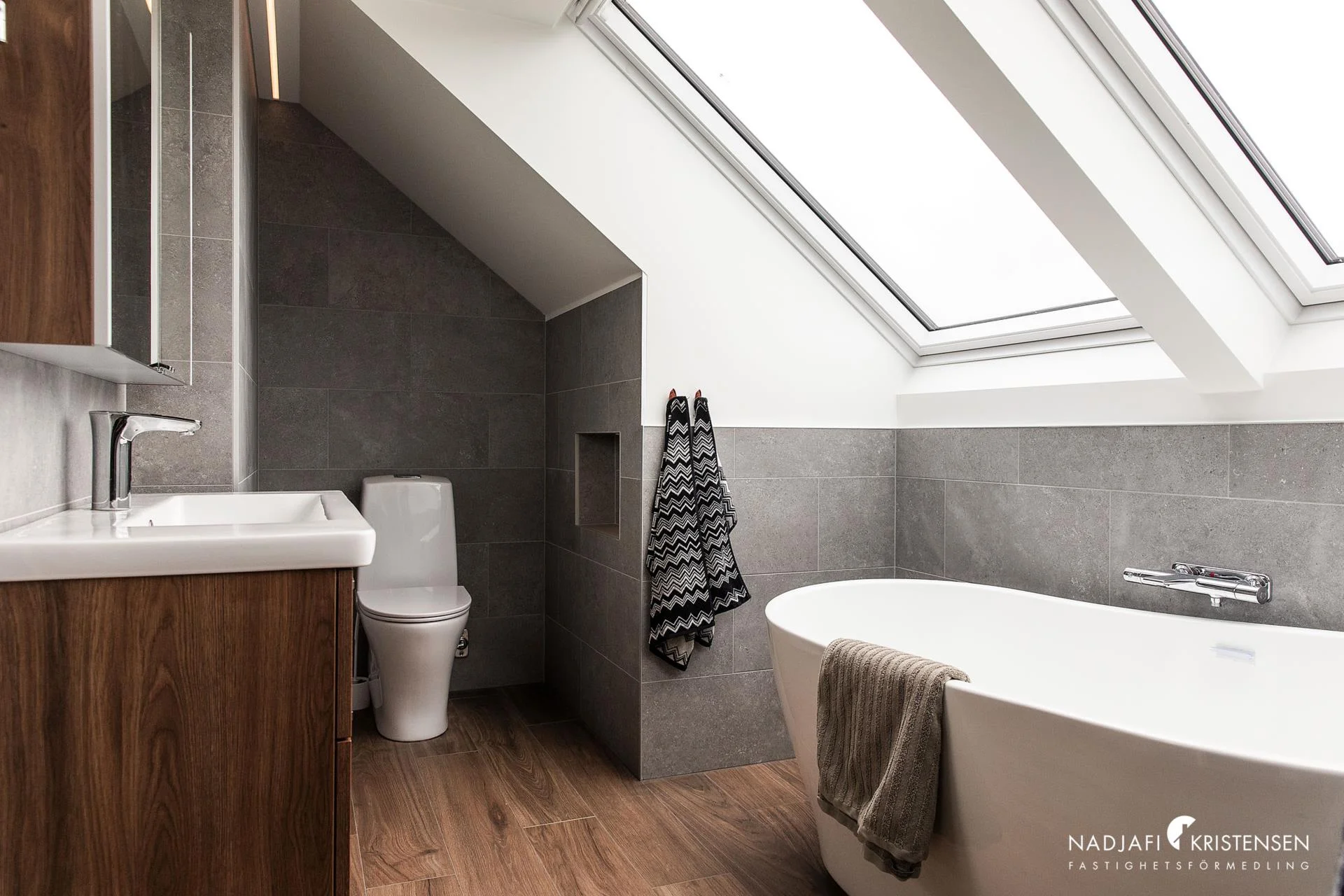 Den imponerande trappan leder vidare till den nybyggda ovanvåningen. Här erbjuds tre rofyllda sovrum, master bedroom har egen walk-in closet och ett exklusivt badrum med både dusch och badkar, placerade under två stora takfönster som släpper in ett fantastiskt ljus. Ytterligare två sovrum med inbyggda garderober, dessutom finns en praktisk klädkammare med tvättdel som gör det partiskt i vardagen.