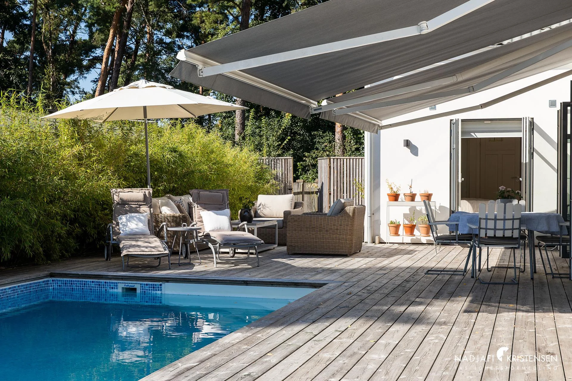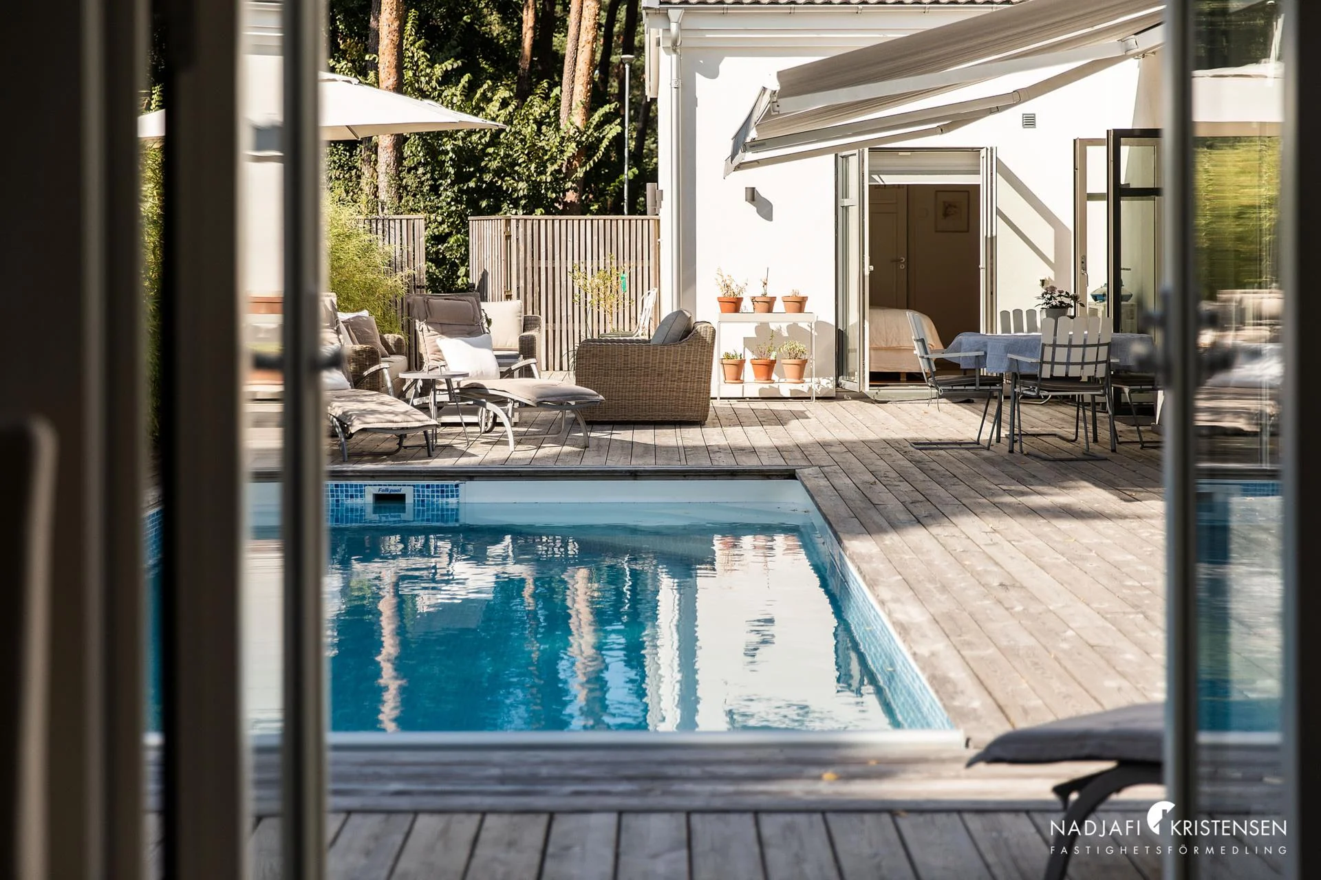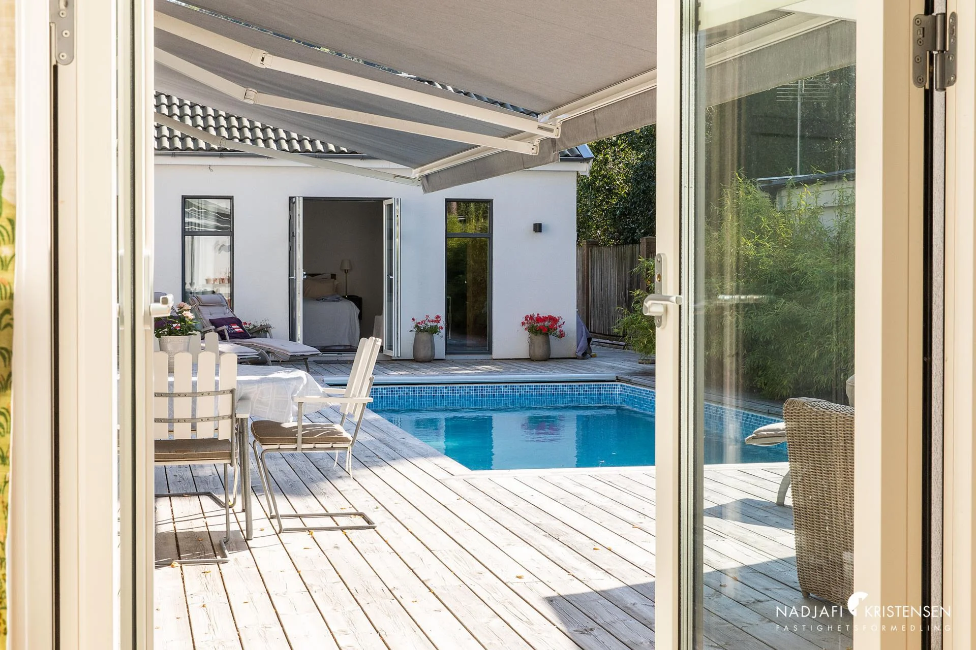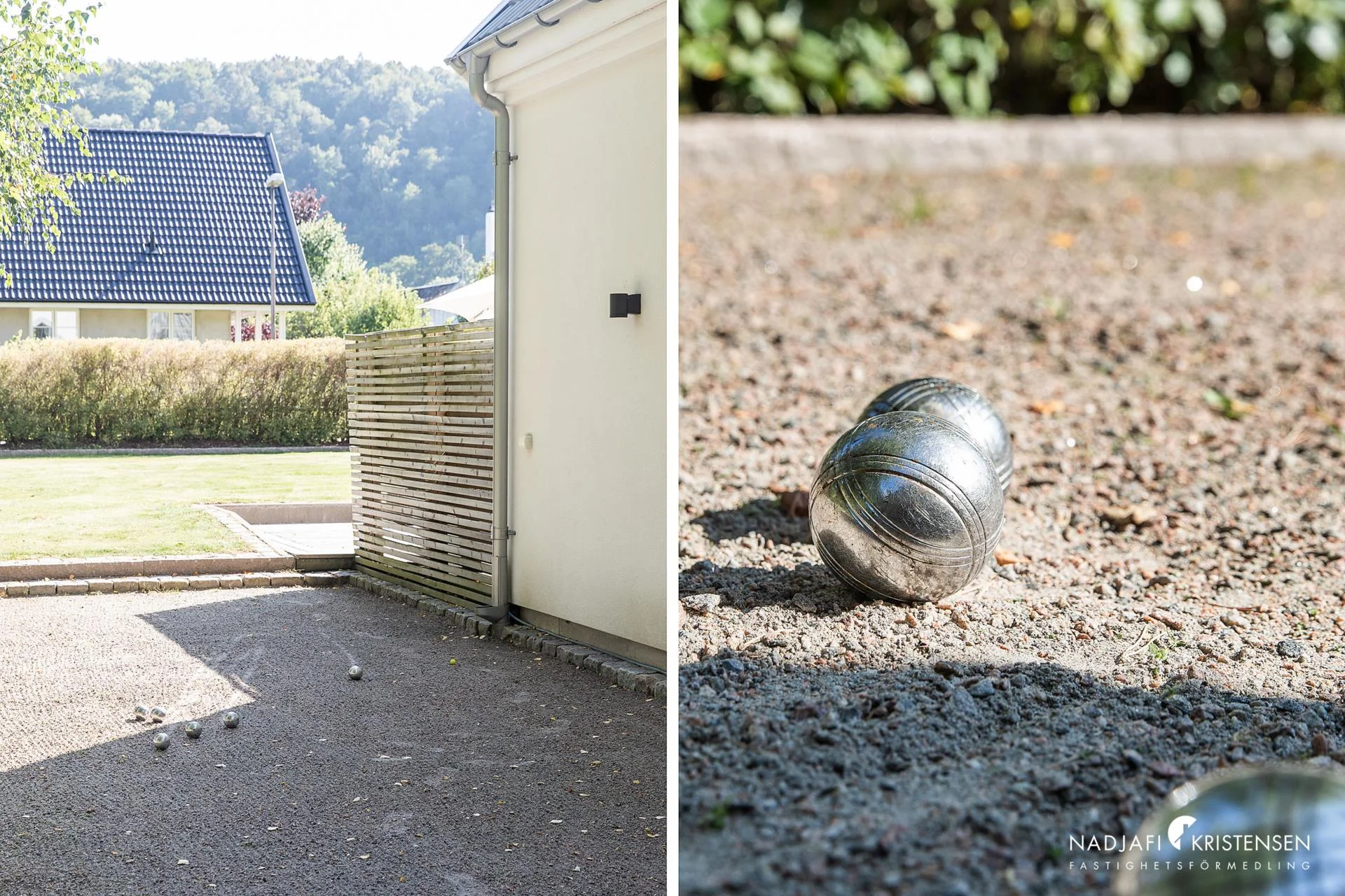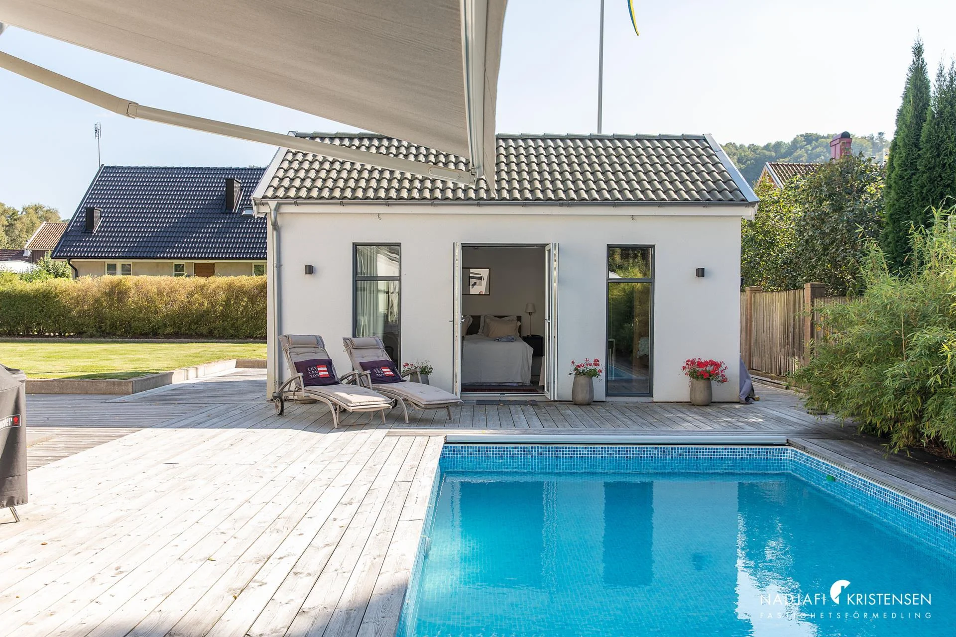 Utomhusmiljön är en sann oas. Den vackert anlagda trädgården erbjuder både avkoppling och aktivitet – med uteplats under markis på trädäck, en egen boulebana och ett lyxigt poolområde. I det tillhörande poolhuset finner du ytterligare ett sovrum, bastu, dusch, toalett och förråd – perfekt för gäster eller avkoppling efter en dag vid poolen (som är uppvärmd med en effektiv ny värmepump).