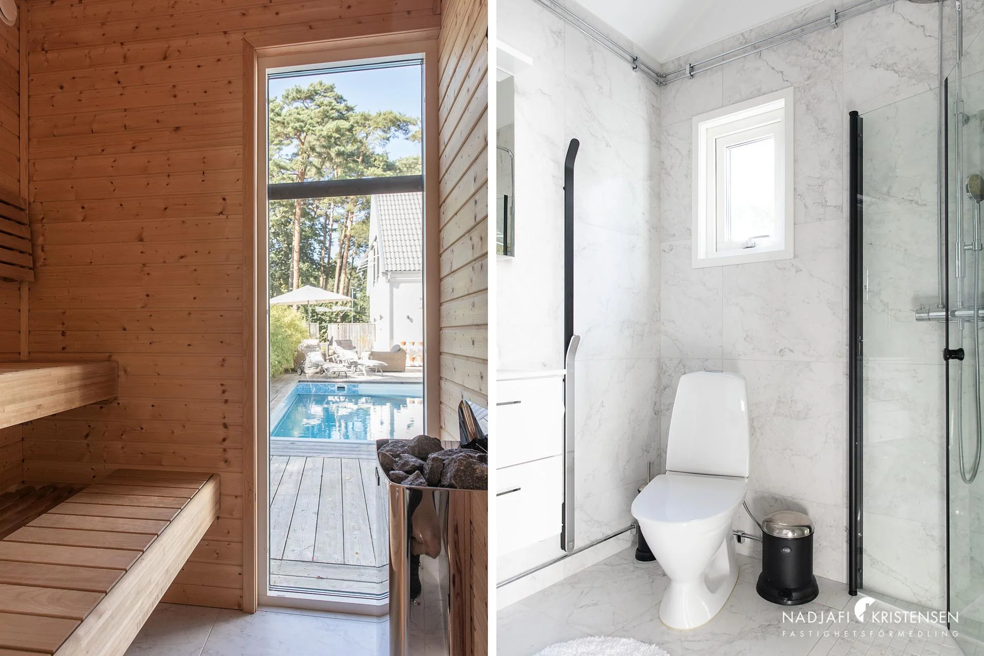 Golvvärme i alla rum på nedervåningen i huvudhuset och elgolvvärme i badrum på övervåning samt i poolhus.