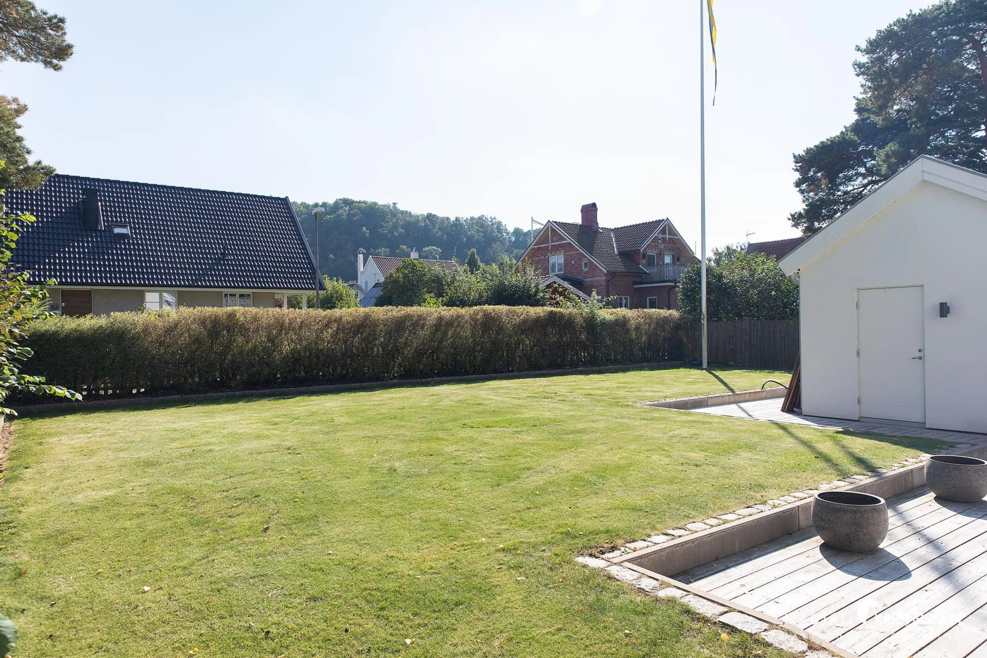 Den vackert anlagda trädgården erbjuder gräsmatta, planteringar, stenläggning, en generös uteplats med markis samt en egen boulebana. Poolområdet med tillhörande poolhus ger en känsla av lyx. Flaggstång.