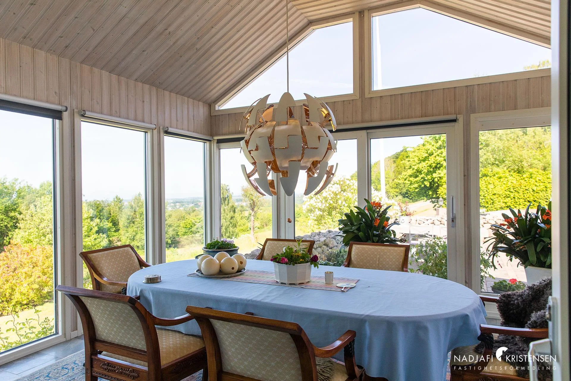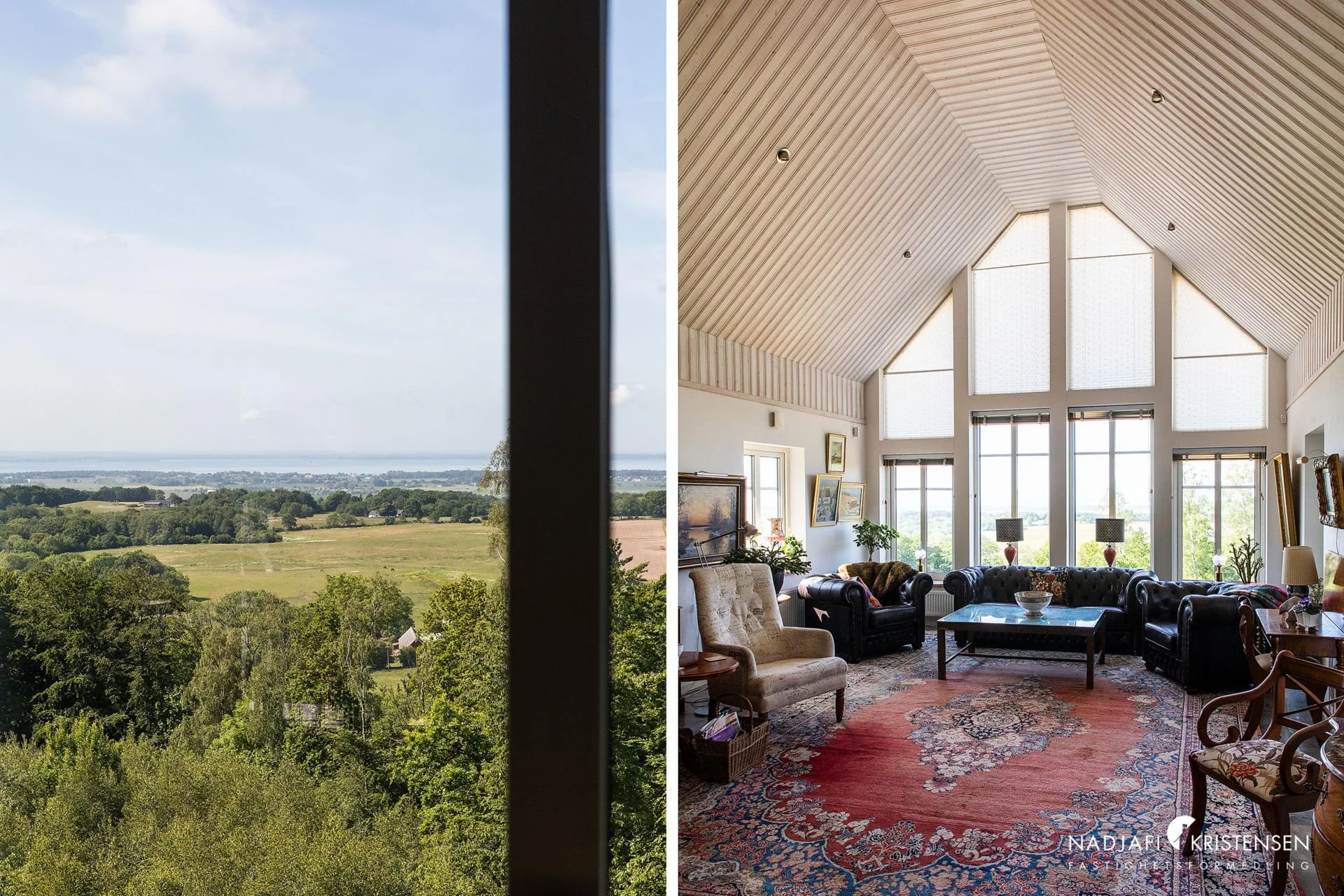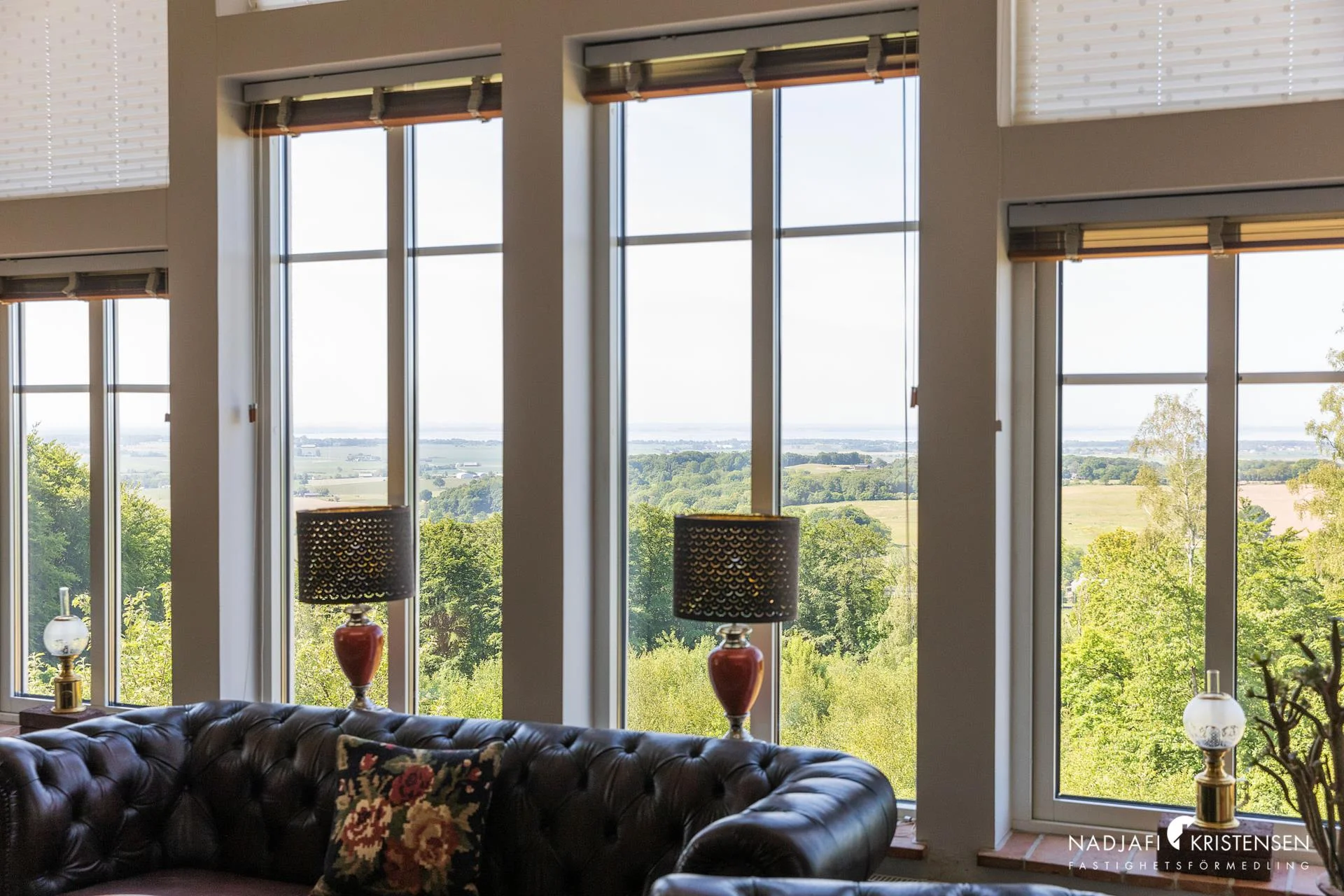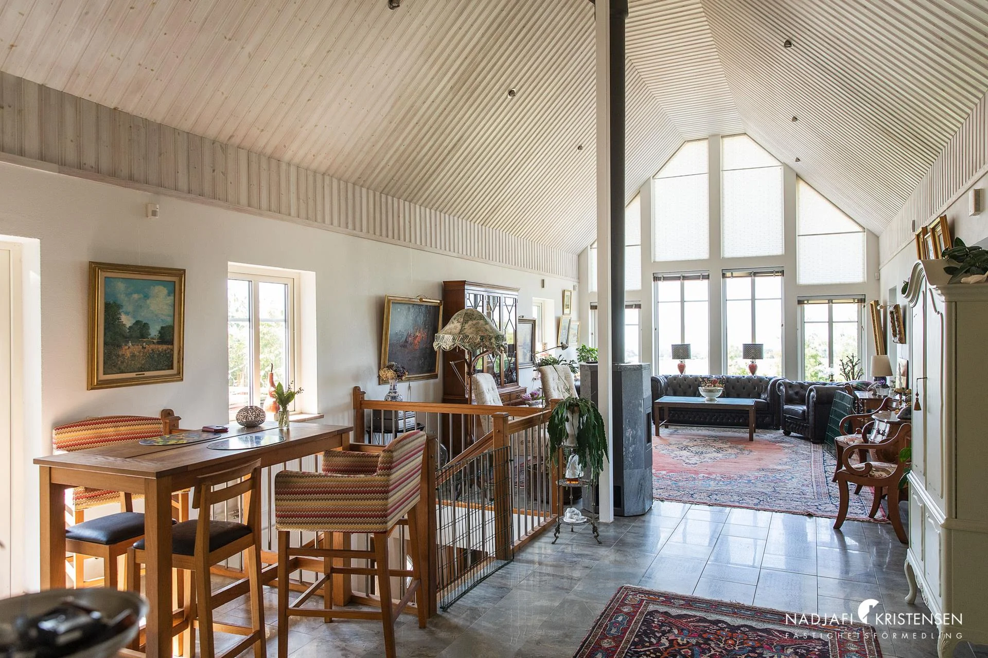 Husets hjärta är den imponerande sällskapsdelen med kök och vardagsrum i öppen planlösning, där takhöjden sträcker sig ända upp till nocken och generösa fönsterpartier släpper in ljuset och utsikten över landskapet. En centralt placerad kamin förstärker den varma och inbjudande atmosfären. På entréplanet finns även ett TV-rum, ett kontor/gästrum, ett helkaklat badrum med jacuzzi och ett härligt uterum där vyerna fortsätter att vara en naturlig del av inredningen.