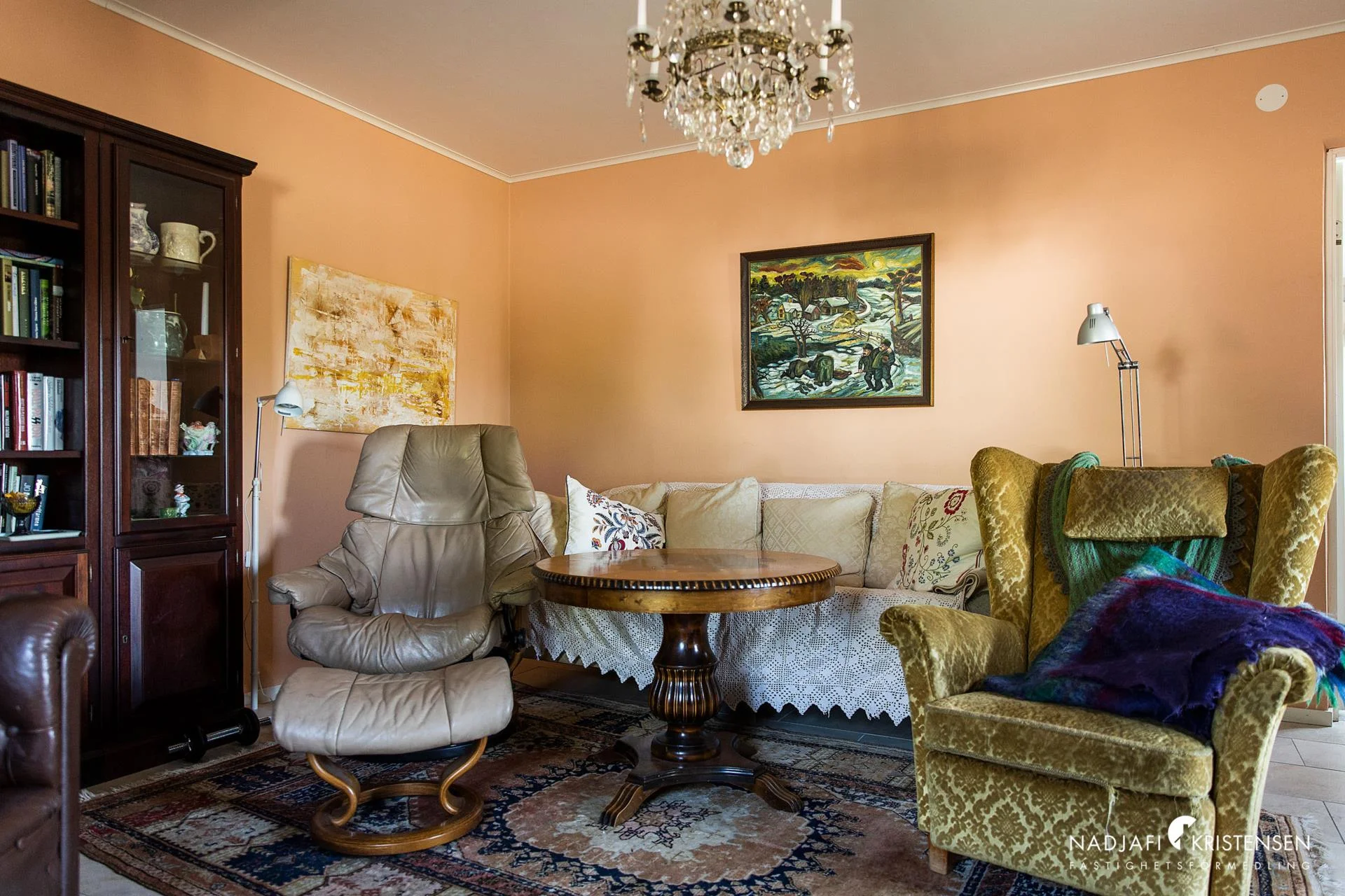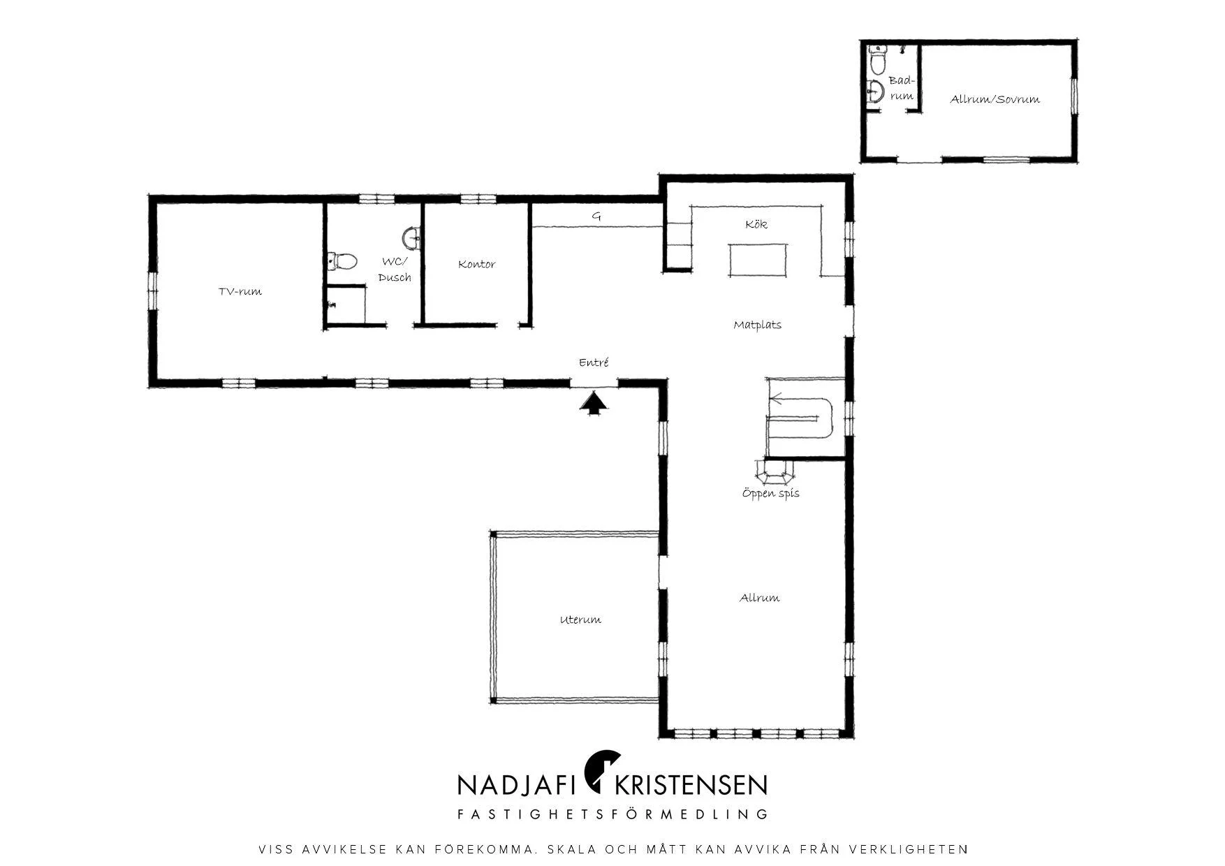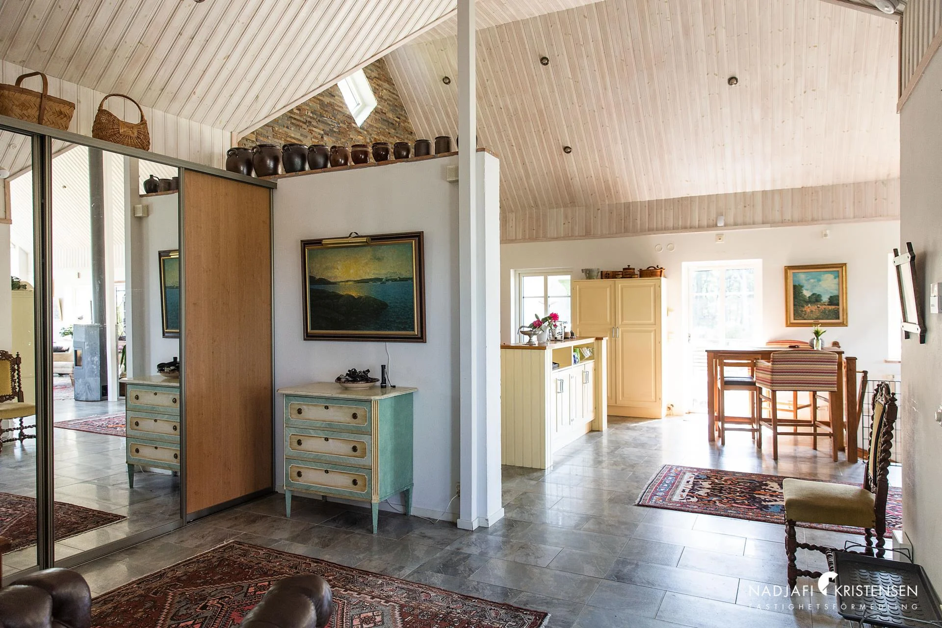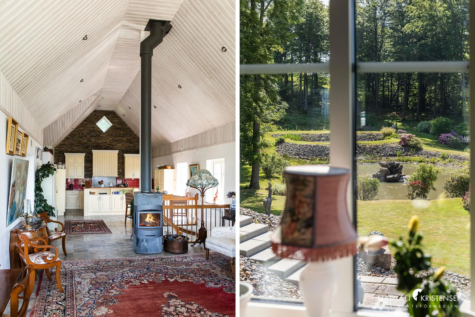 Husets hjärta är den imponerande sällskapsdelen med kök och vardagsrum i öppen planlösning, där takhöjden sträcker sig ända upp till nocken och generösa fönsterpartier släpper in ljuset och utsikten över landskapet. En centralt placerad kamin förstärker den varma och inbjudande atmosfären. På entréplanet finns även ett TV-rum, ett kontor/gästrum, ett helkaklat badrum med jacuzzi och ett härligt uterum där vyerna fortsätter att vara en naturlig del av inredningen.