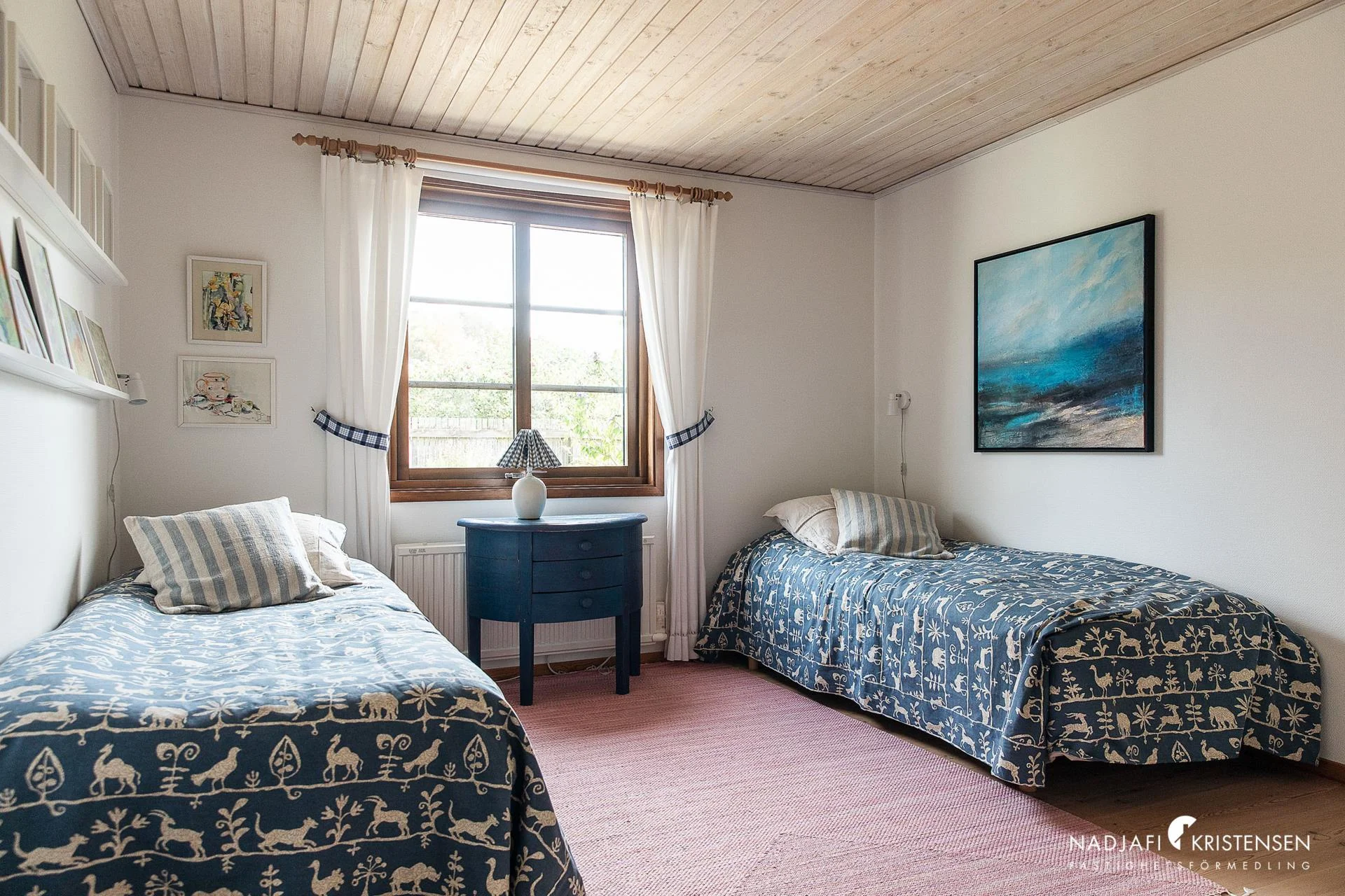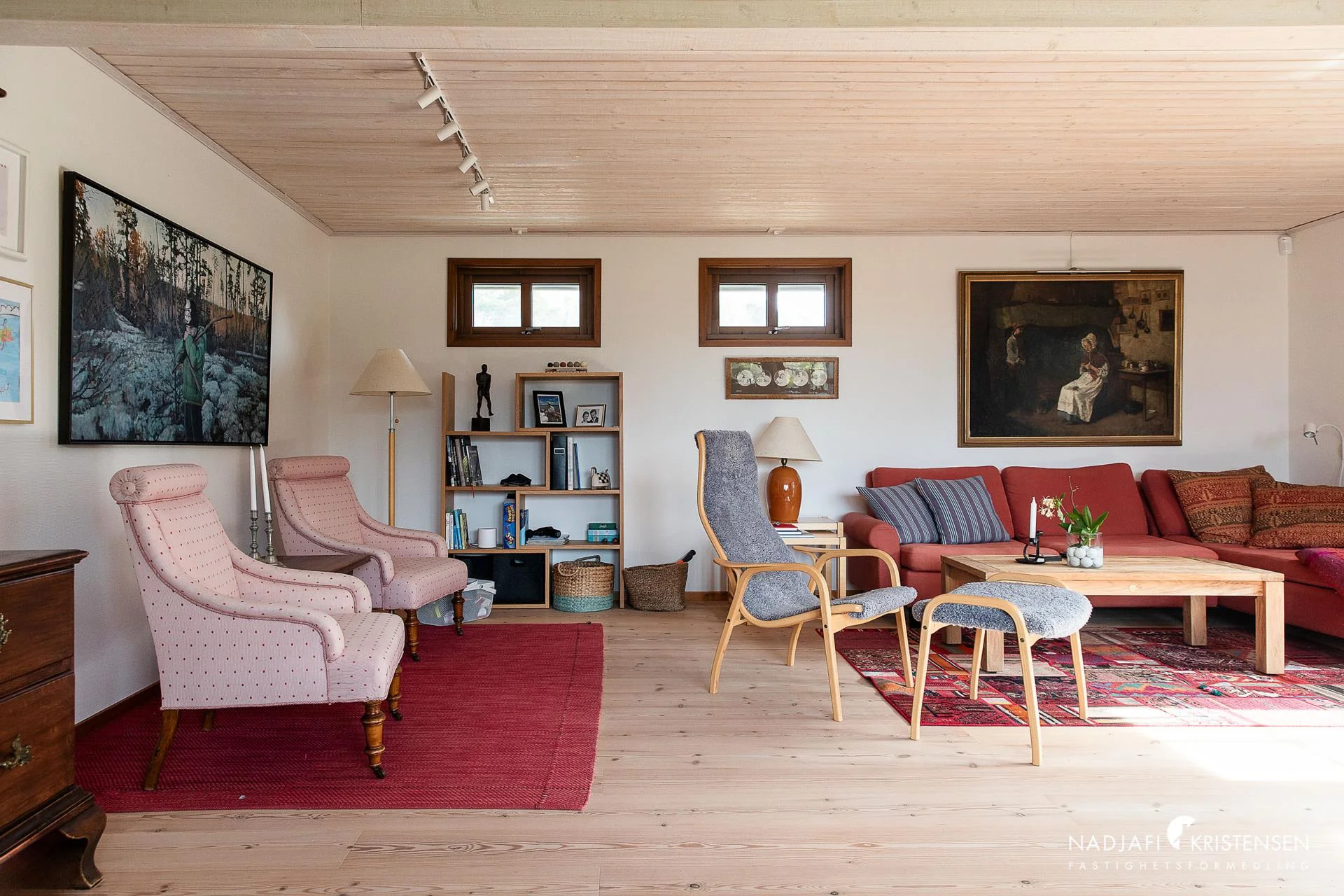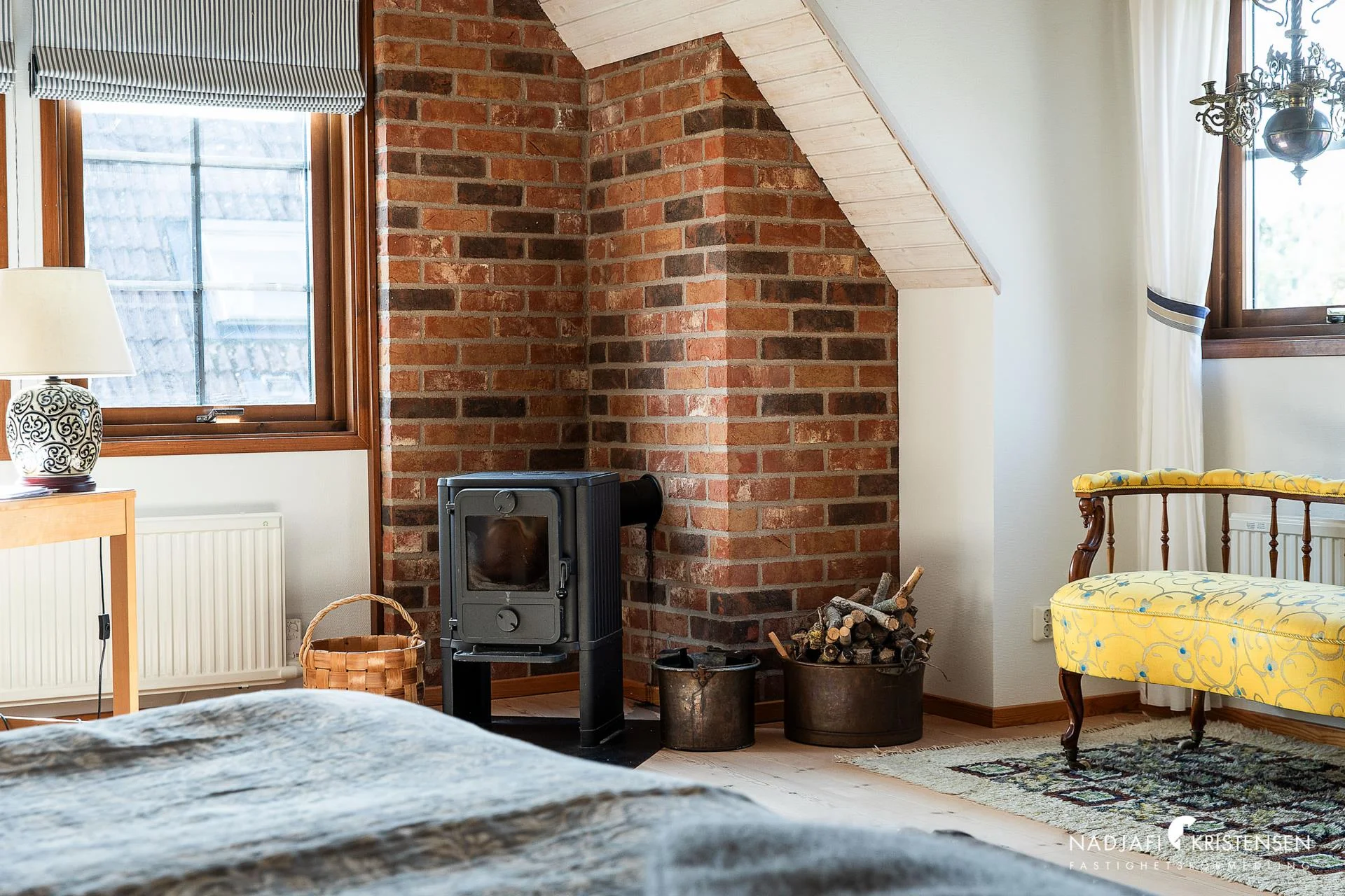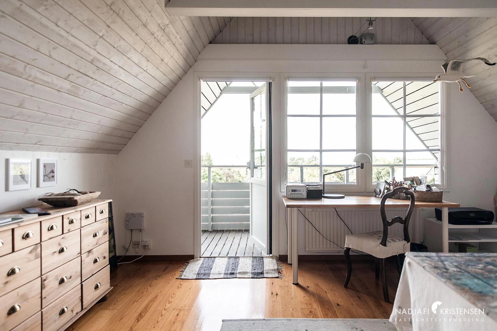 Ovanvåningen har även den plankgolv och erbjuder ett stort rum öppet upp i nock – ett flexibelt utrymme som kan användas som allrum, sovrum eller som idag, ateljé. Härifrån nås balkongen med ljuvlig utsikt mot hav och golfbana. På planet finns också ett badrum med bastu samt två sovrum, varav det ena är extra rymligt med mysig Handöl kamin och fönsterkupa mot havet. De synliga takbjälkarna, panelklädda väggar och den öppna takhöjden ger karaktär, och även här finns en charmig gjutjärnskamin.