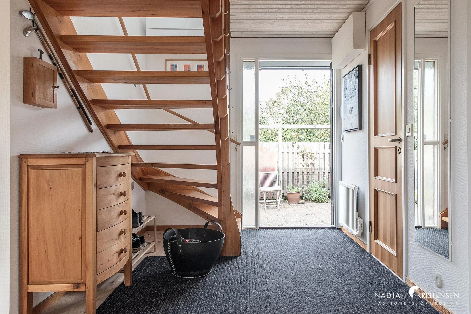 Entrén erbjuder plats för avhängning och leder vidare till trappa upp till ovanvåningen samt ett badrum med dusch. Planlösningen öppnar upp mot kök, matplats och vardagsrum i en social och ljus helhet. Köket, som renoverades 2014, är funktionellt utformat med goda arbetsytor och serveringsmöjligheter intill matplatsen.