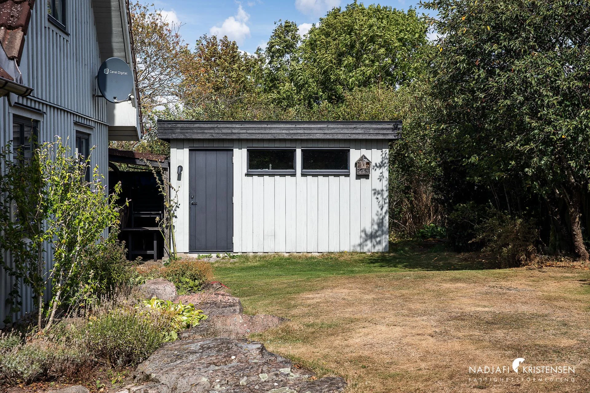 Tomten är lättskött med gräsmatta, stensatta ytor vid entré och förråd samt planteringar och delvis inhägnad mot grannar. Huset är väl underhållet och har målats löpande genom åren.