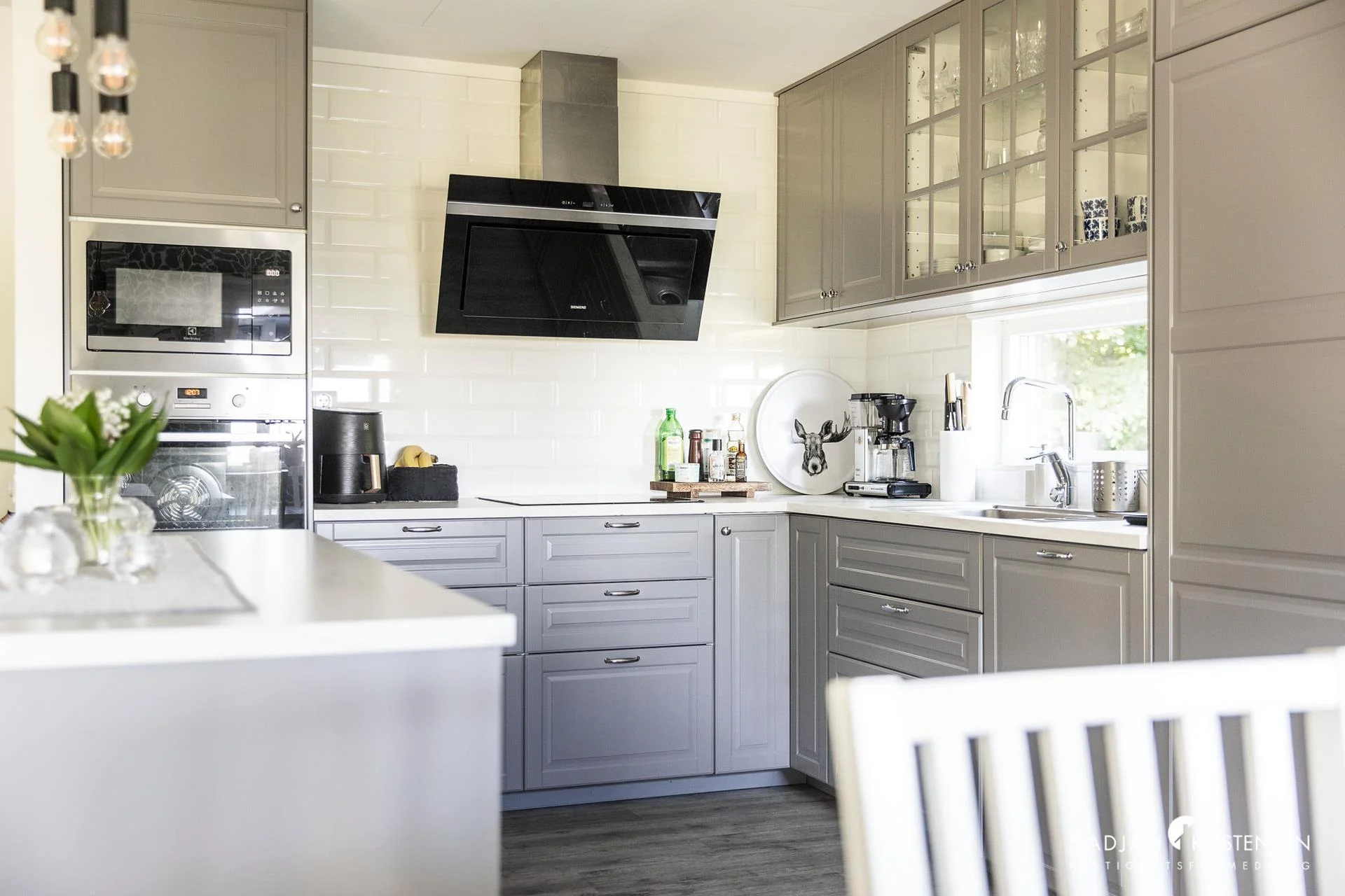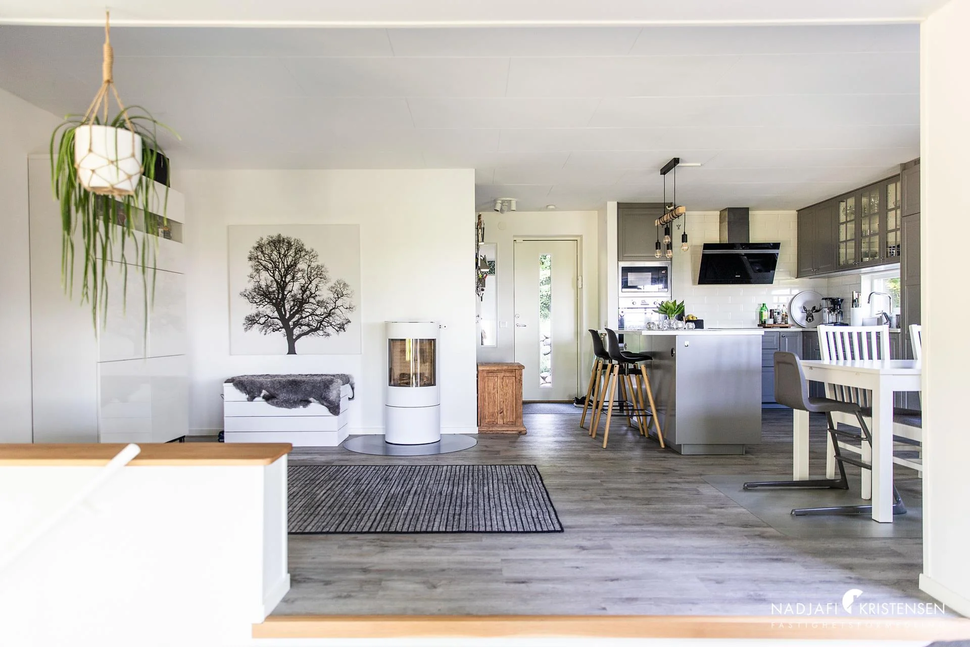 Entrésidan har finplanerade ytor med stenmurar och trappa leder oss i huset där de öppna och ljusa ytorna direkt gör att blicken lyfts till utsikten genom de stora fönsterna. Från hallen ligger köket i direkt anslutning till vänster med köksö och arbetsytor i vinkel, samt liggande fönster vid vasken för extra ljusinsläpp. Smakfullt kök med grå köksluckor och gott om förvaring , den öppna planlösningen mot matplatsen skapar en väldigt trevligt social yta. Intill matplatsen leder dörr ut till altanen i helt perfekt solläge där man aldrig tröttnar på den milsvida utsikten.