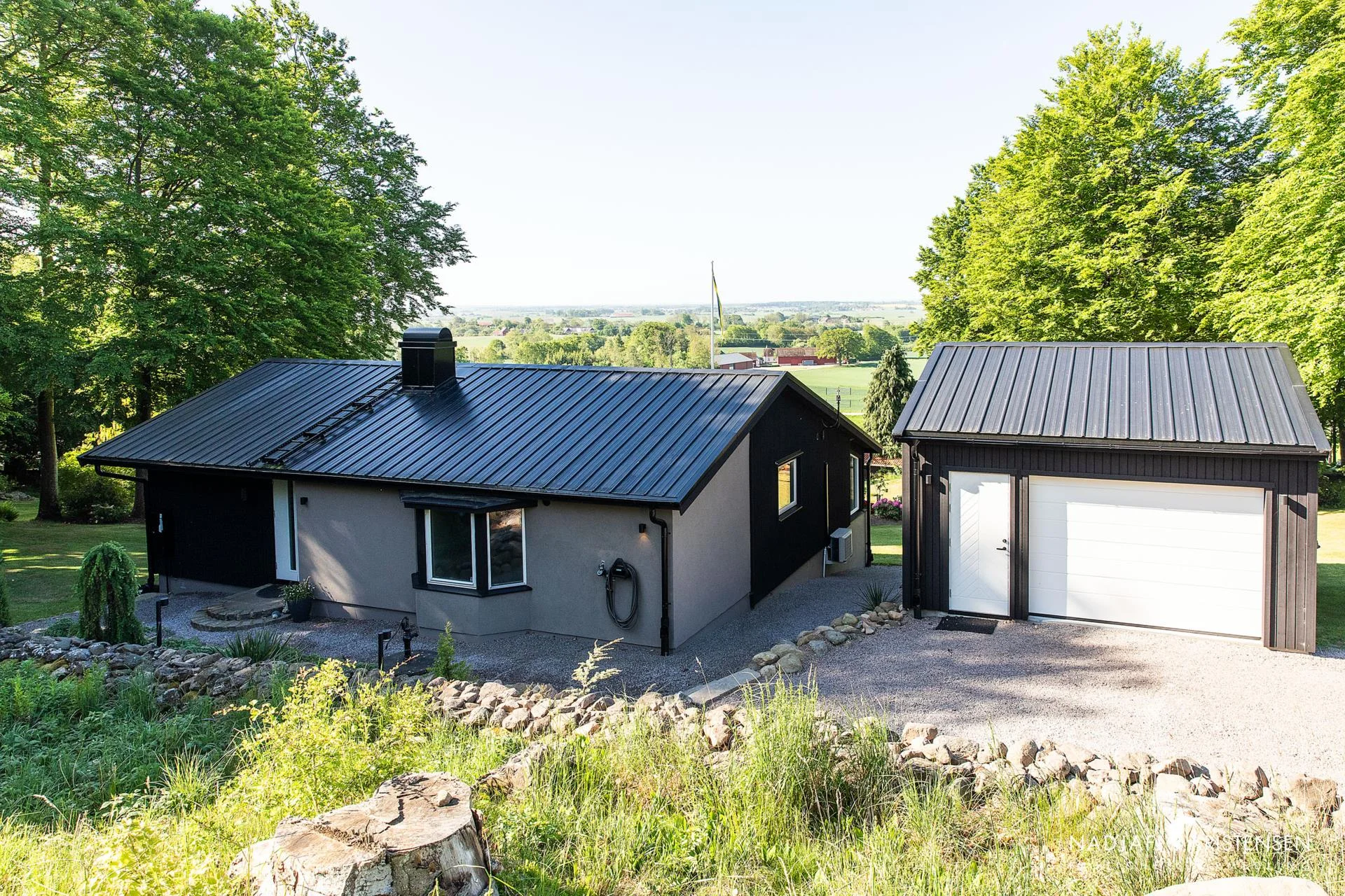 - På tomten finns även ett nybyggt garage i toppskick och gott om plats på tomten för både odling, lek och avkoppling. Det här är en plats för dig som söker lugnet, friheten och naturen – men som också uppskattar design, kvalitet och omsorg i detaljerna.