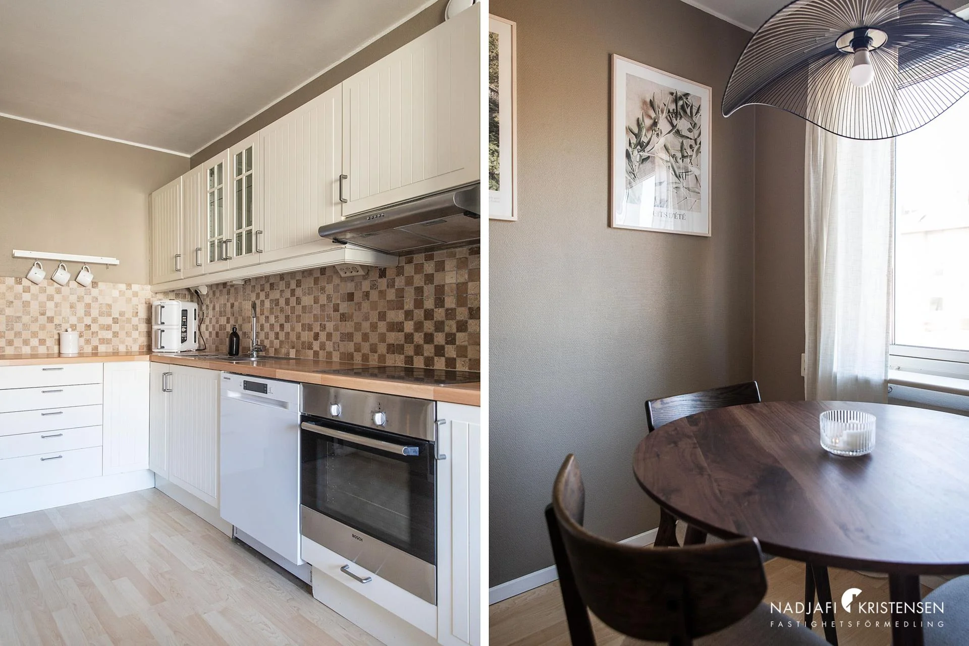 Köket är funktionellt planerat med bra arbetsytor, förvaring och plats för matbord. Det helkaklade badrummet är utrustat med dusch, toalett, handfat och handukstork samt förberett för tvättmaskin, och i grannhuset finns även tillgång till gemensam tvättstuga.