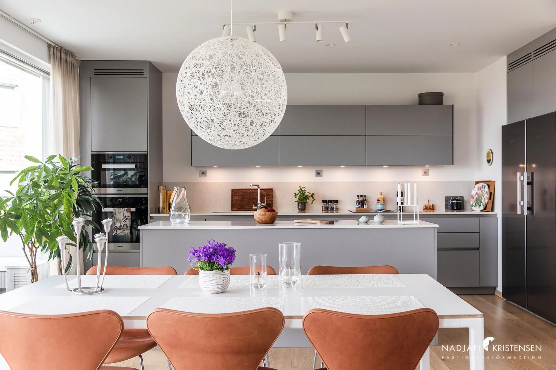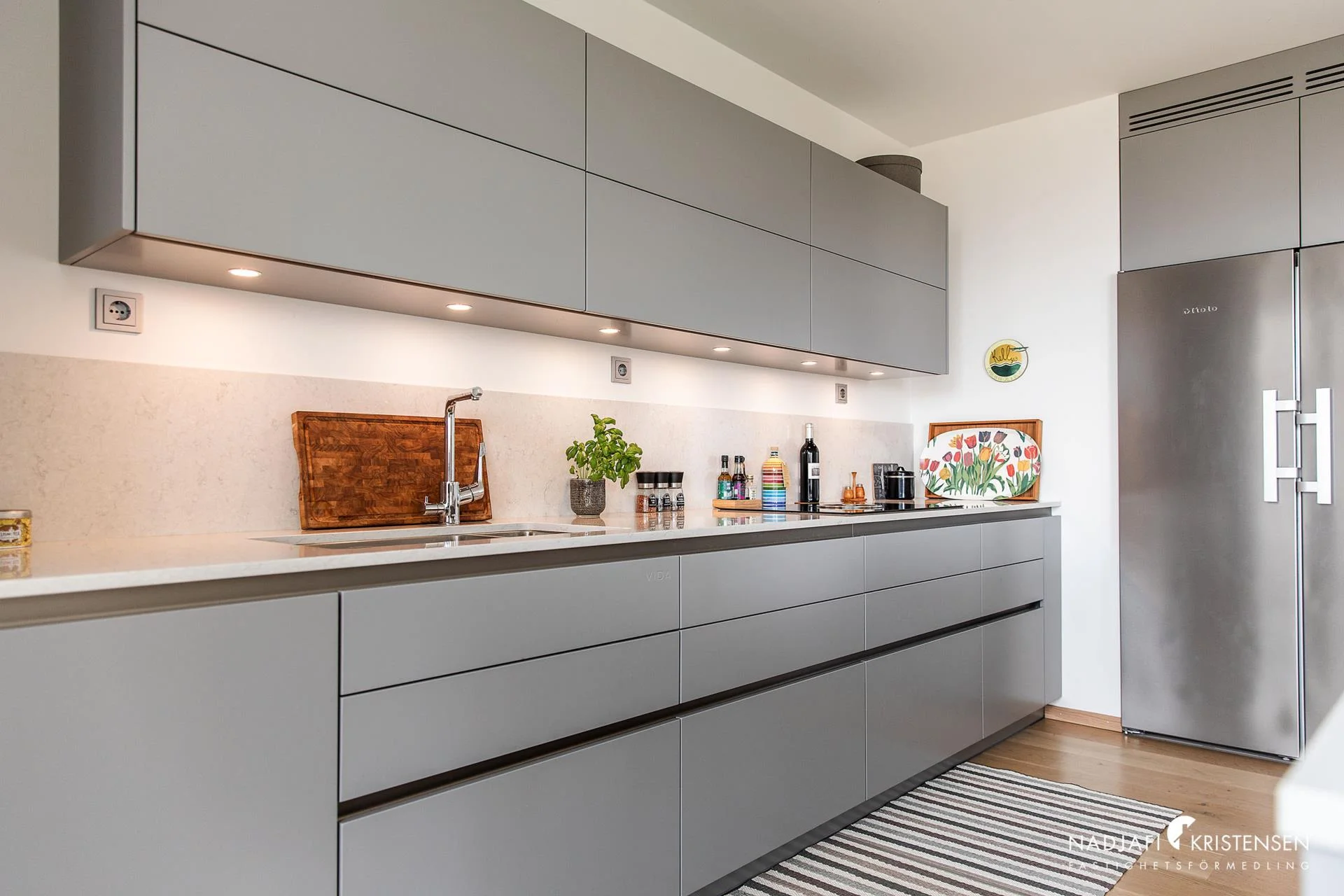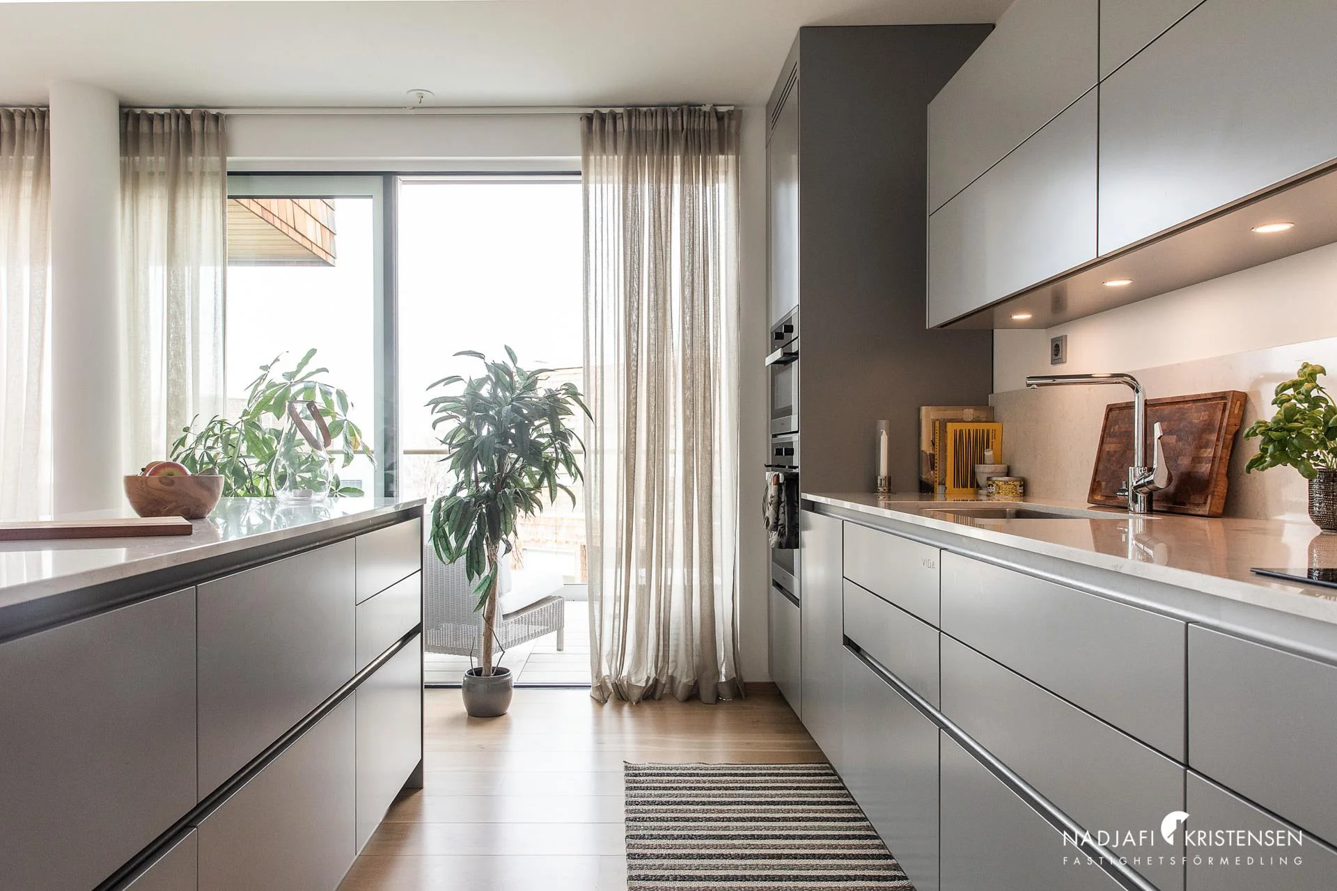 Bostaden präglas av ljus, rymd och genomtänkta materialval där stora glaspartier suddar ut gränsen mellan inne och ute. Det generösa sällskapsrummet med öppet kök och köksö blir hemmets självklara samlingspunkt – perfekt för både vardag och sociala tillställningar. Köket, från VIDA, går i stilrent ljusgrått och kompletteras av påkostade vitvaror från Miele samt exklusiva detaljer som spishäll från Bora och bänkskiva i stenkomposit.