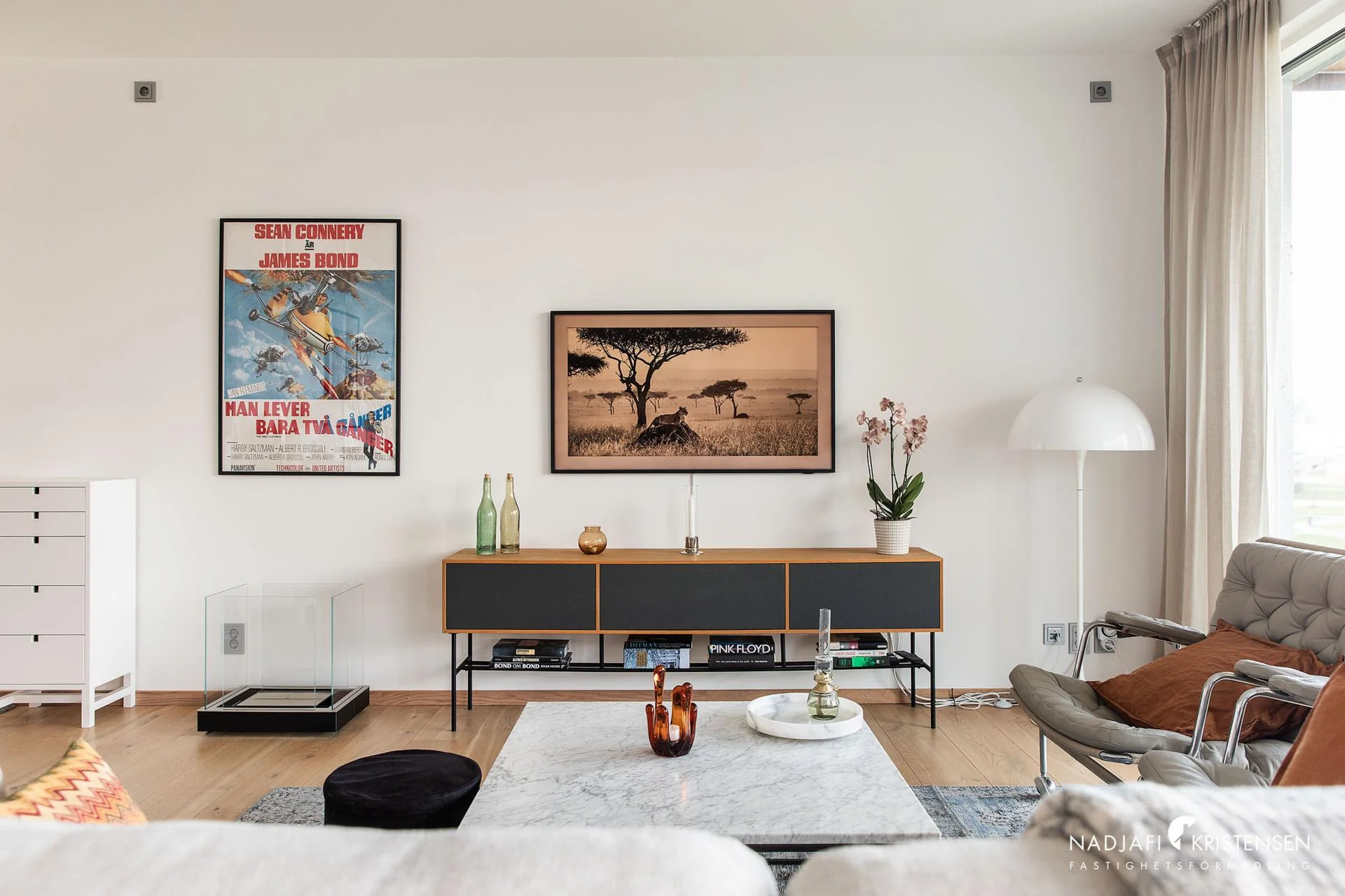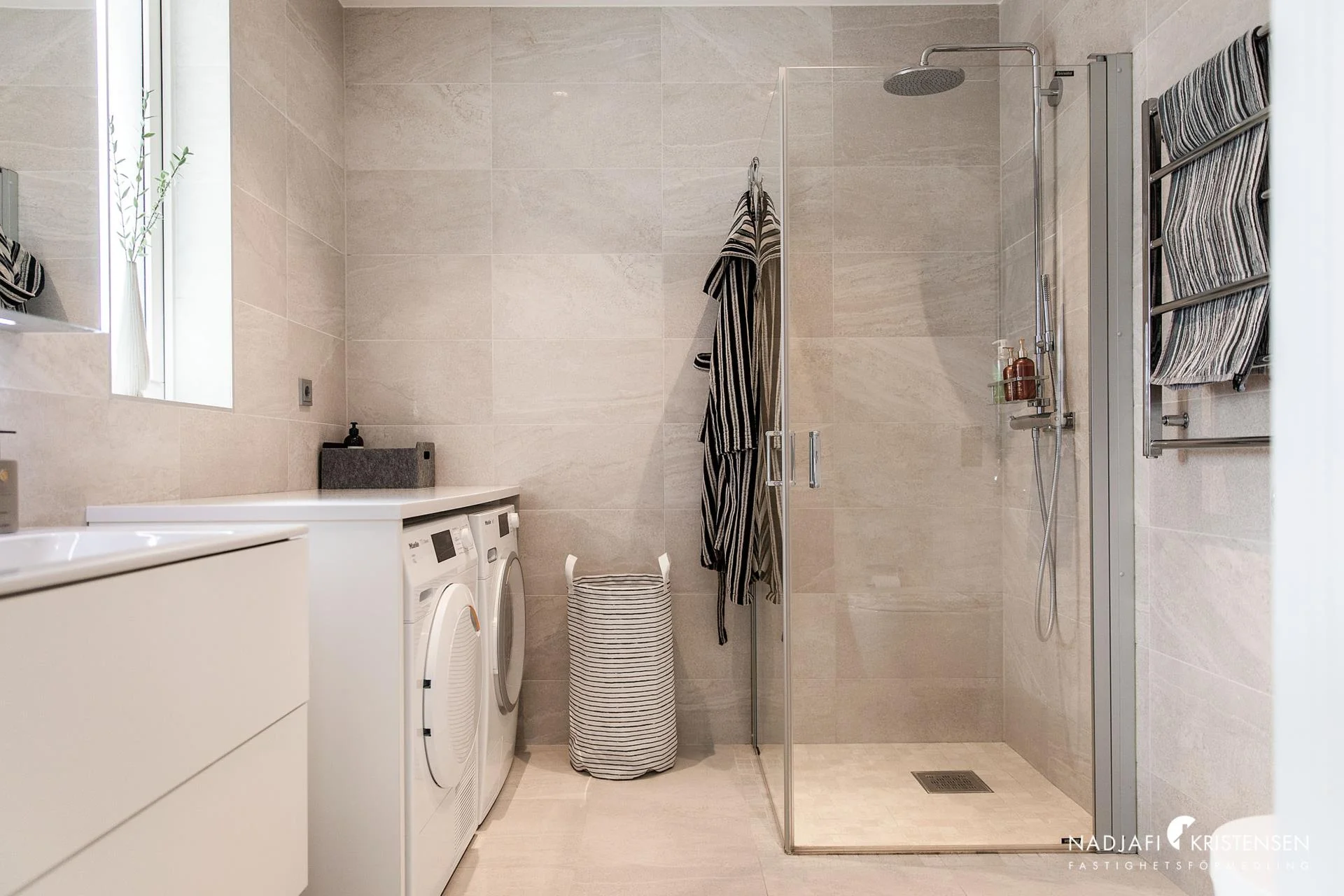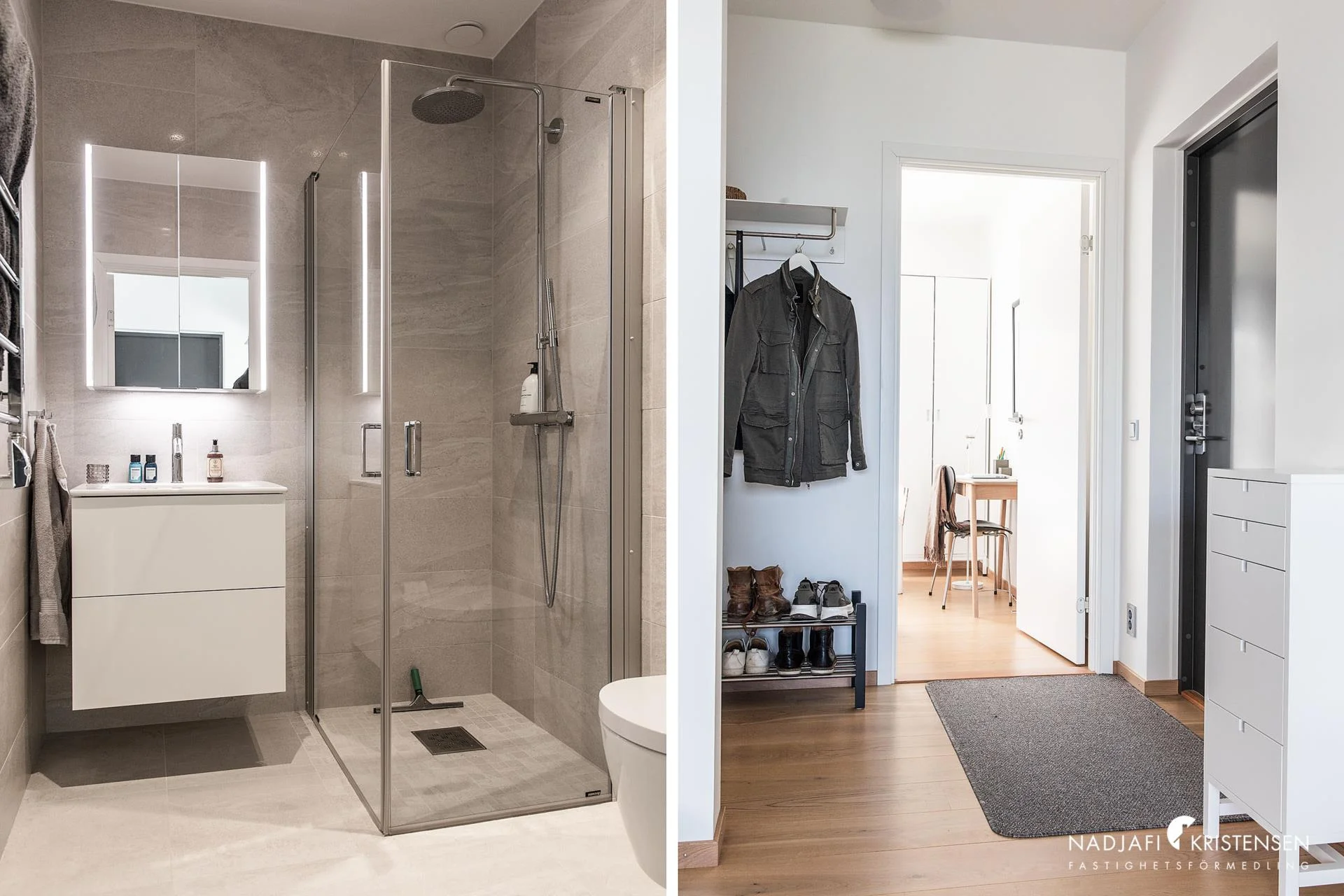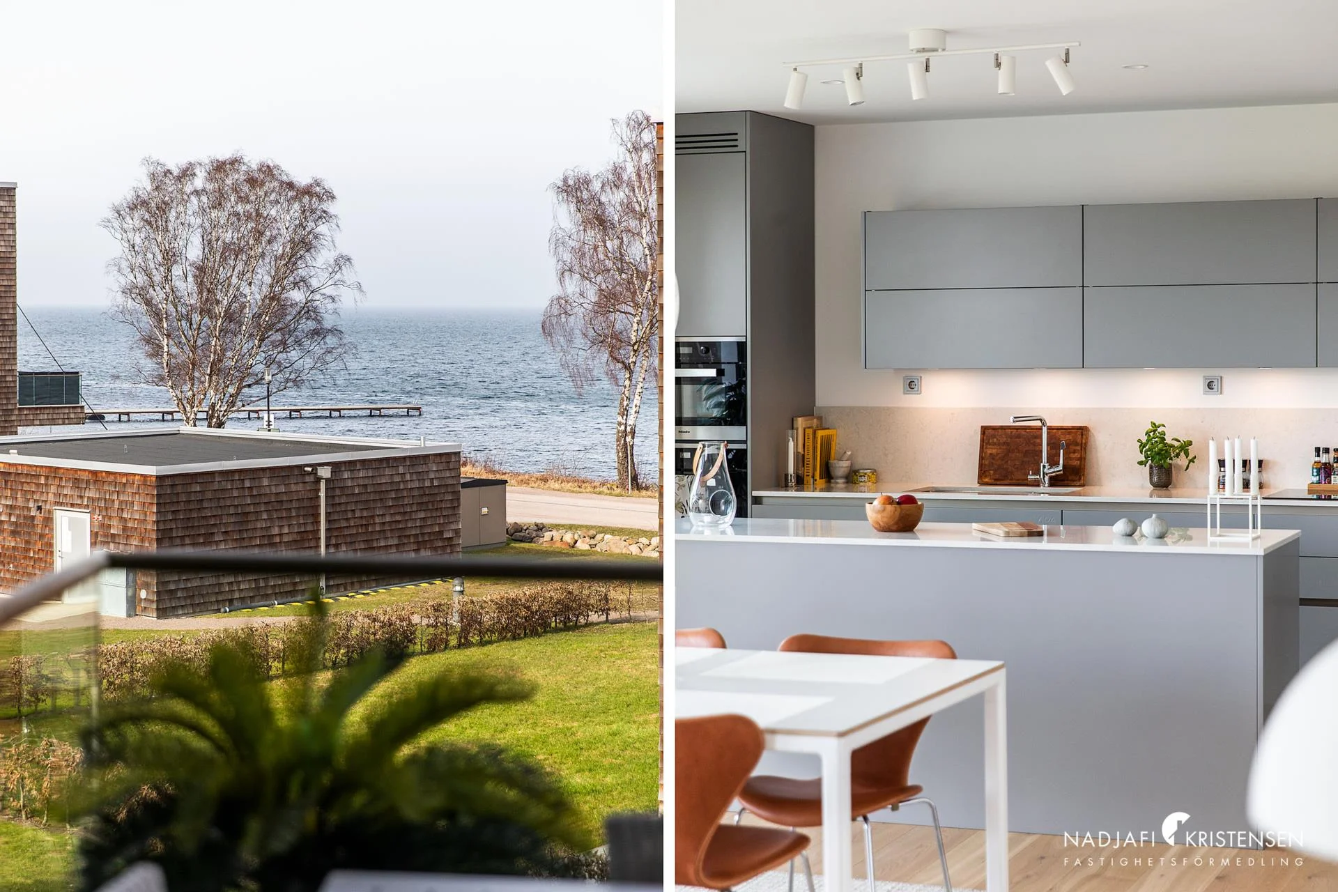 Bostaden präglas av ljus, rymd och genomtänkta materialval där stora glaspartier suddar ut gränsen mellan inne och ute. Det generösa sällskapsrummet med öppet kök och köksö blir hemmets självklara samlingspunkt – perfekt för både vardag och sociala tillställningar. Köket, från VIDA, går i stilrent ljusgrått och kompletteras av påkostade vitvaror från Miele samt exklusiva detaljer som spishäll från Bora och bänkskiva i stenkomposit.