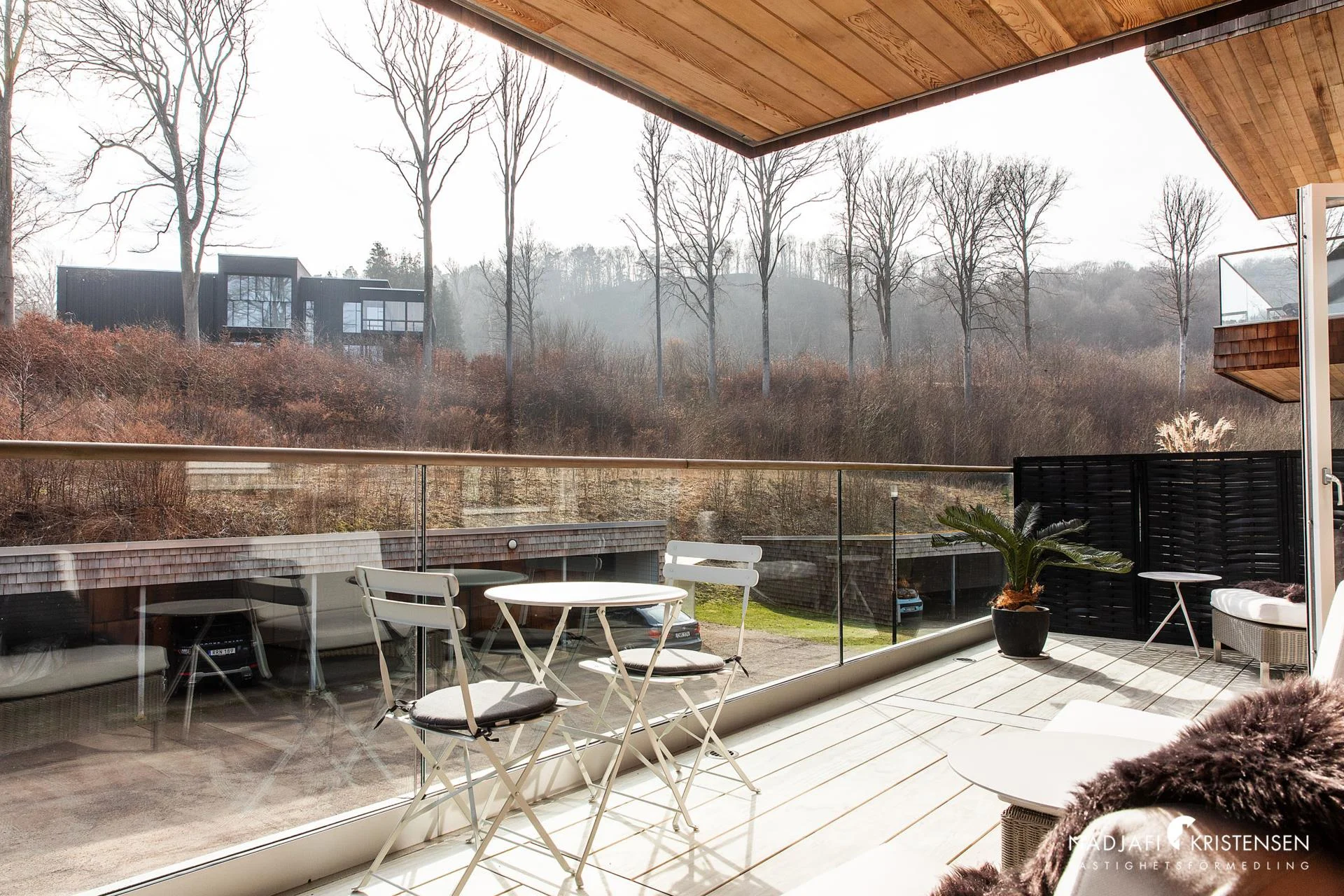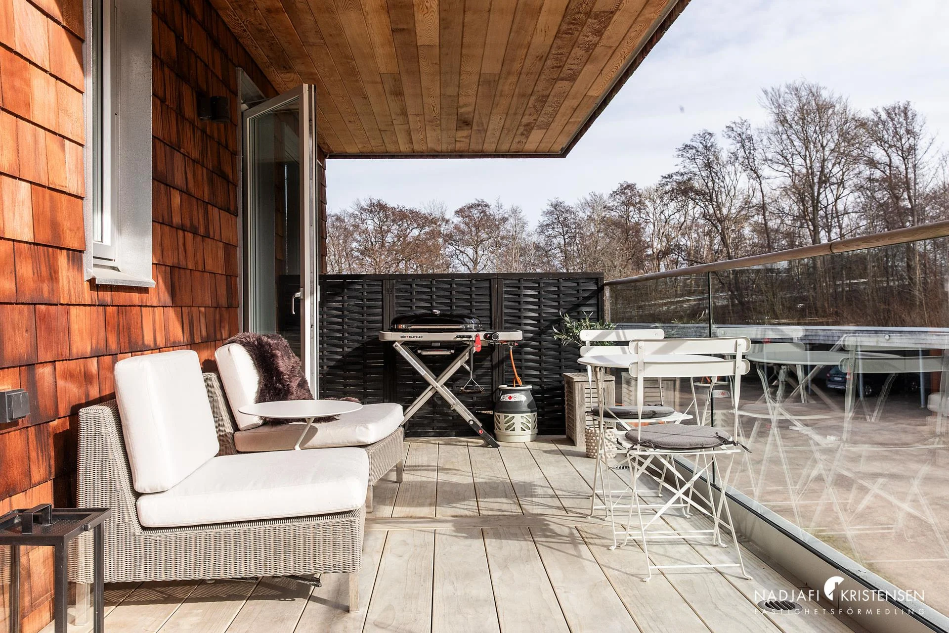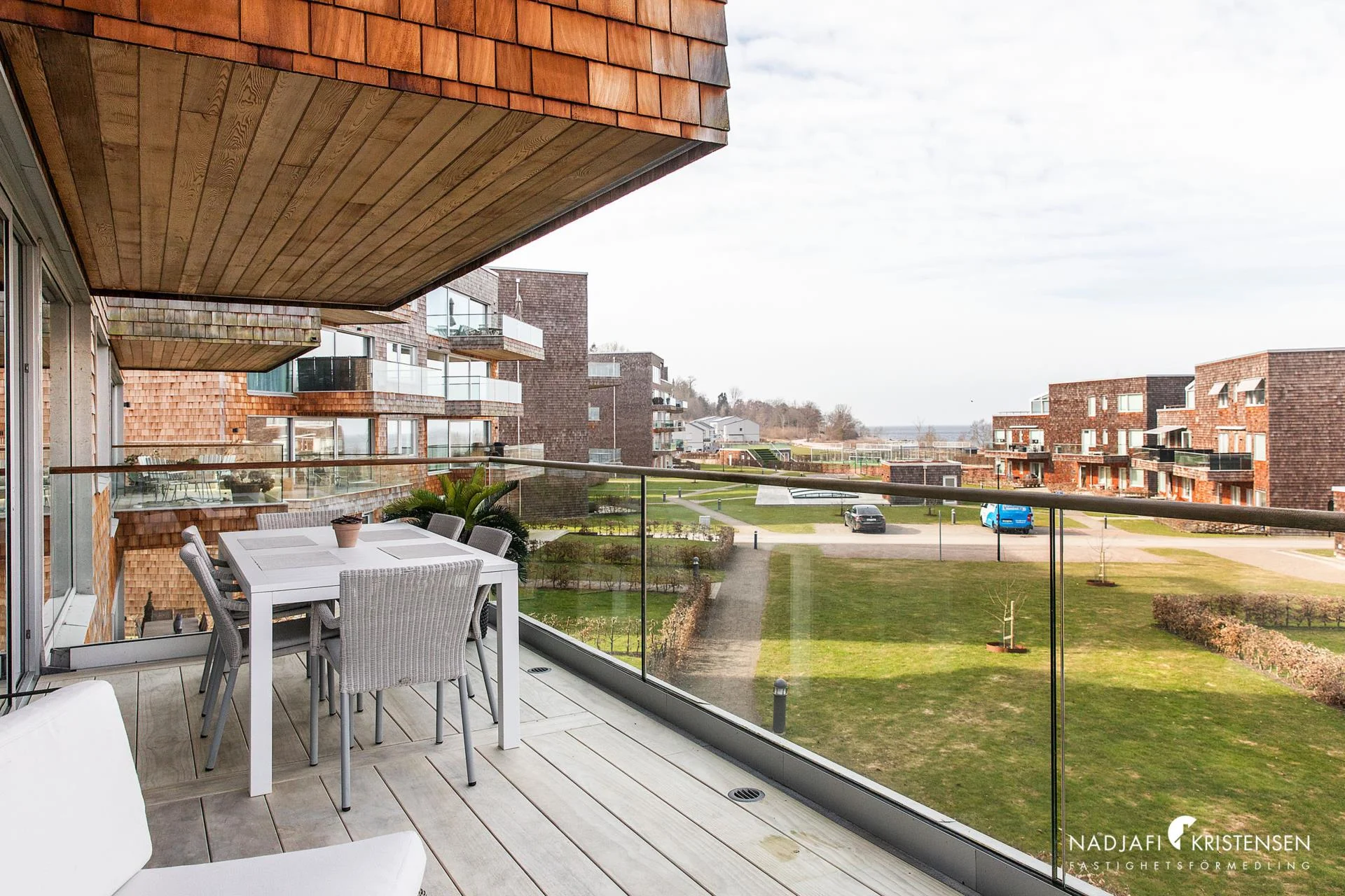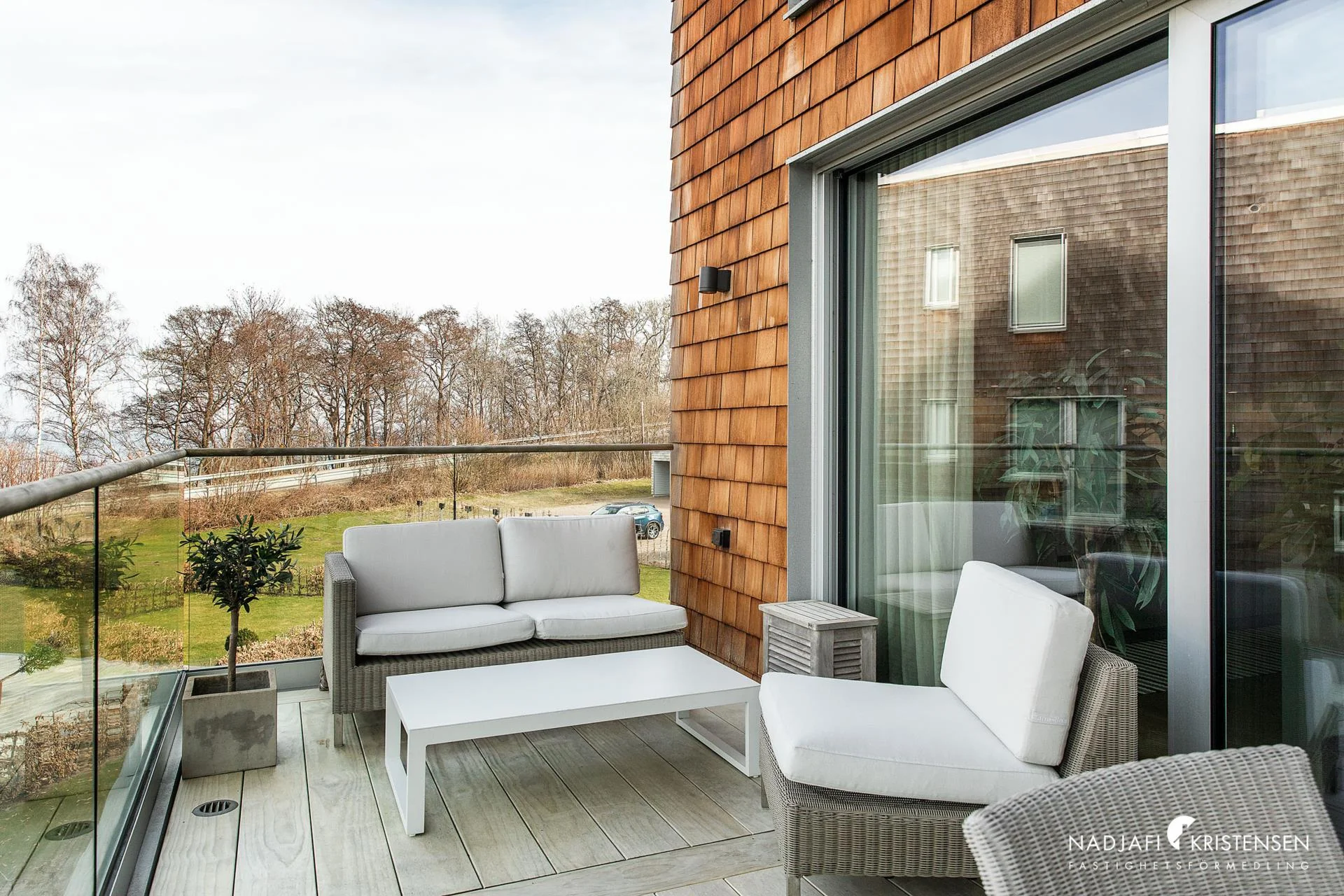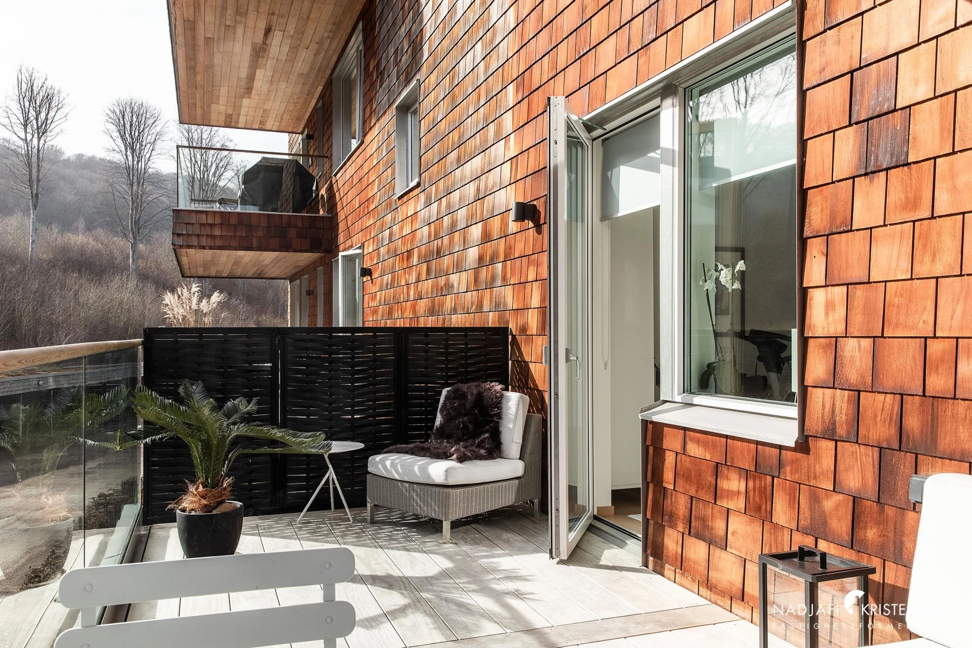 Från vardagsrummet nås en av bostadens två generösa balkonger – en magisk plats med utsikt över havet. Den andra balkongen i söderläge nås från båda sovrummen och erbjuder sol större delen av dagen. Här samsas komfort och kvalitet med Accoya-trall som förhöjer känslan av ett exklusivt kustboende.