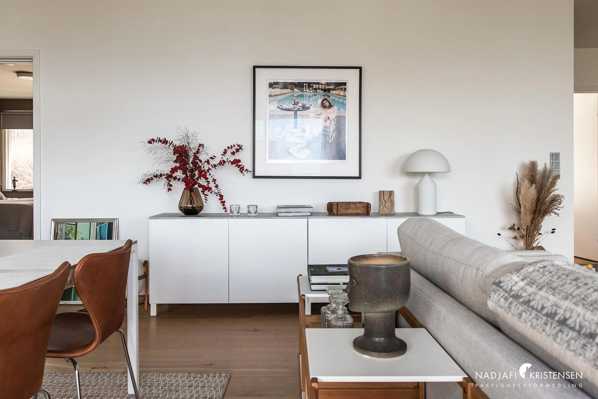 Genomgående vitlaserad ekparkett och rena linjer skapar en tidlös och lugn atmosfär, där varje detalj är noggrant utvald för att ge ett bekymmersfritt och exklusivt boende.
