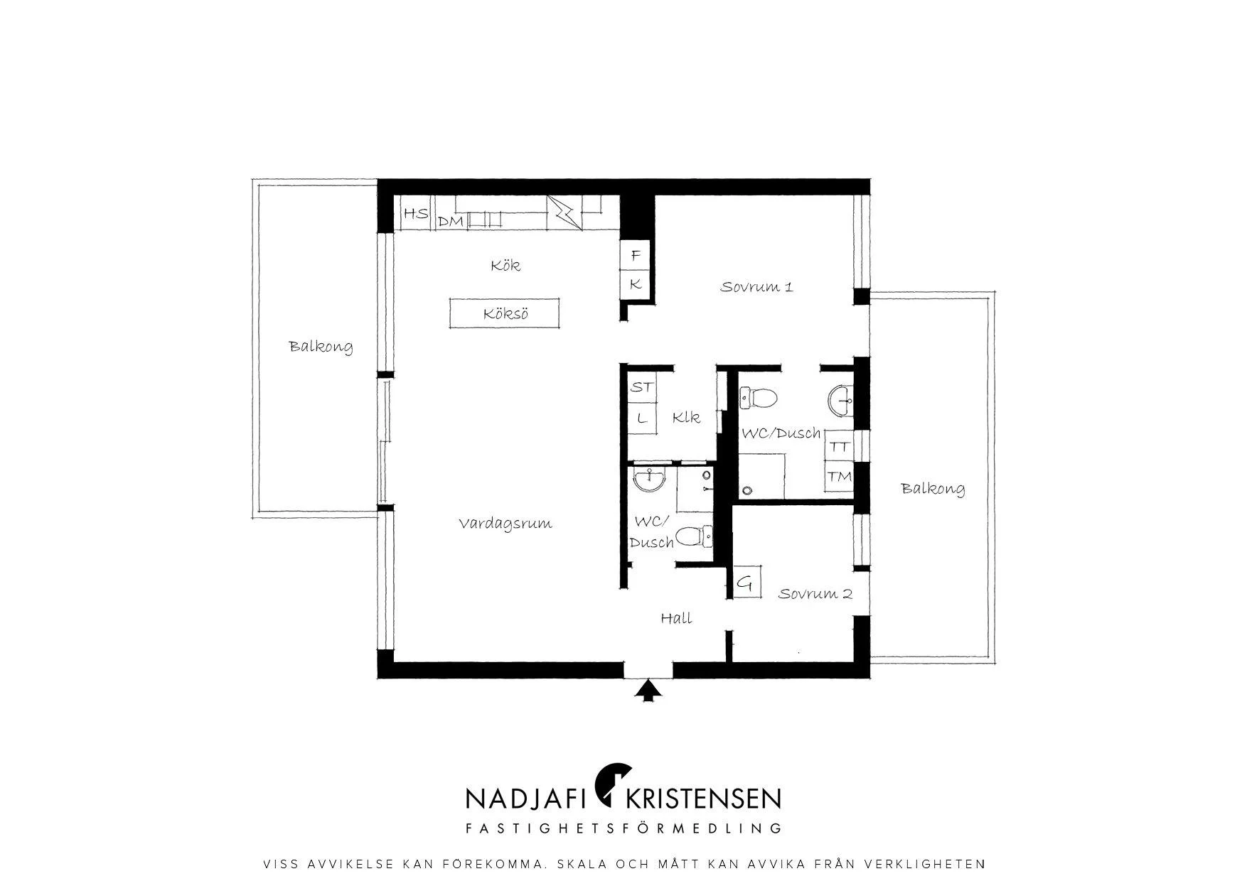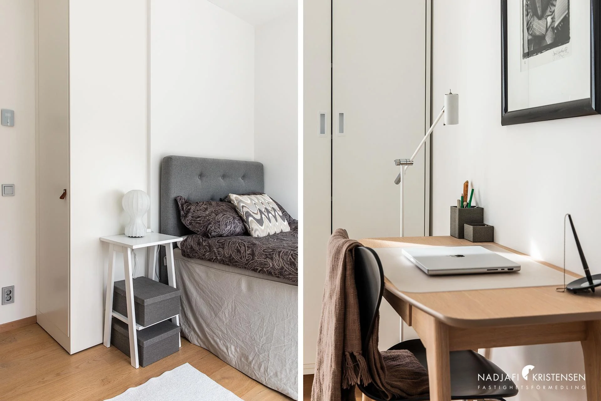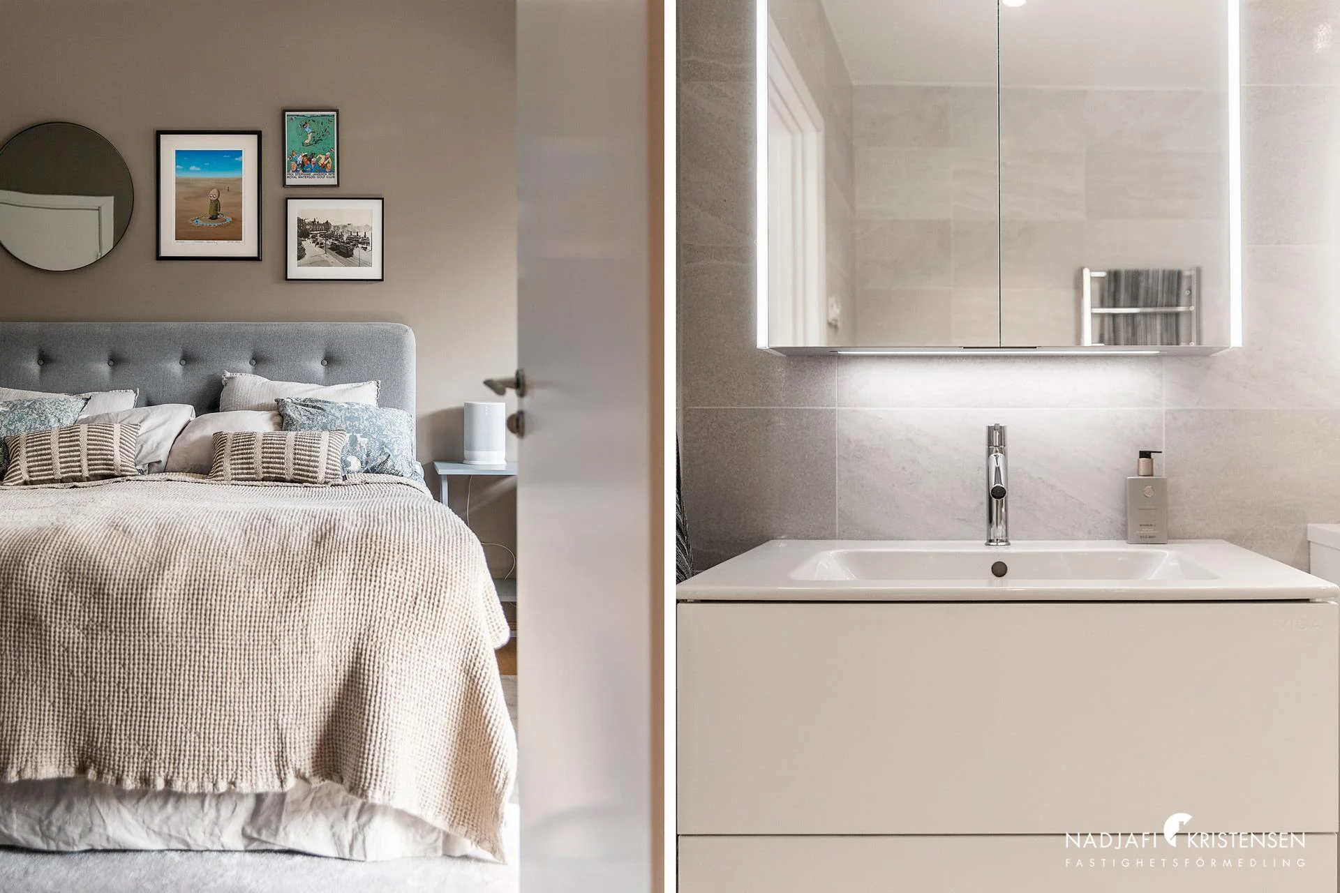Lägenheten rymmer två rymliga sovrum, där master bedroom erbjuder både walk-in-closet och ett elegant badrum en suite. Ytterligare ett stilrent badrum finns i anslutning till hallen. Båda badrummen är smakfullt inredda med granitkeramik i harmoniska toner, utrustade med regndusch, handdukstork samt inredning från Duravit. Här finns även tvättavdelning med maskiner från Miele.