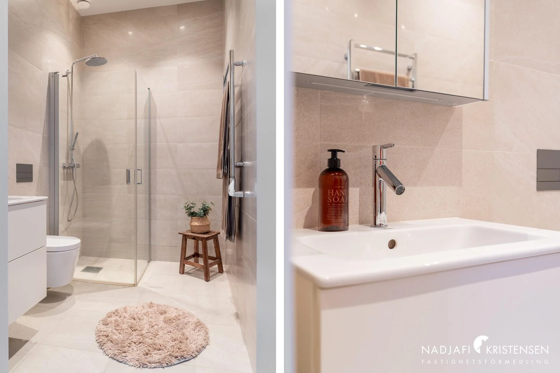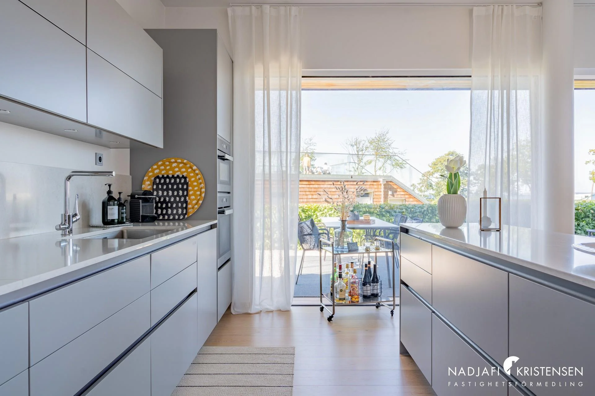 Vi har nu nöjet att presentera en våning på markplan med vackra vyer ut mot hav och området i sin helhet. Väl inne i lägenheten möts ni inledningsvis av hallen följt av stora sociala och öppna ytor med plats för både soffgrupp och matplats samt det stilfulla och fullutrustade VIDA-köket med bänkskiva i stenkomposit. Genomgående hög standard med vitlaserat enstavs ekparkettgolv, golvvärme och skjutdörrspartier från Schüco till altanen. Master-bedroom med goda förvaringsmöjligheter i form av en klädkammare samt ingång till det egna helkaklade badrummet med granitkeramik i samma ton på såväl väggarna som golvet med kuvertfall i duschen, här finns även tvätt- och torkmaskin. Det andra sovrummet har också en platsbyggda garderob och en utgång till altanen i söderläge, likt Master-bedroom. Båda altanerna är väl tilltagna och klädda i lyxig Accoya för bästa komfort. Intill hallen och det andra sovrummet finns det andra badrummet som går i samma stil som det andra.