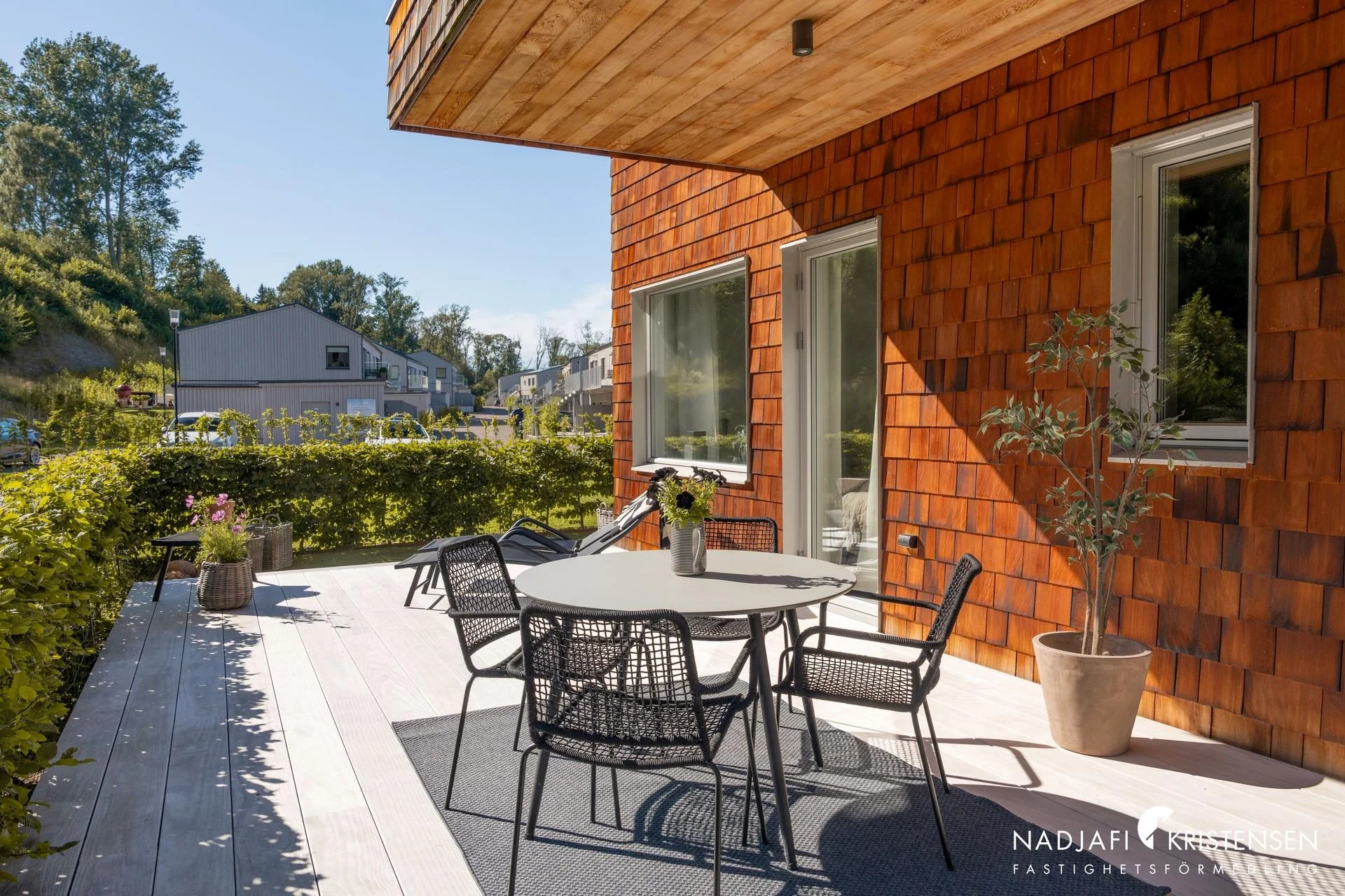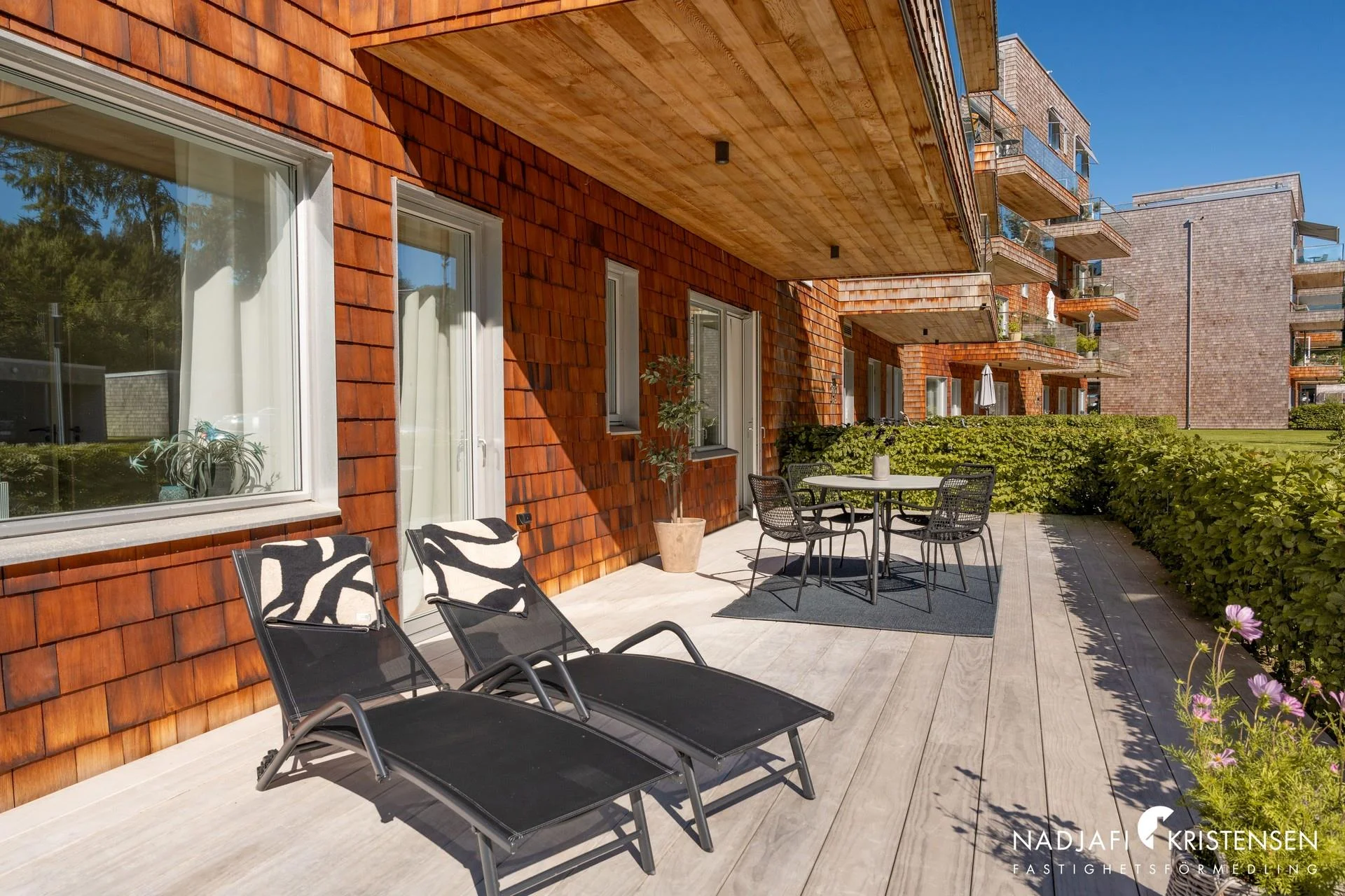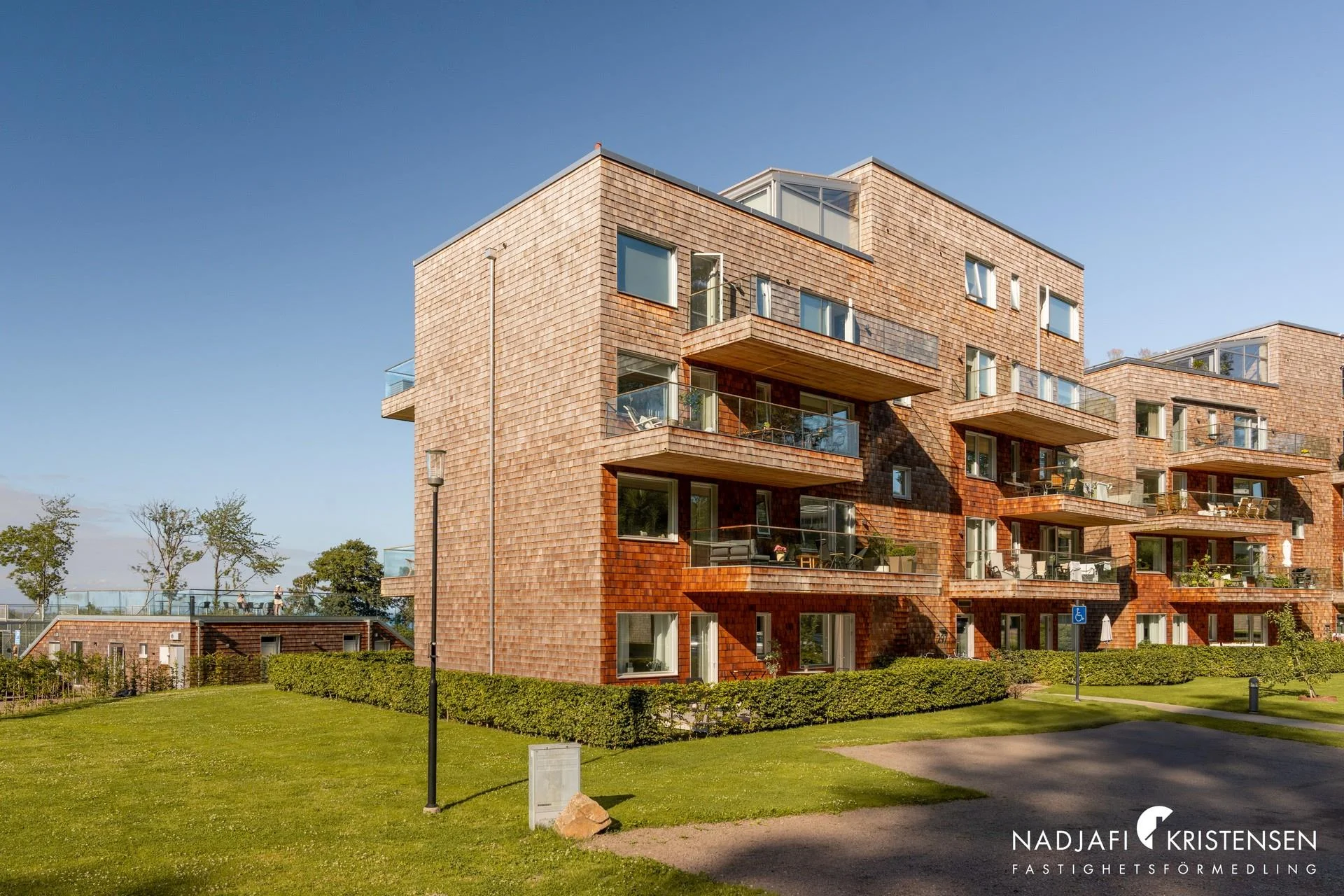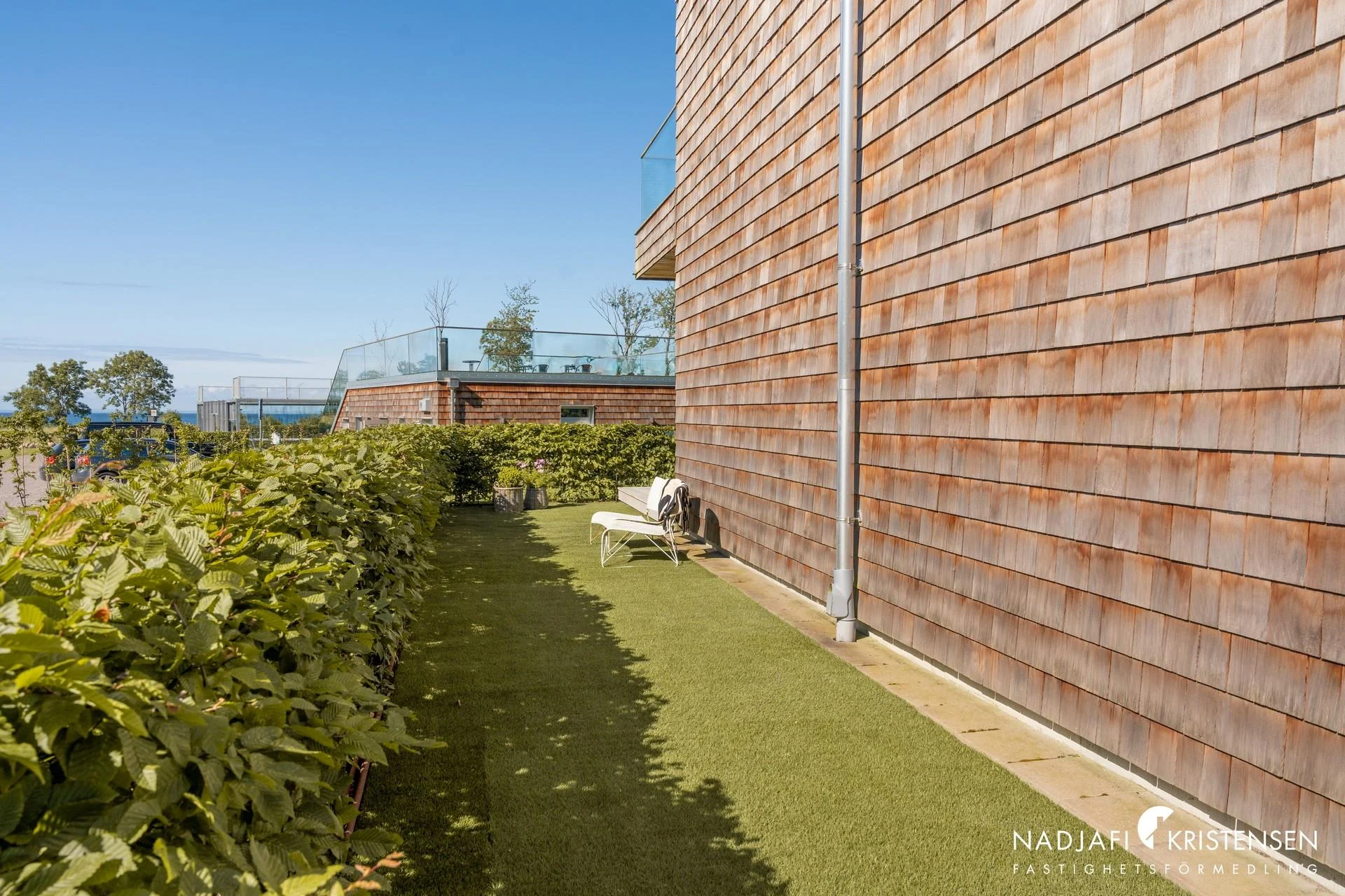Fasader av cederträ som smälter in fint med omgivningen.