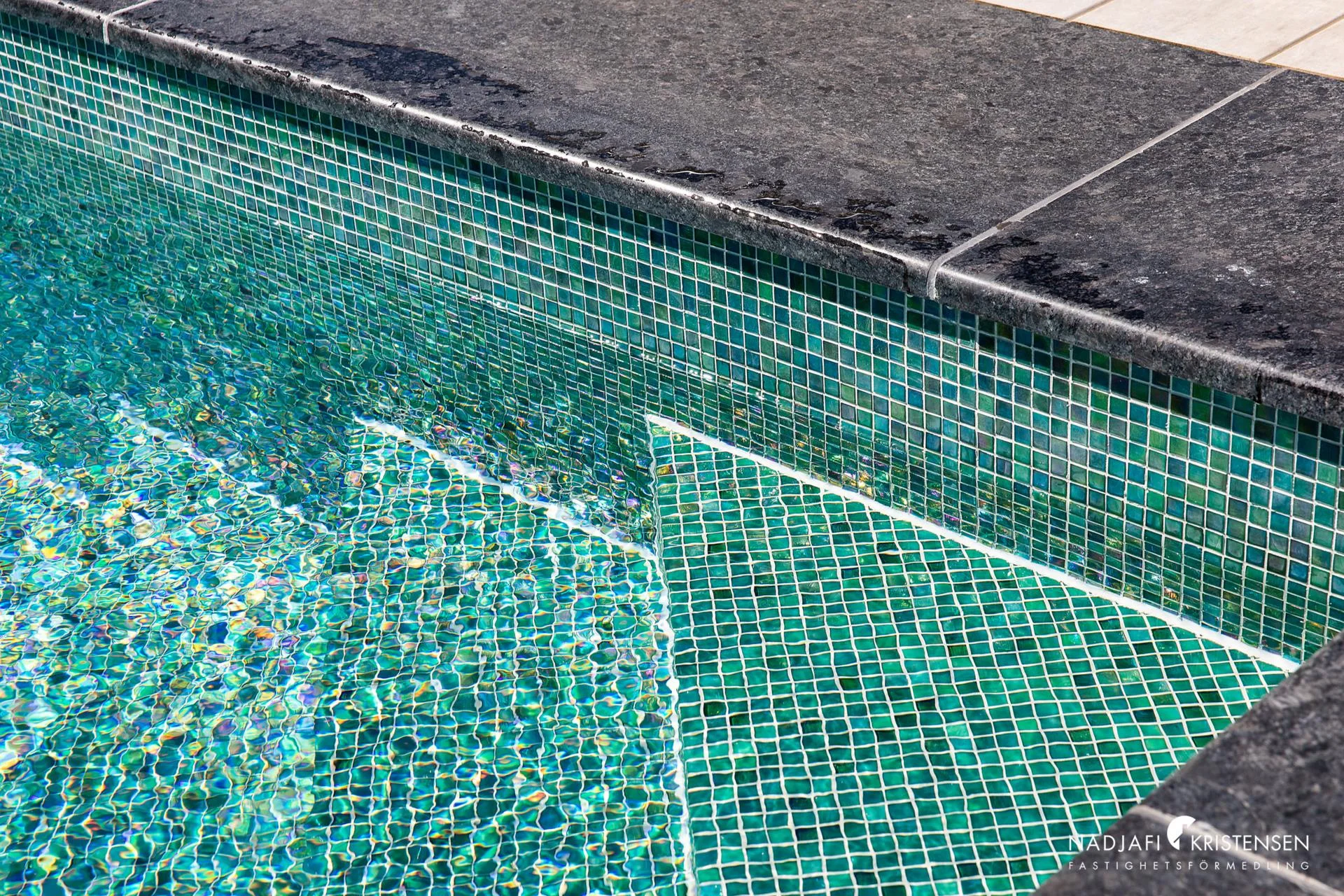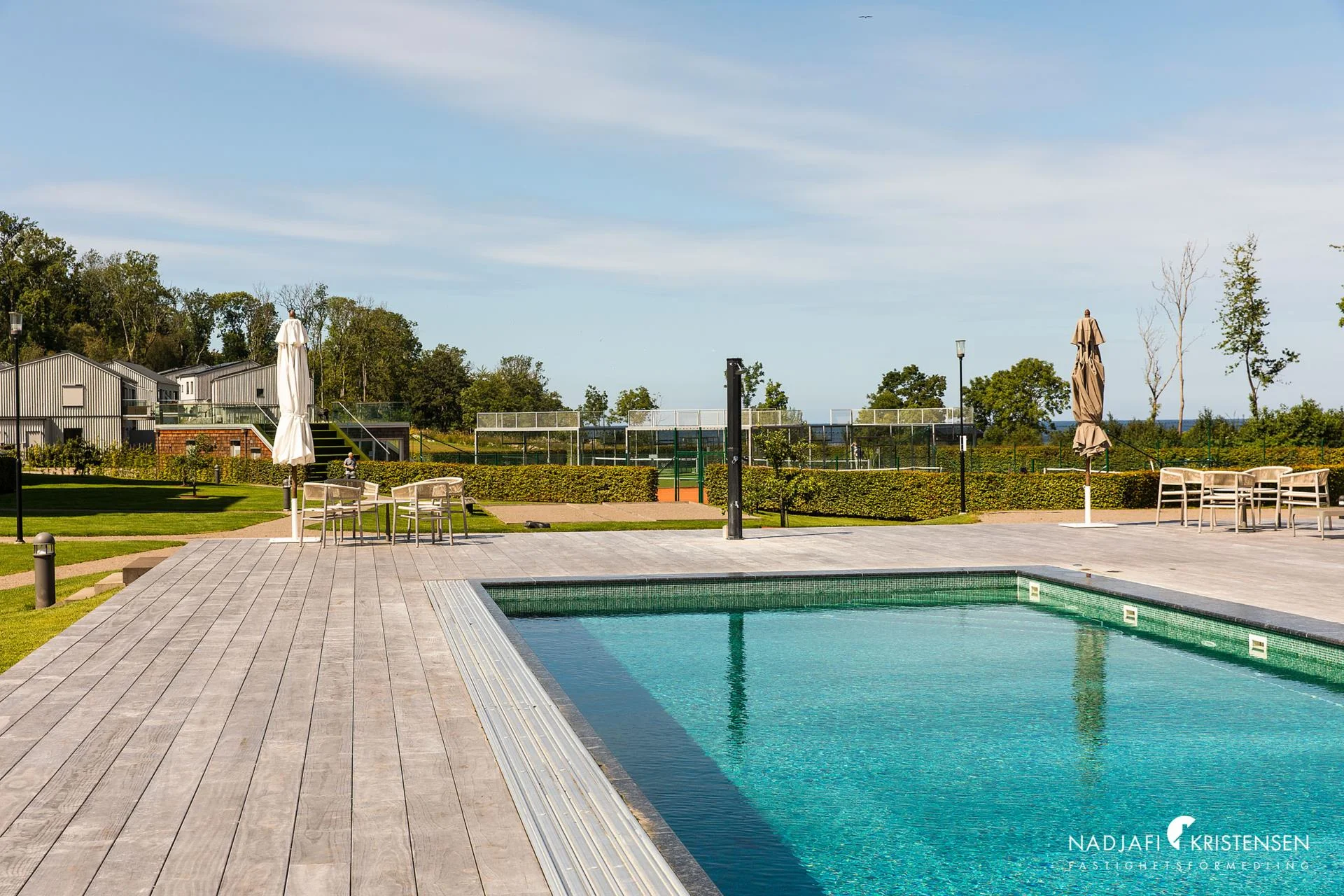 Faciliteter som poolområde med en uppvärmd pool (16x8 meter) samt ett spabad. Poolen är omgiven av trädäck i träslaget Accoya och invid poolen finns ett poolhus med relaxrum, bastu och wc/dusch.