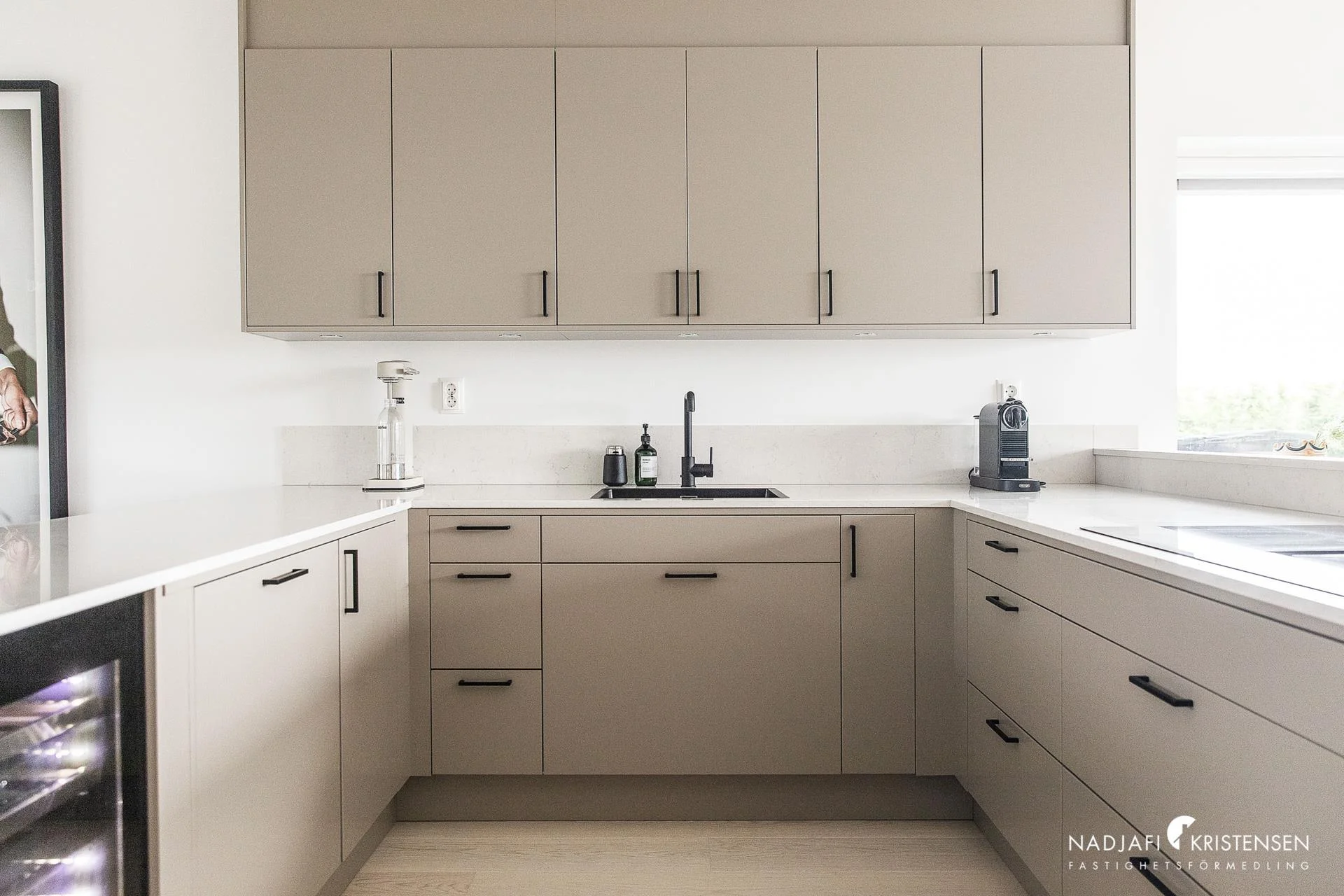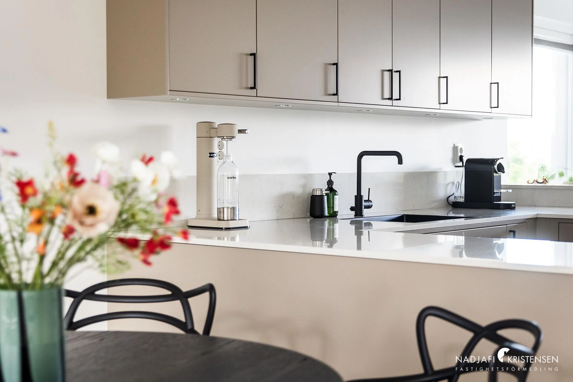 Redan på framsidan möts du av en charmig och svalkande uteplats, perfekt för morgonkaffet i solen eller en stilla stund i skuggan. När du kliver in öppnar sig ett luftigt hem där kök och matplats smälter samman i öppen planlösning – ett stilrent kök i varm beige ton, med svarta detaljer och full maskinell utrustning, inklusive vinkyl och inbyggd mikro vilket skapar en självklar samlingspunkt för både vardag och fest.