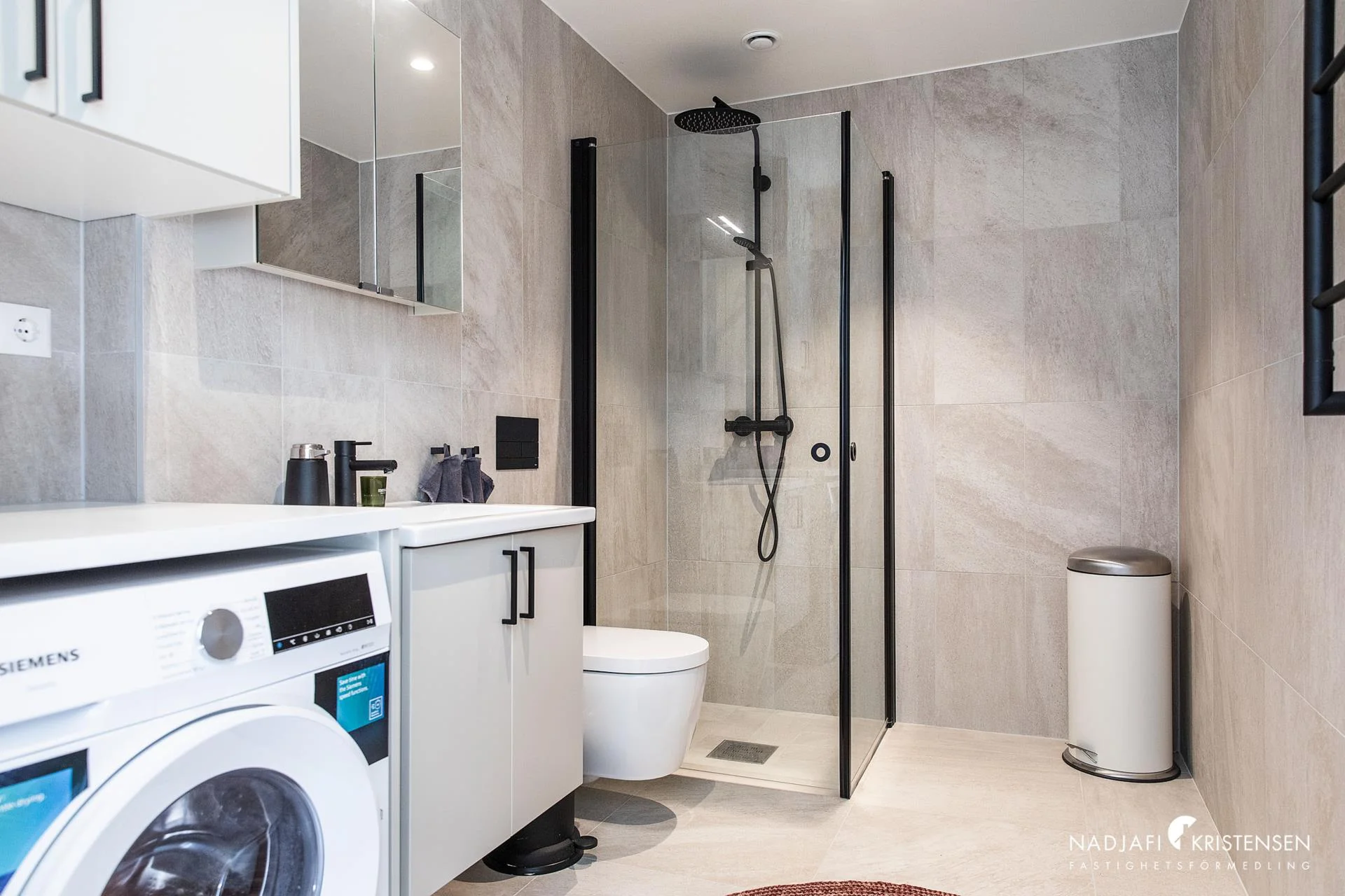 Lägenhetens sovrum ligger i rofyllt läge mot havet, med inbyggda garderober och möjlighet till mörkläggning bakom eleganta gardinskenor. Det helkaklade badrummet är en liten spa-oas i sig, med stilrena färger, dusch bakom glasdörrar och en praktisk tvättmaskin med torkfunktion.