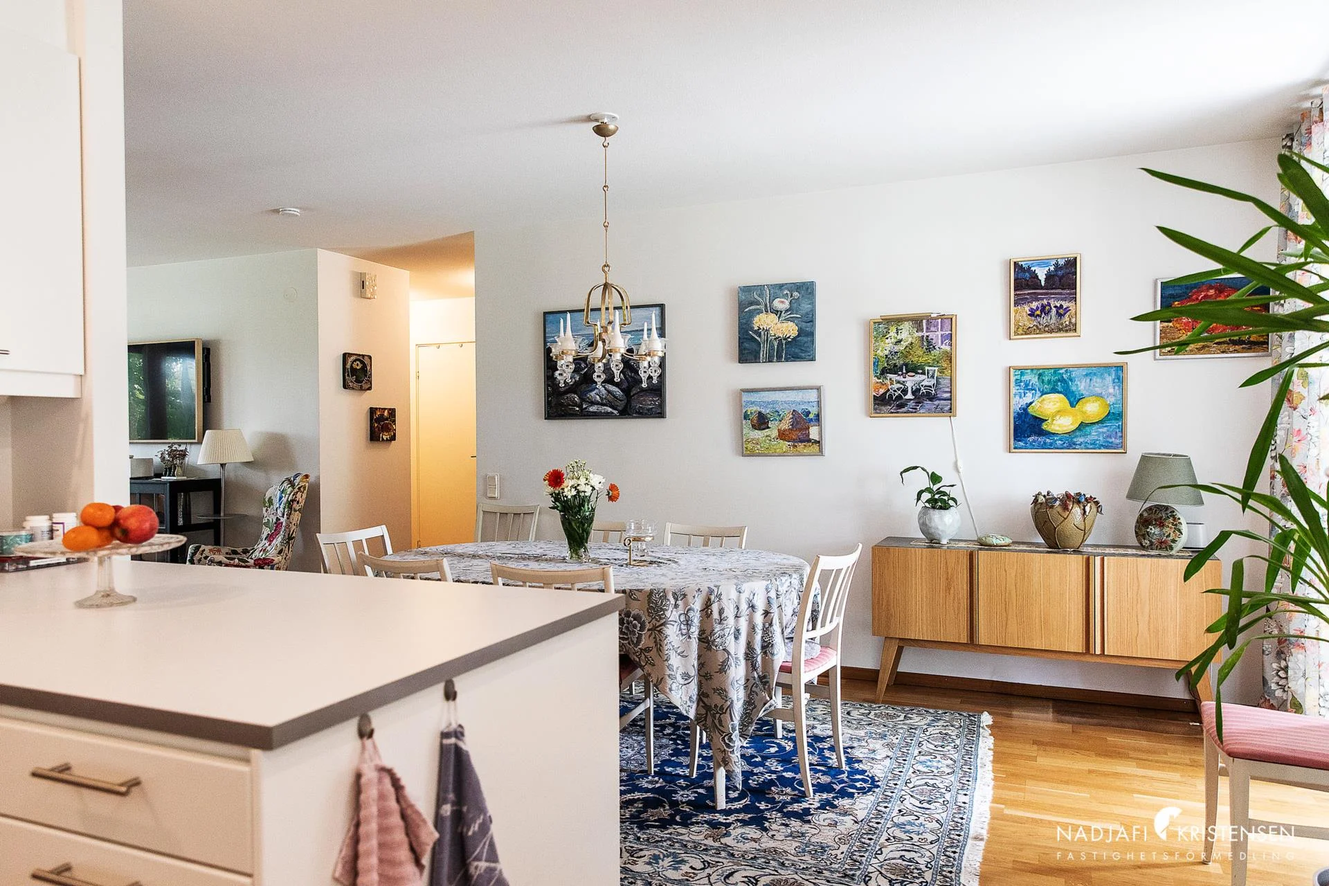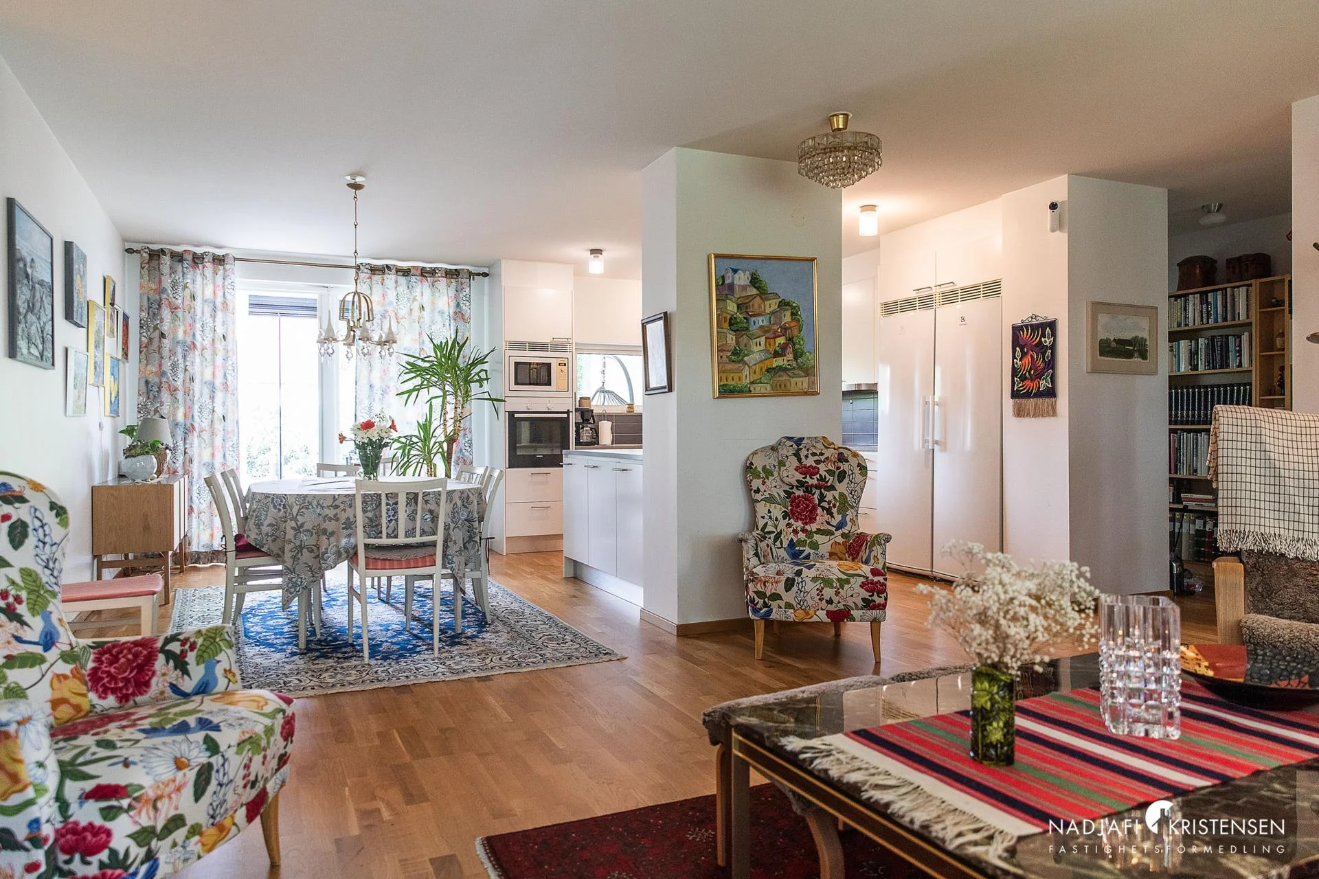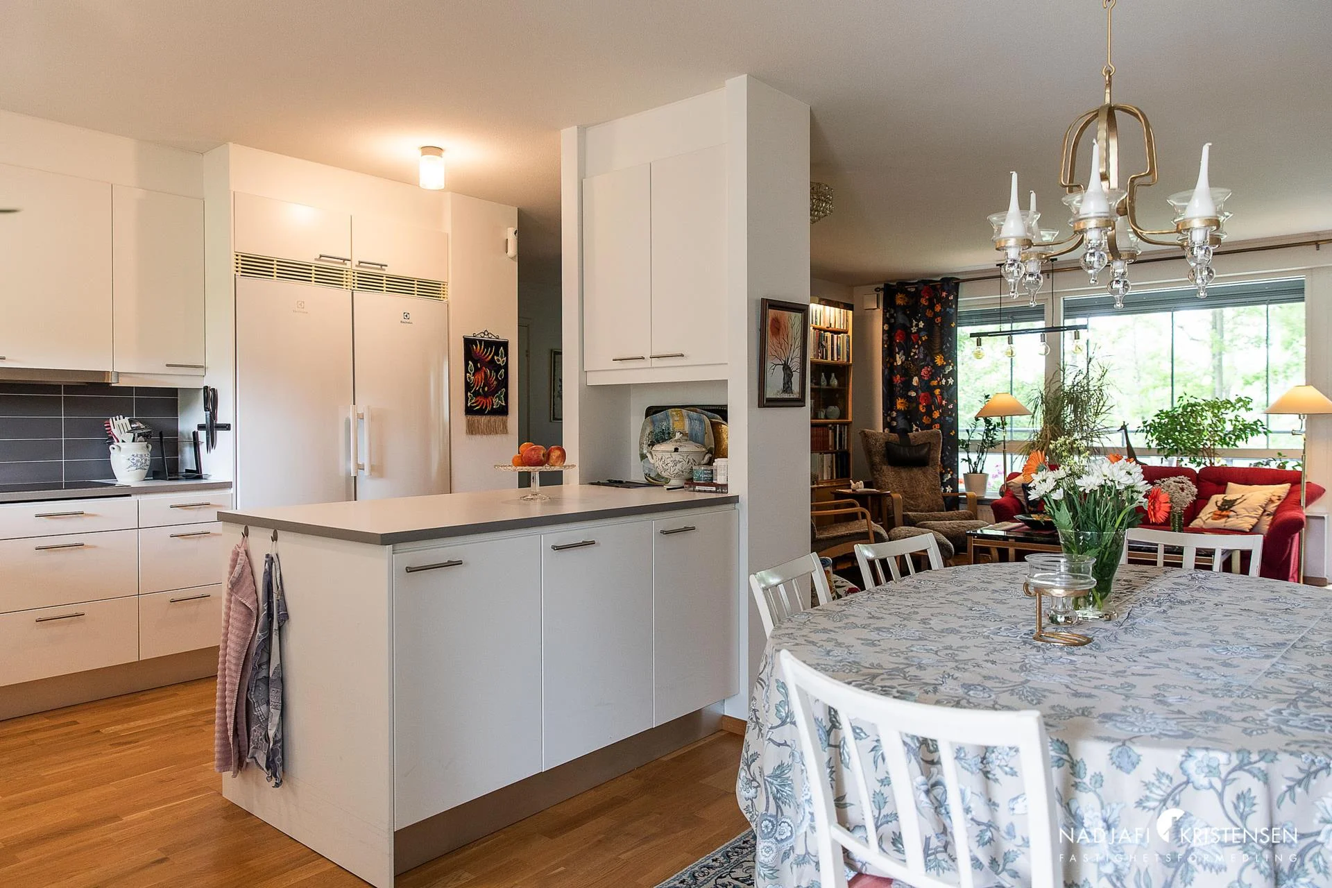 - Här bor du med generöst ljusinsläpp, genomgående parkettgolv och öppna sociala ytor mellan kök med köksö, matplats, vardagsrum och de två altanerna med sol både på dagen och kvällen.