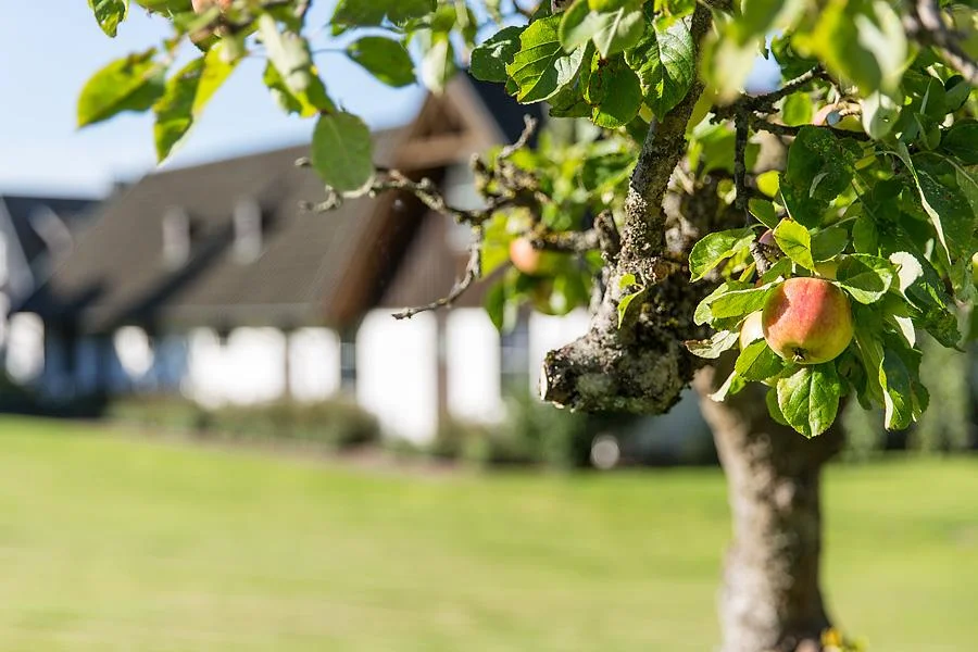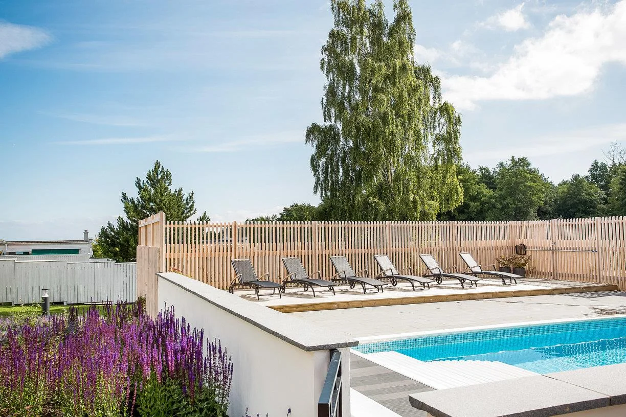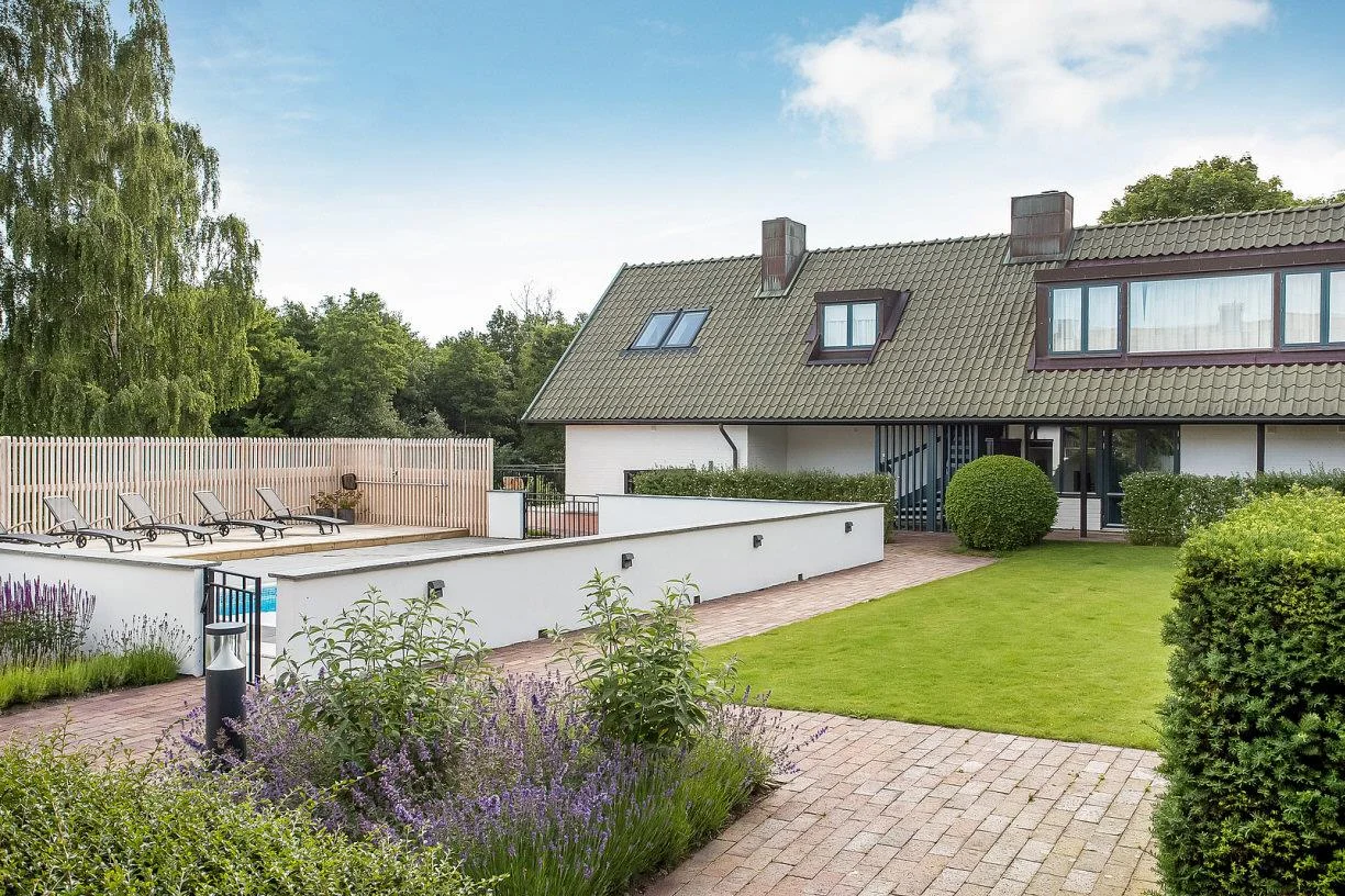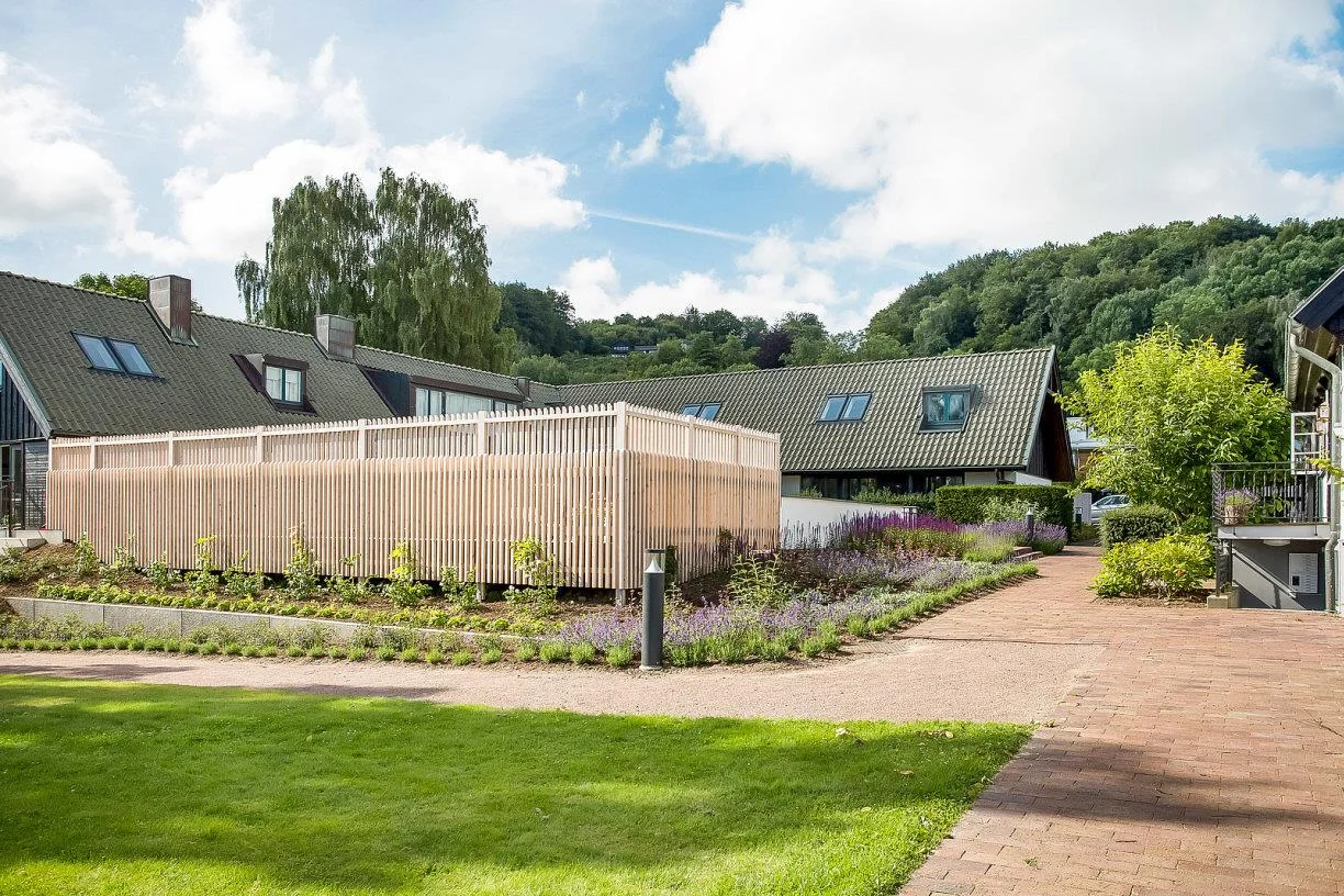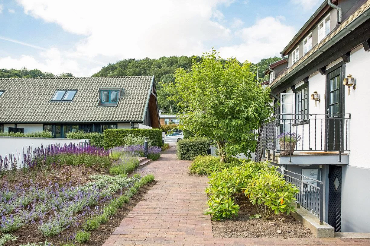 Vid varje lägenhet finns en egen trädgårdsplats. Dessa gröna rum är avgränsade privata ytor där de boende får sätta sin egen prägel på utemiljön. En grön stomme av bokhäckar skärmar av samtidigt som den binder ihop och skapar ett enhetligt intryck kring hela fastigheten. Den egna trädgårdsplatsen finns i direkt anslutning till lägenheten och med närhet eller i direkt anslutning till där poolen ligger och känslan blir att man har en större trädgård utanför lägenheten. Nedanför området ligger en av Båstads populäraste badbryggor, Paulins brygga, samt två tennisbanor som man har tillgång till.