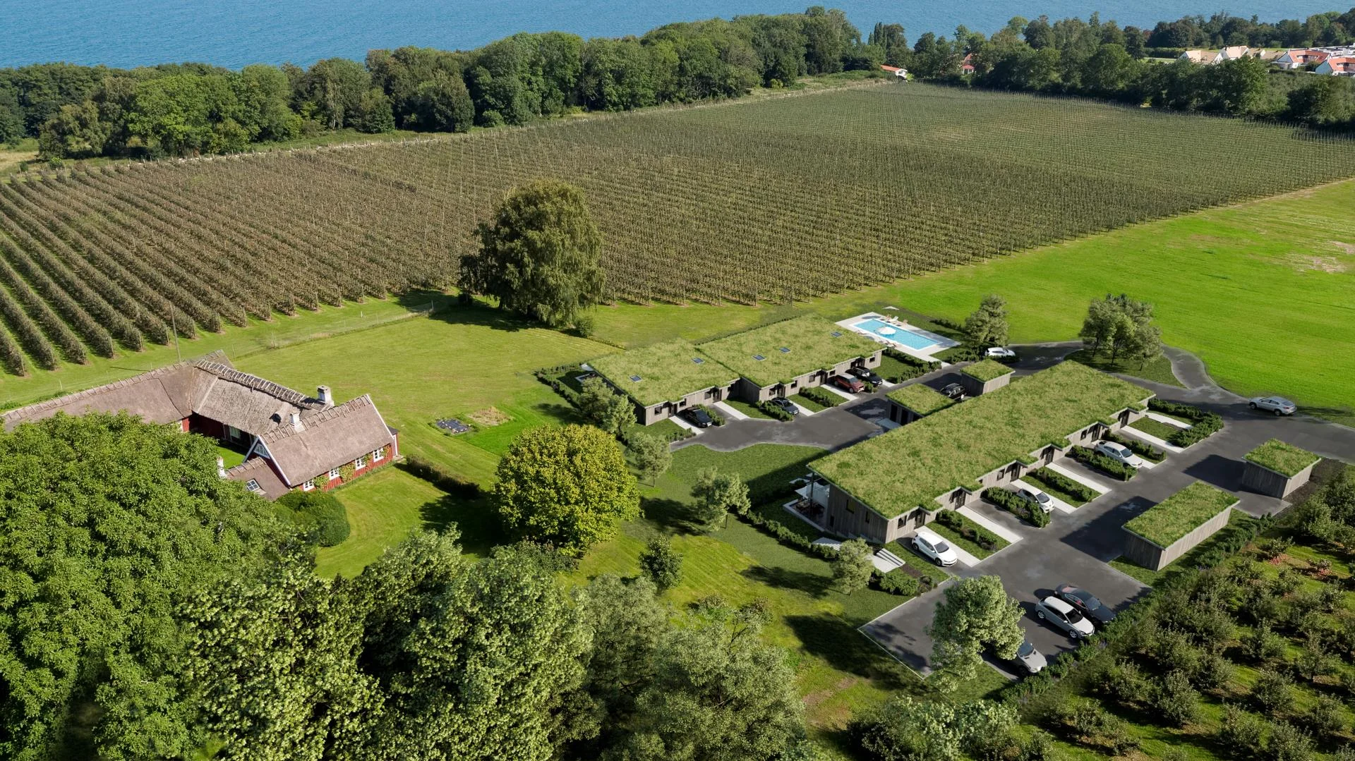 Med exklusiva materialval i standard och eget lyxigt poolområde har man lyckats skapa ett modernt bostadskoncept som smälter in i den vackra och dyrbara omgivningen, samtidigt som man lyckats behålla landskapets linjer och uttryck med bland annat sedumtäckta tak.