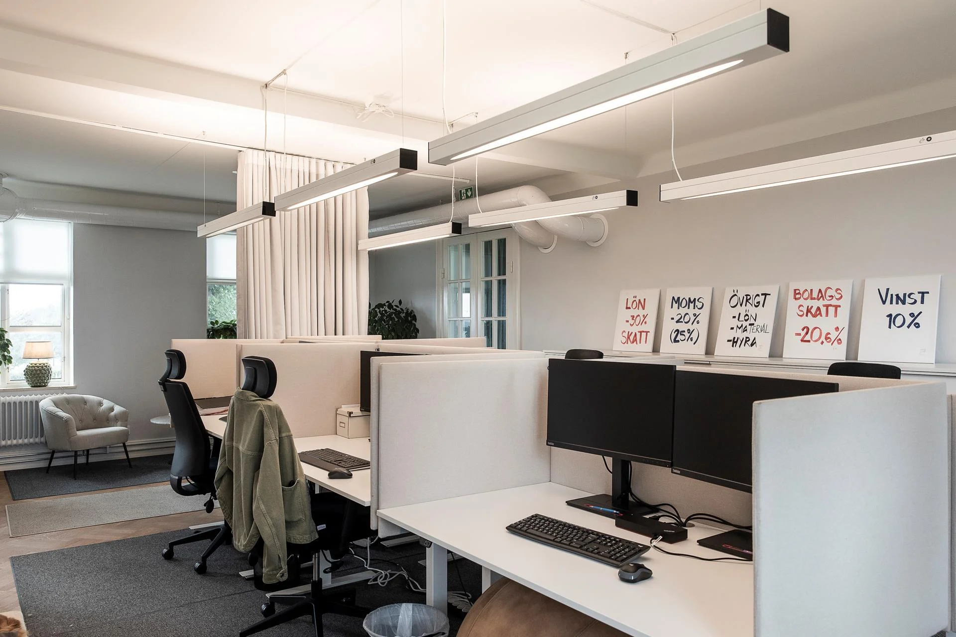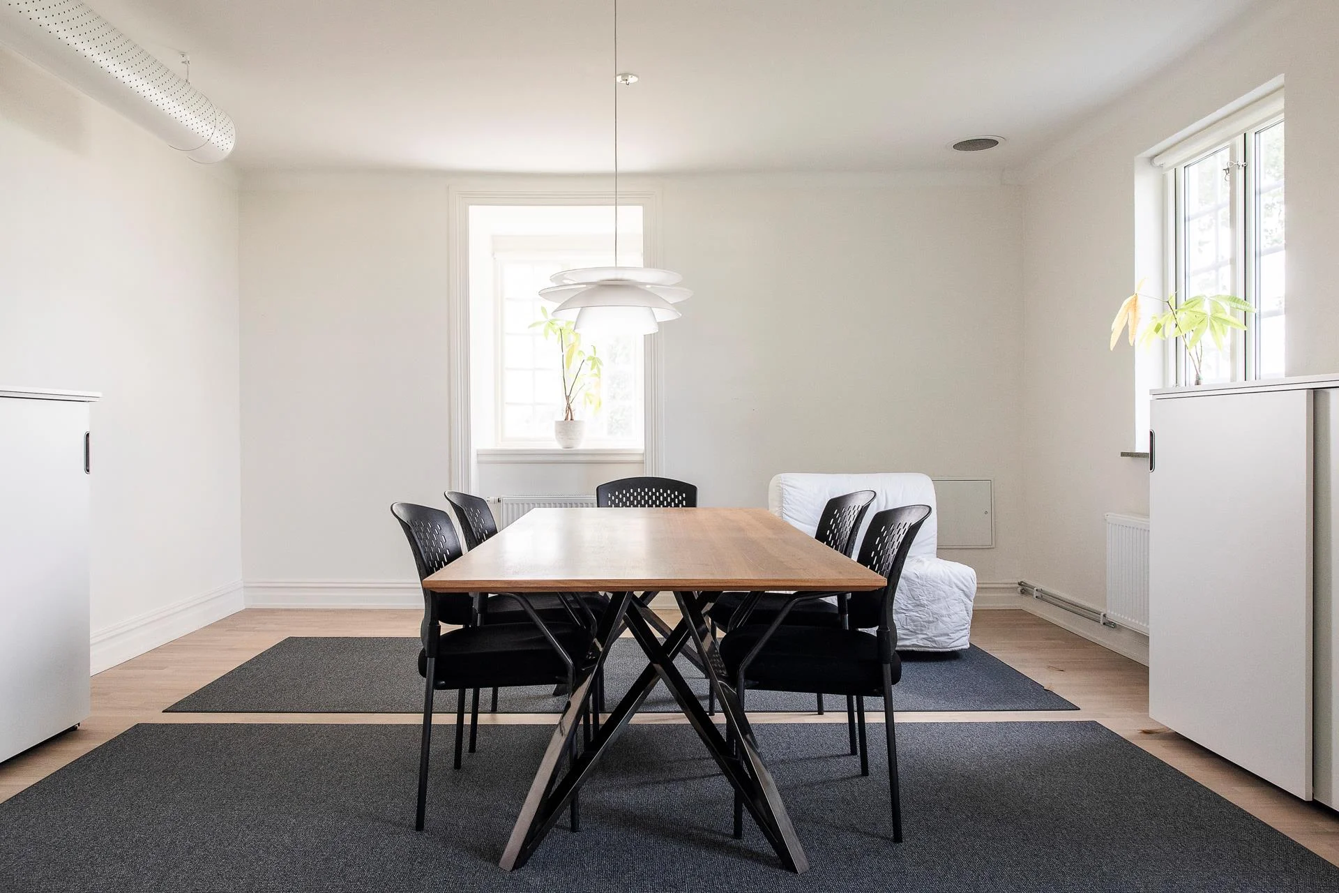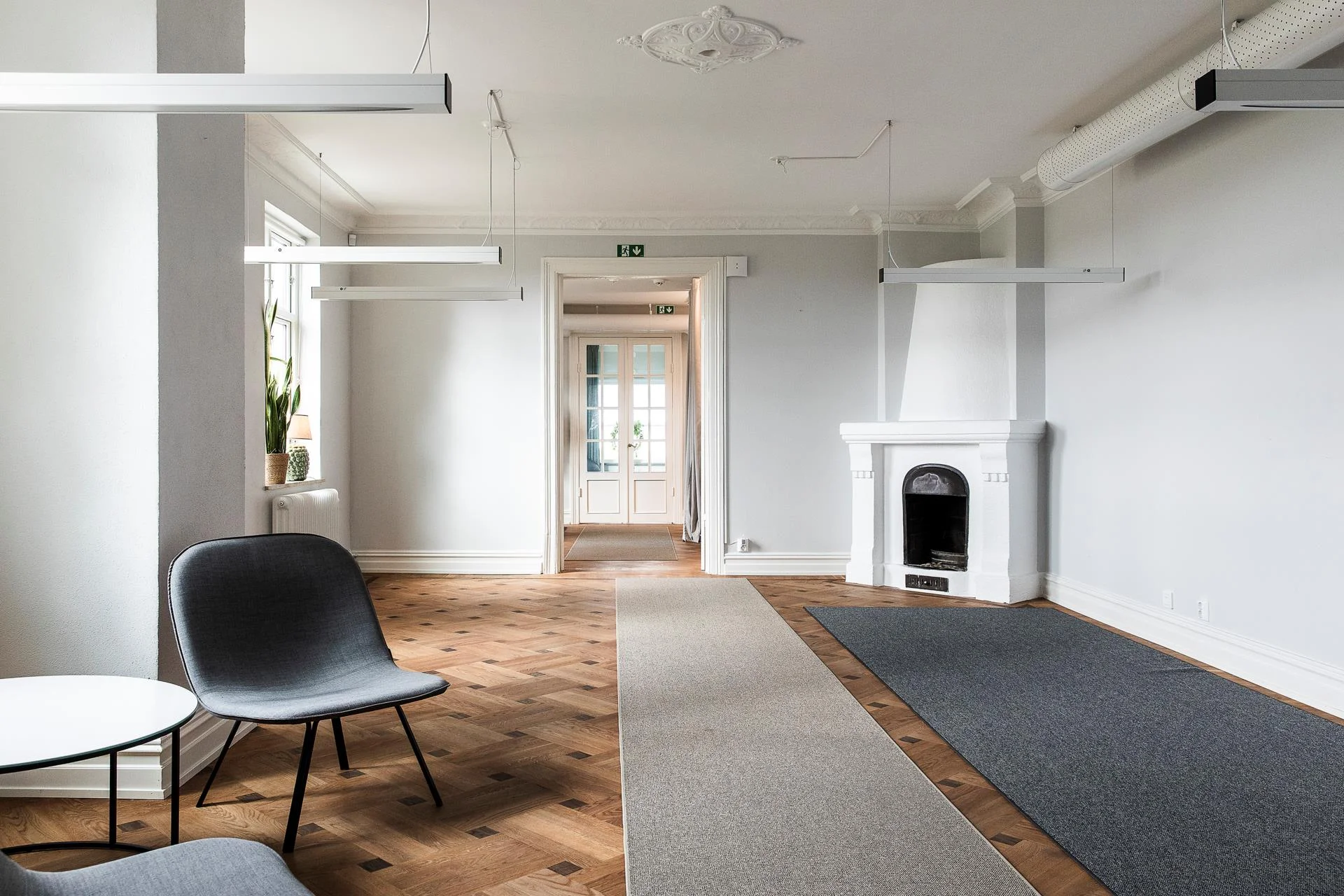 En generös trappa leder upp till ovanvåningen där ljusa kontorsrum och mötesrum samsas med goda förvaringsmöjligheter. Här finns även badrum och WC samt utgång till balkong. Planlösningen rymmer både mindre arbetsrum för 1–2 personer och större mötesrum för upp till 6 personer, vilket skapar stor flexibilitet.
