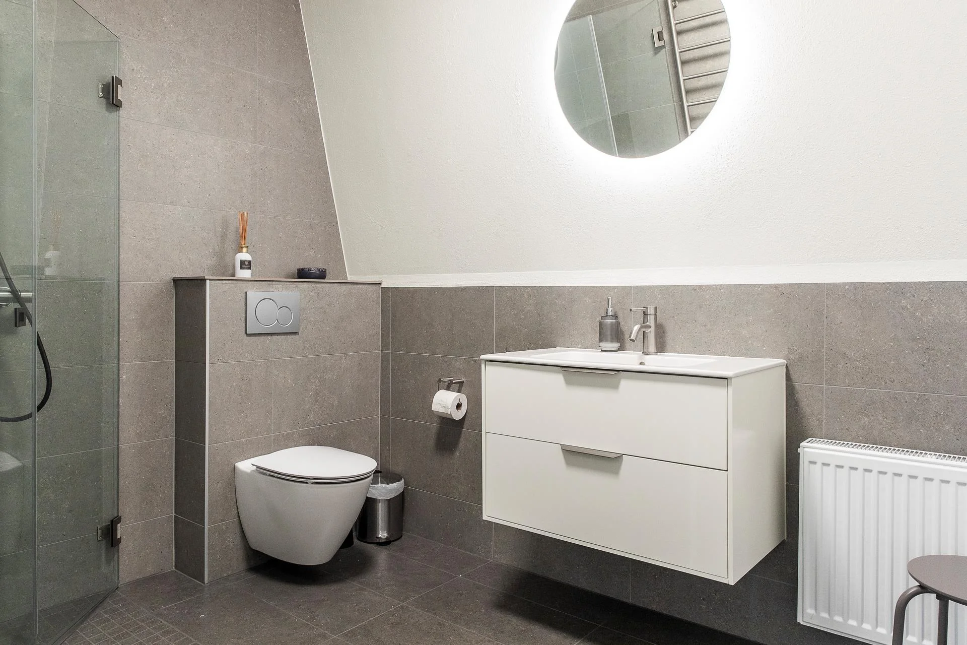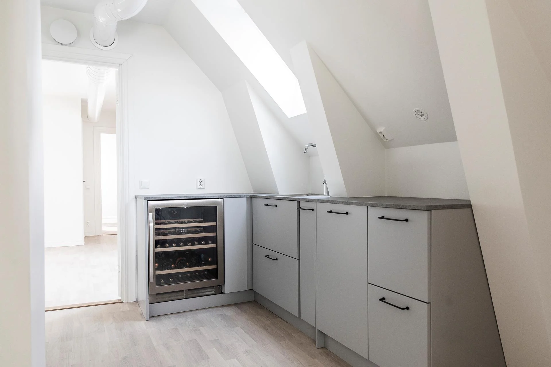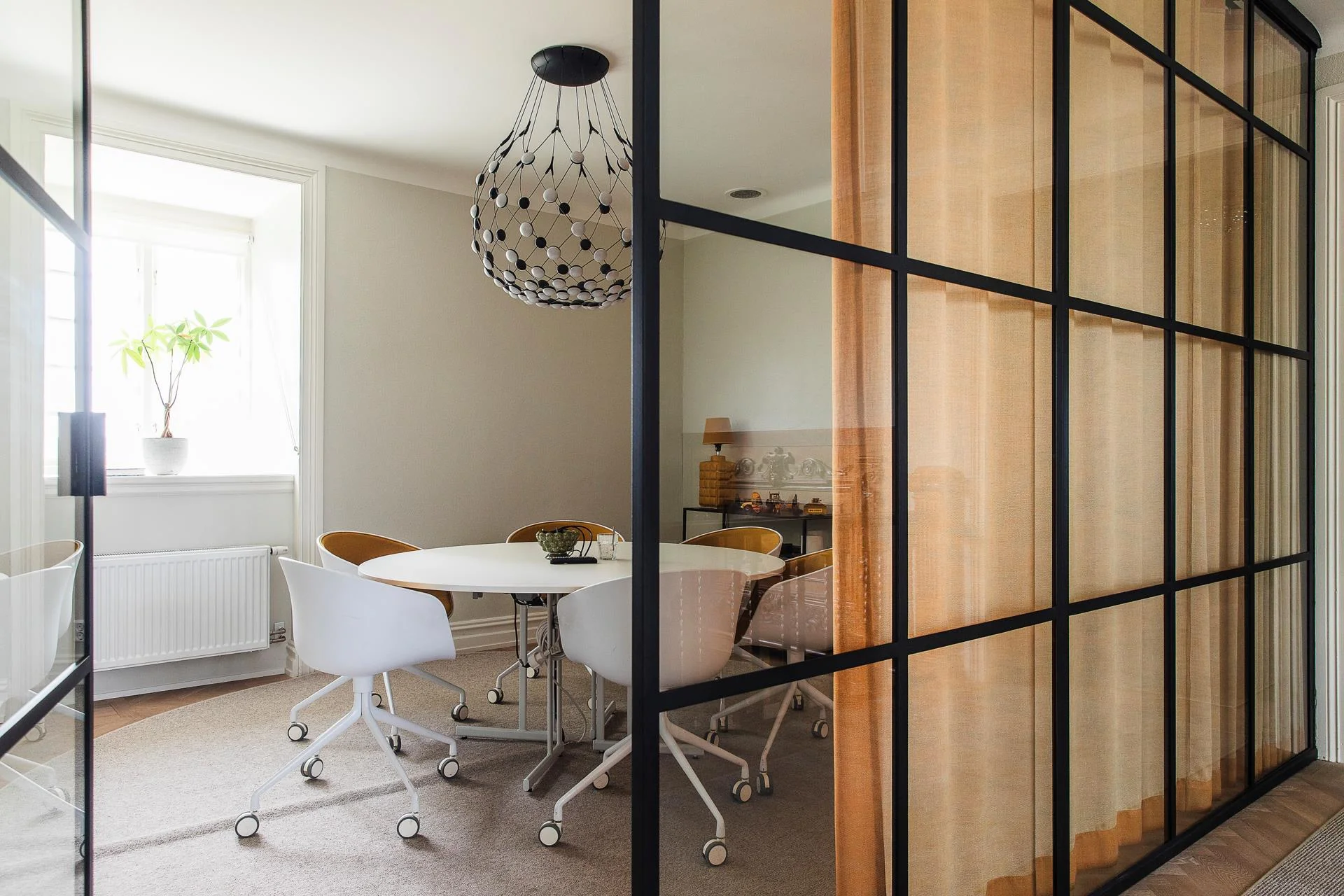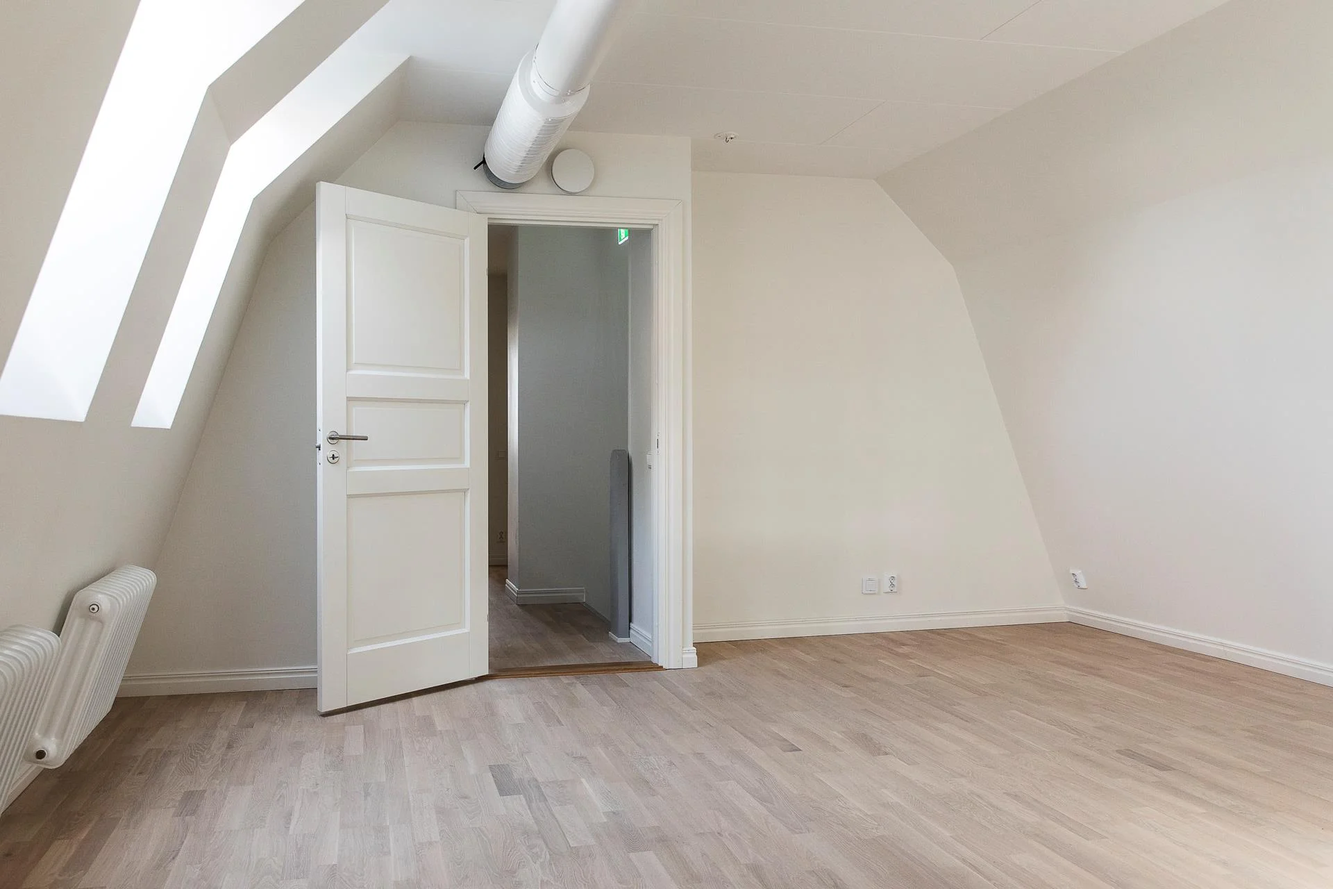 En generös trappa leder upp till ovanvåningen där ljusa kontorsrum och mötesrum samsas med goda förvaringsmöjligheter. Här finns även badrum och WC samt utgång till balkong. Planlösningen rymmer både mindre arbetsrum för 1–2 personer och större mötesrum för upp till 6 personer, vilket skapar stor flexibilitet.