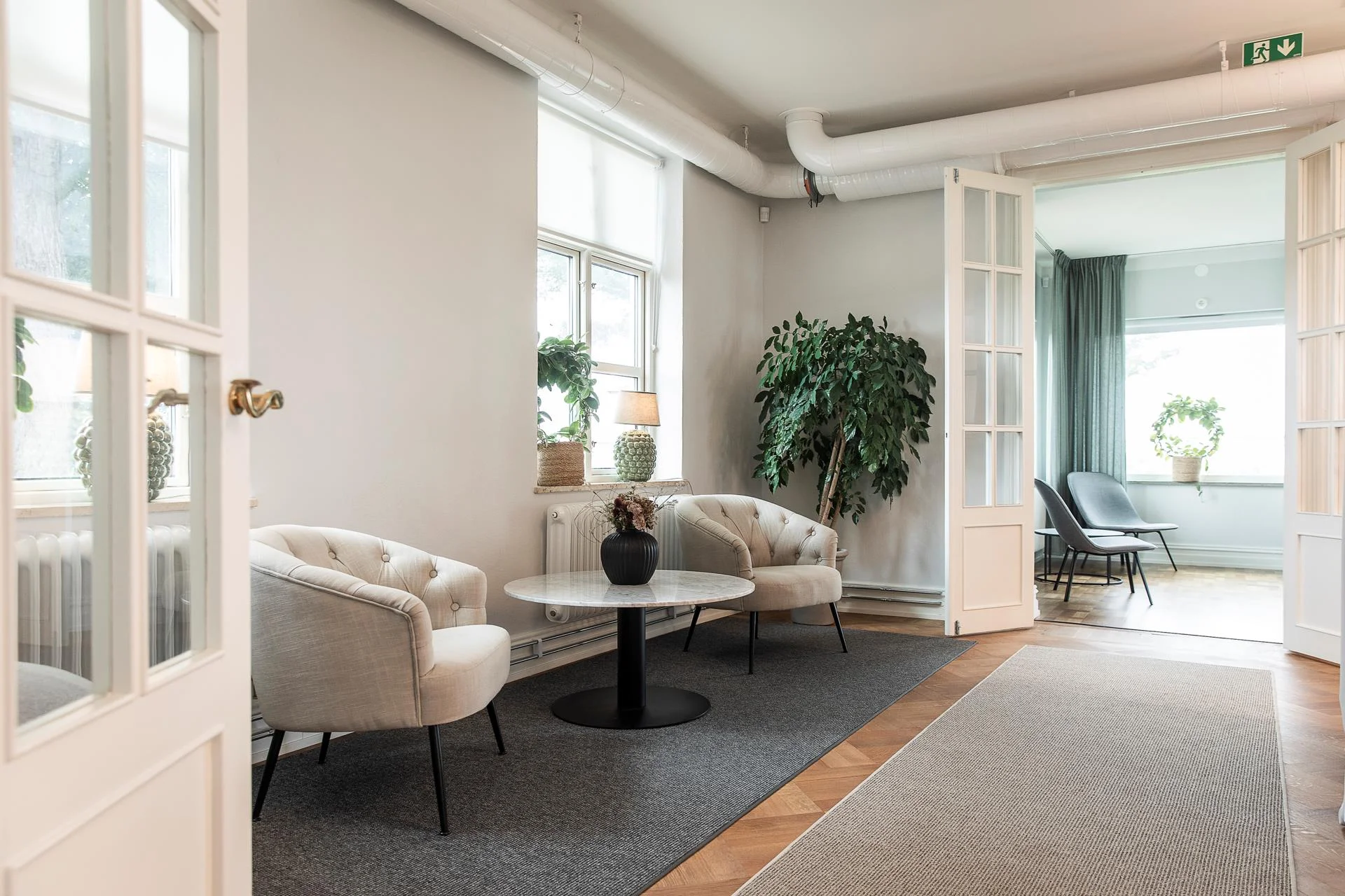 Välkomnande huvudentré med gott om utrymme för avhängning. Härifrån når man flera kontorsrum av olika storlek, mötesrum samt en rymlig matsal med tillhörande kök och serveringsrum. I anslutning finns även kapprum, flera WC, tvättstuga samt förvaringsutrymmen.