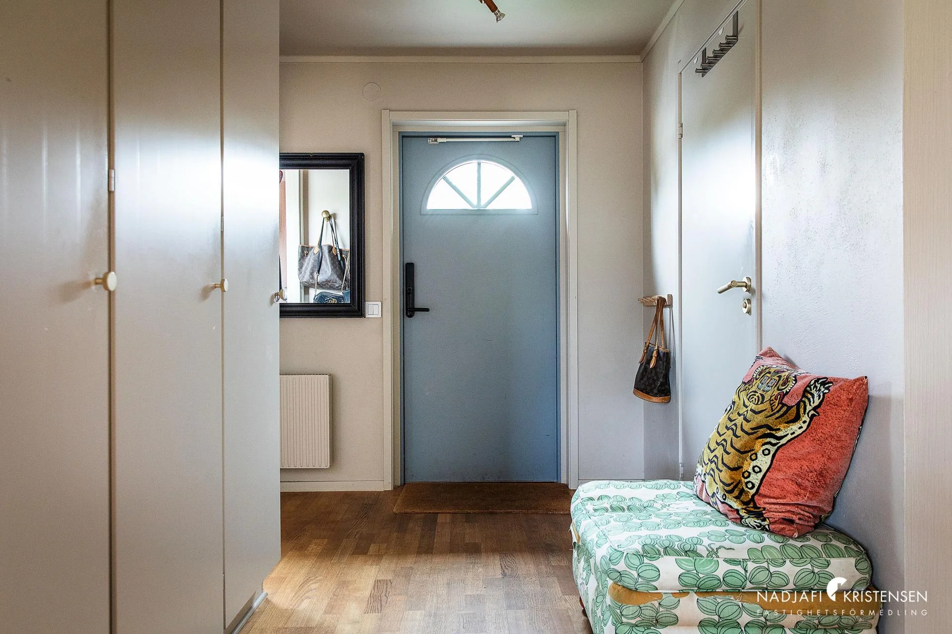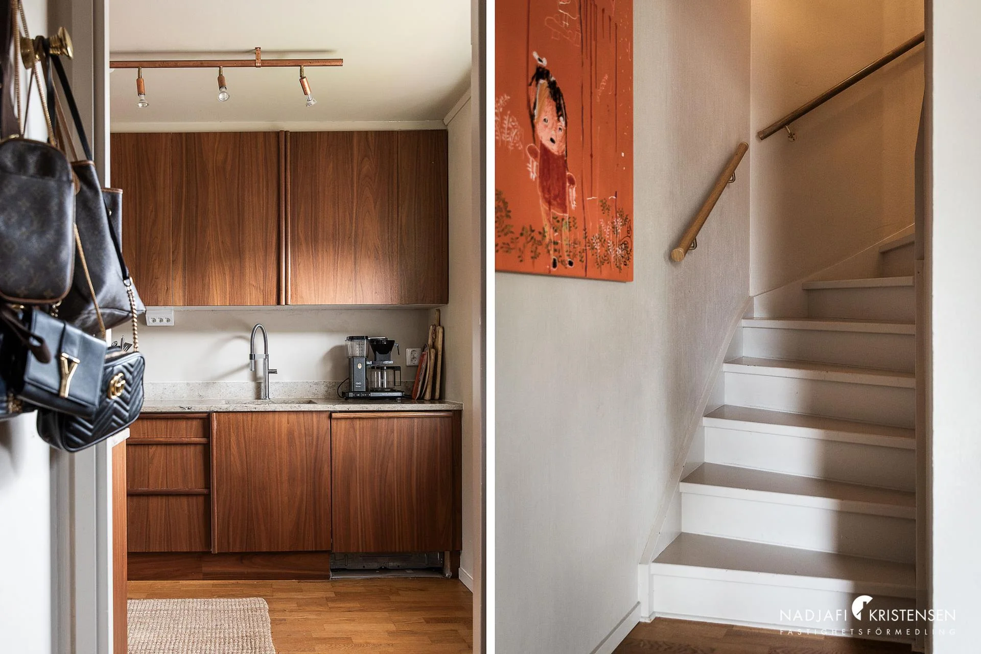 I entrén möts du av en välkomnande hall med garderobsvägg, praktiskt placerad klädkammare finns även under trappan. Till vänster ligger ett nyrenoverat badrum kombinerat med tvättstuga med smakrika detaljer och i varma toner. Från hallen till höger öppnar köket upp som till stora delar renoverades 2022 med integrerade vitvaror. Intill köket finns plats för större matbord och vid sidan om dörren till altanen finns snygg platsbyggd bokhylla som blir en naturlig inredningsdetalj i den ombonade känslan. Altanen är stor och byggd i vinkel med plats för långt matbord, utekök samt plats för ytterligare loungemöbler med gott om sol.