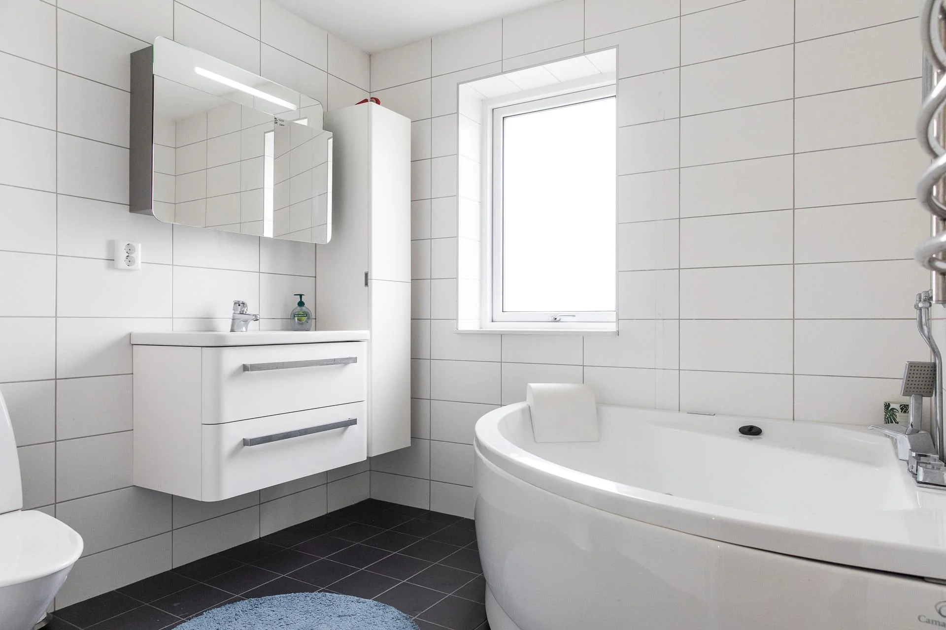 Via en stilren trappa når du ovanvåningen där ett ljust allrum öppnar upp mot vardagsrummet nedanför och får extra ljus från det imponerande fönsterpartiet. Här finner du också tre sovrum med gott om förvaringsutrymmen samt ett badrum med badkar i samma moderna stil som på nedervåningen.