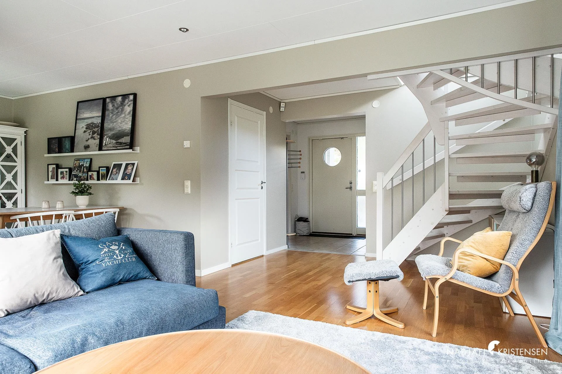 Vid entrén öppnar sig hemmet med ljus från vardagsrummets stora fönsterpartier. I hallen finns plats för klädavhägning och härifrån nås kök, badrum och vardagsrum. Köket, vars ytskikt renoverades 2019, har bra arbetsyta och förvaring samt plats för matbord. Med ingång via köket finns en praktisk tvättstuga. Rymligt vardagsrum i vinkel som erbjuder plats för såväl matrumsmöblemang som soffgrupp. Från vardagsrummet öppnas dörren ut mot trädäck och trädgården.