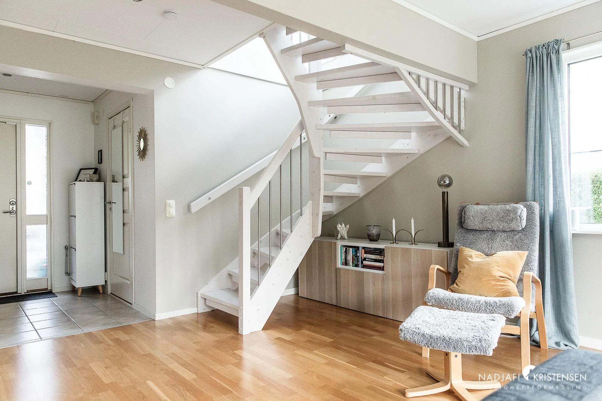 Genomgående trestavsparkett på båda planen, klinkergolv vid entrén och i badrummet på entréplanet samt våtrumsmatta i badrummet på det övre planet.