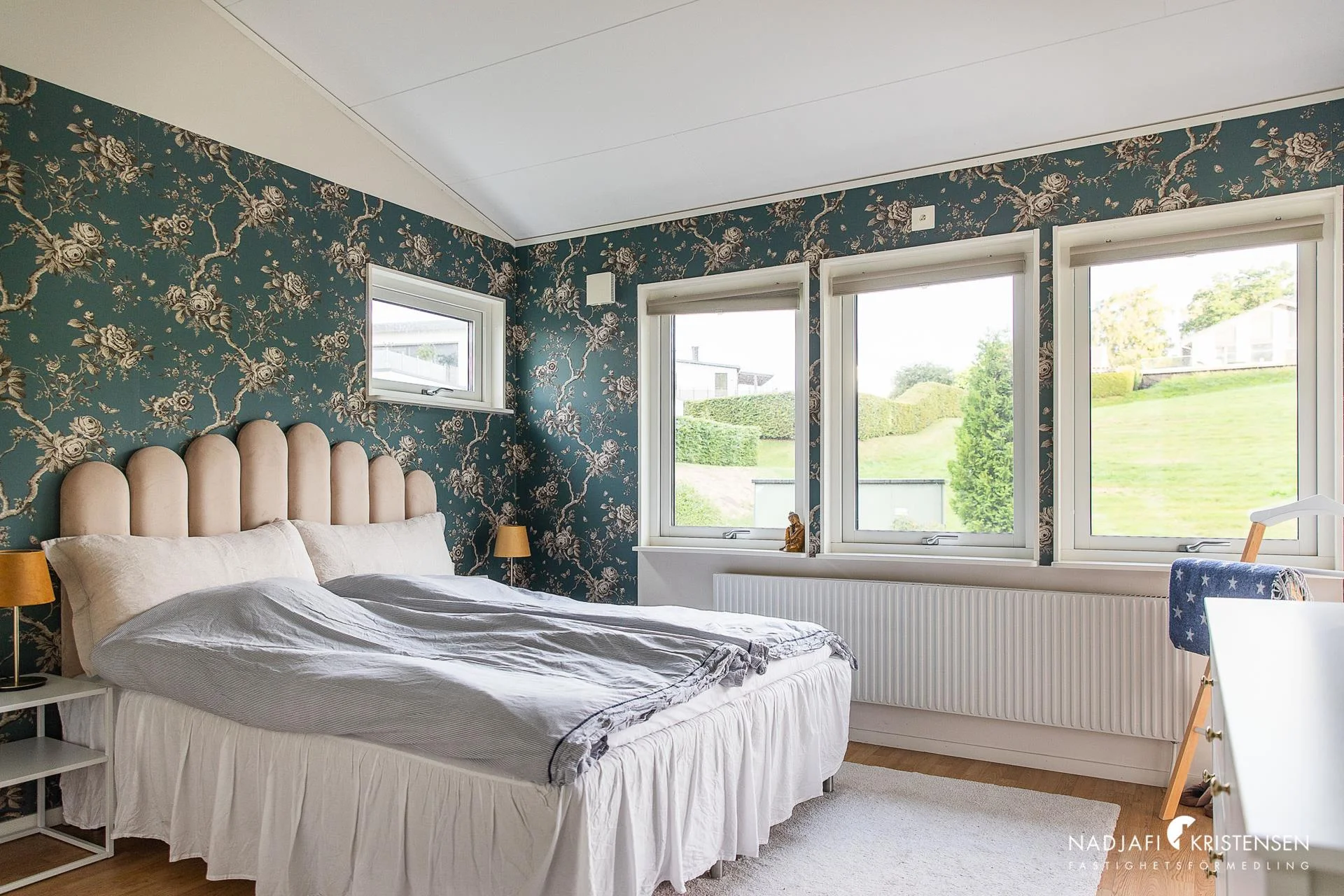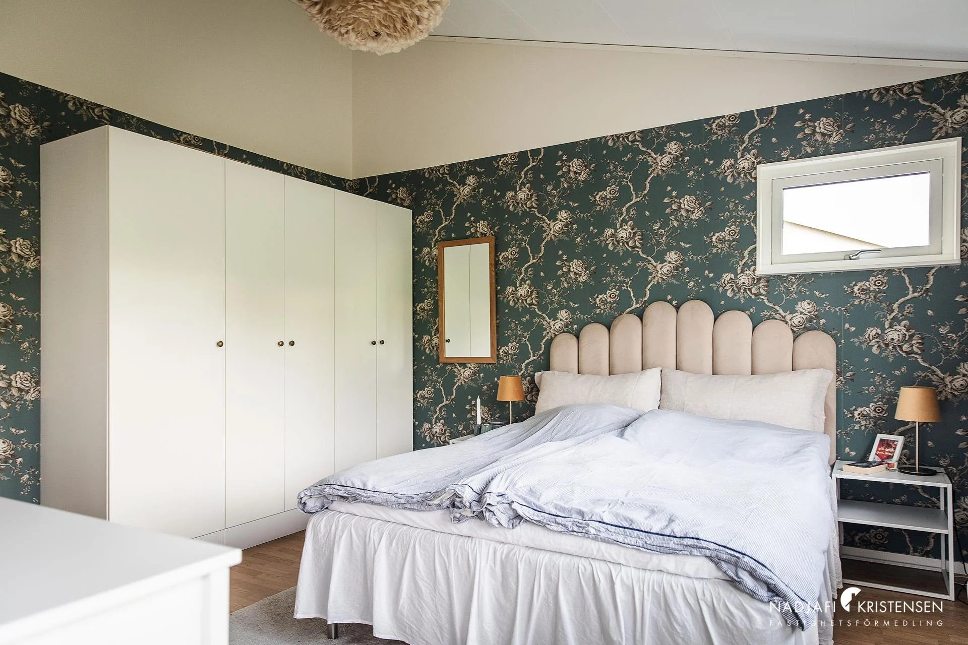Genom trapphallen med fina ljusinsläpp och utsikt mot havet välkomnas man upp till det övre planet som har öppet upp till nock. Här ryms tre sovrum, varav ett med utgång till balkong och ett av sovrummen har ett litet loft. På det övre planet finns även ett stort helkaklat badrum.