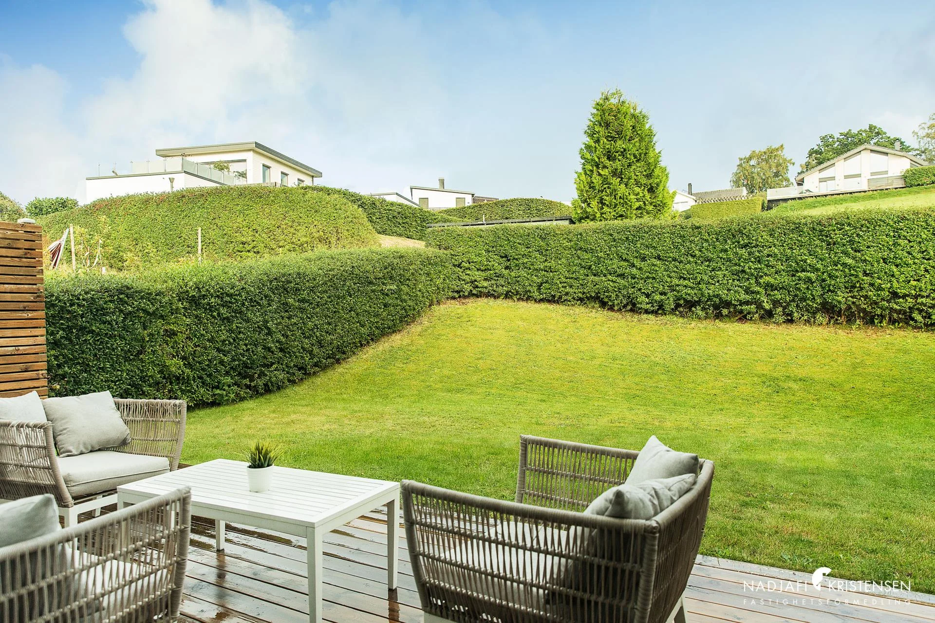 Lättskött trädgård med gräsmatta, trädäck delvis under tak och insynsskyddande häckar. Tomten gränsar mot grönområde och har fin vy mot skogen. På entrésidan finns en liten stensatt uteplats, ett förråd och biluppställningsplats med plats för två bilar samt en laddare för elbil.