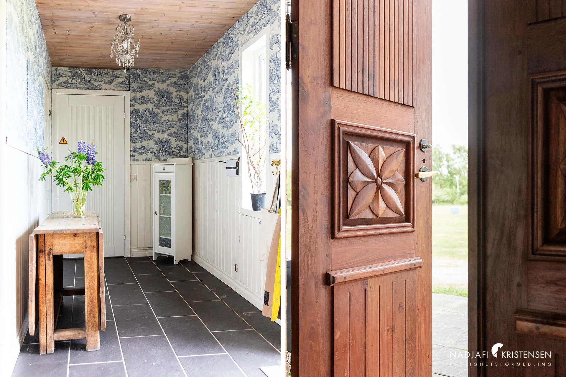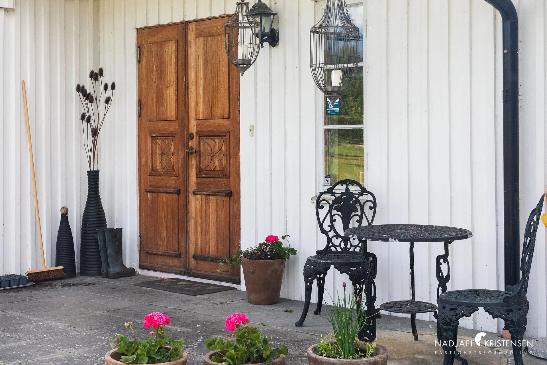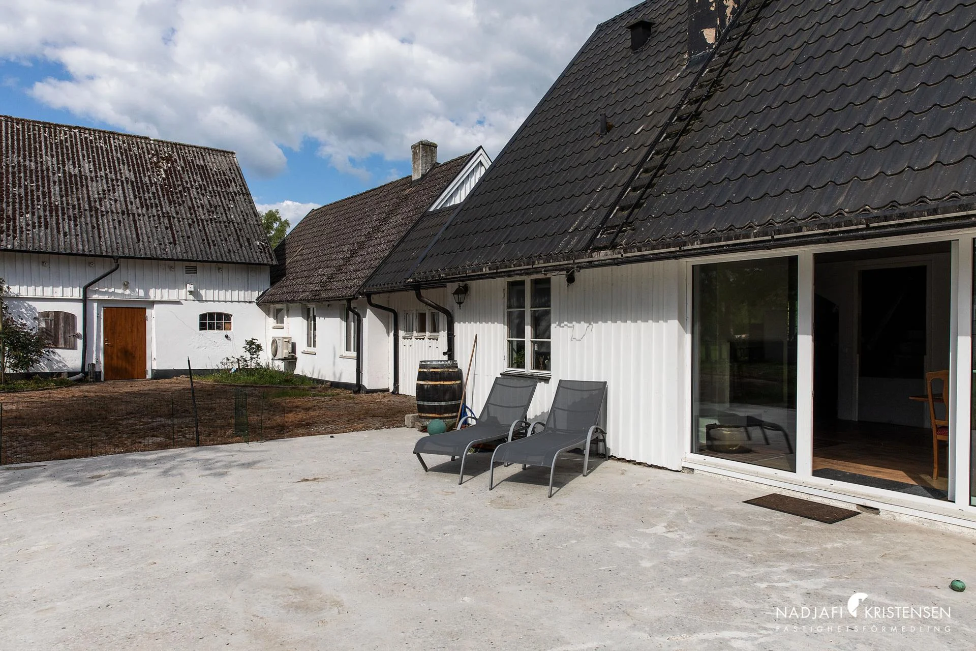 Gården välkomnar dig med en inbjudande grusväg och vacker vy över hagar och byggnader. Boningshuset tillsammans med stall och garage omsluter en mysig innergård med stenläggning, gjuten altan och blomstrande körsbärsträd om våren – en lugn oas där du kan njuta av årstidernas växlingar.