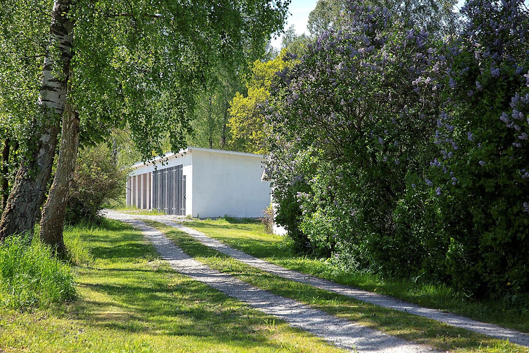 Vid infarten till gården finns en byggnad om ca 180 kvm med gjuten platta fördelad på fyra carportar samt fyra garage med dubbla portar – perfekt för olika typer av maskiner och fordon.